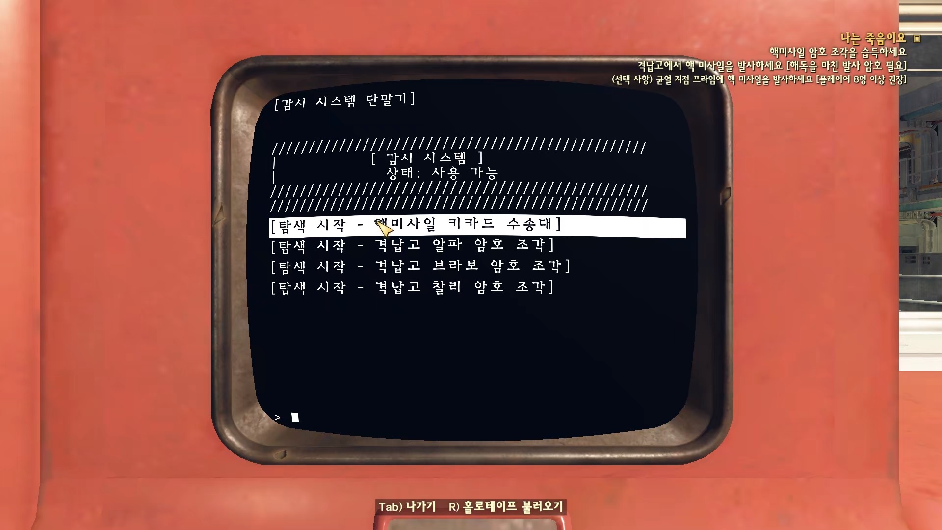 발사를 위해서는 암호 조각 8개를 구해야 되고 해독을 해야 된다. 해독 과정이 있긴 하지만 골치 아프니 핵발사 코드 확인 사이트에 가서 확인하자.