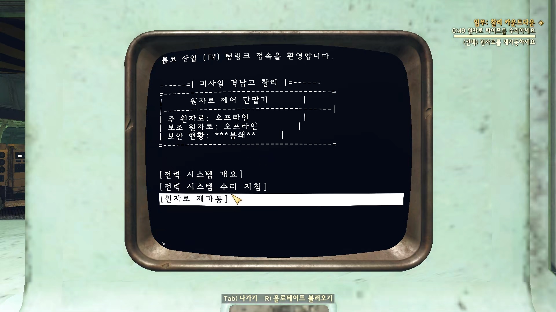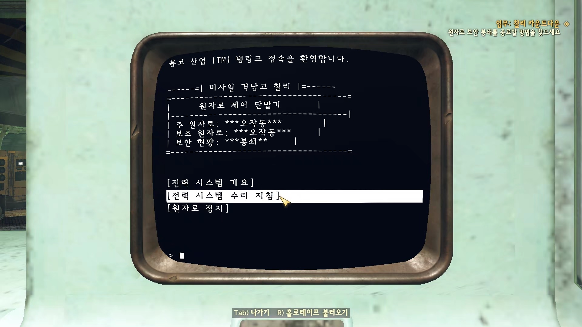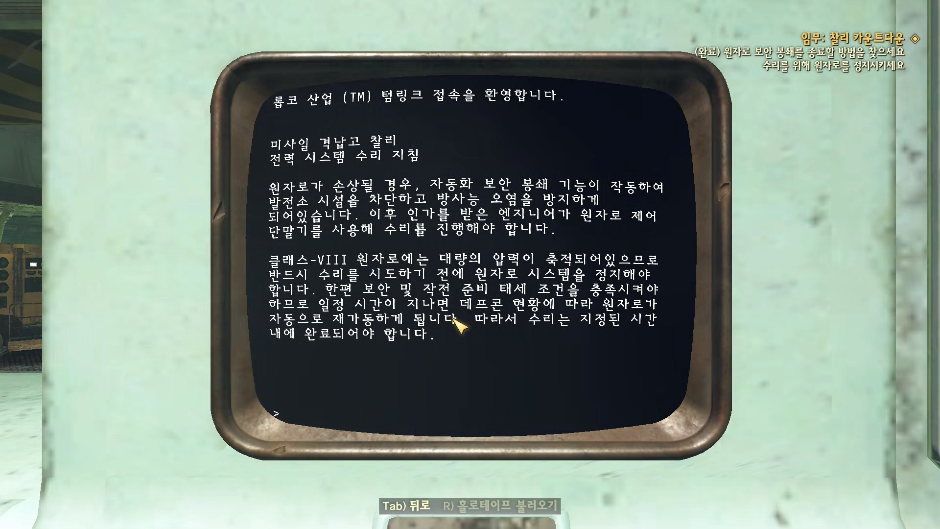 원자로 제어 단말기로 가서 수리 지침을 읽고 원자로를 중단 한다.