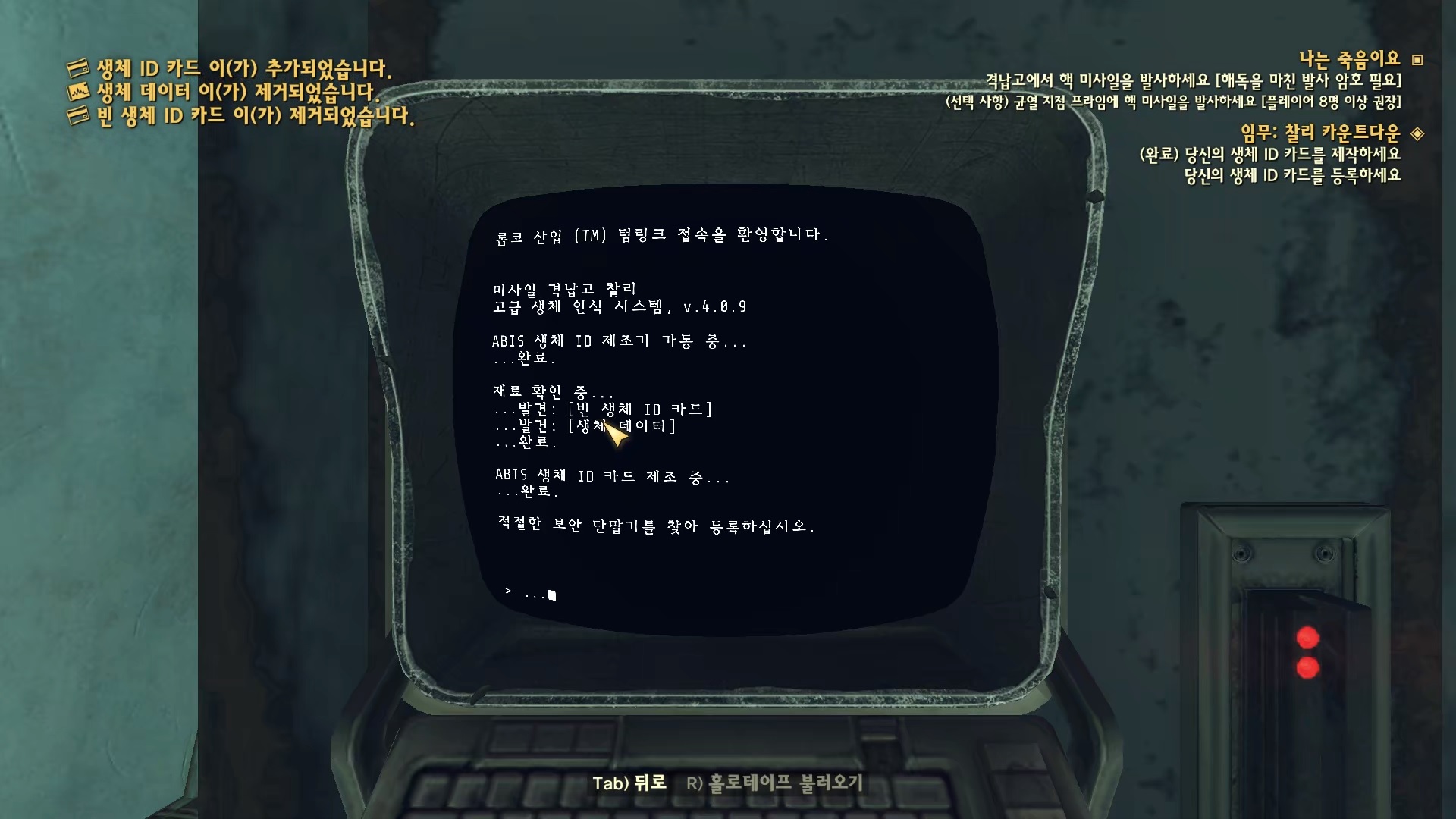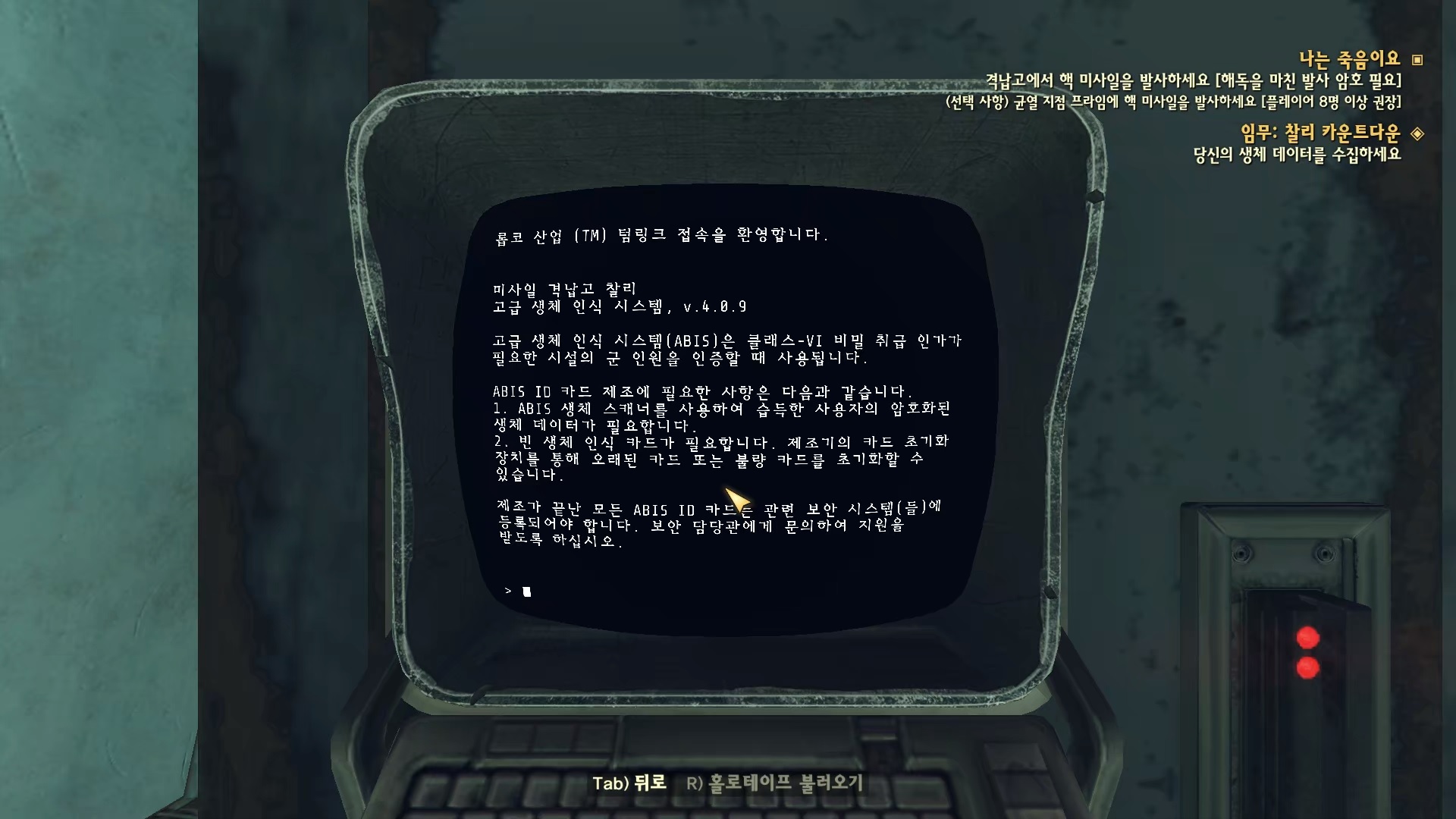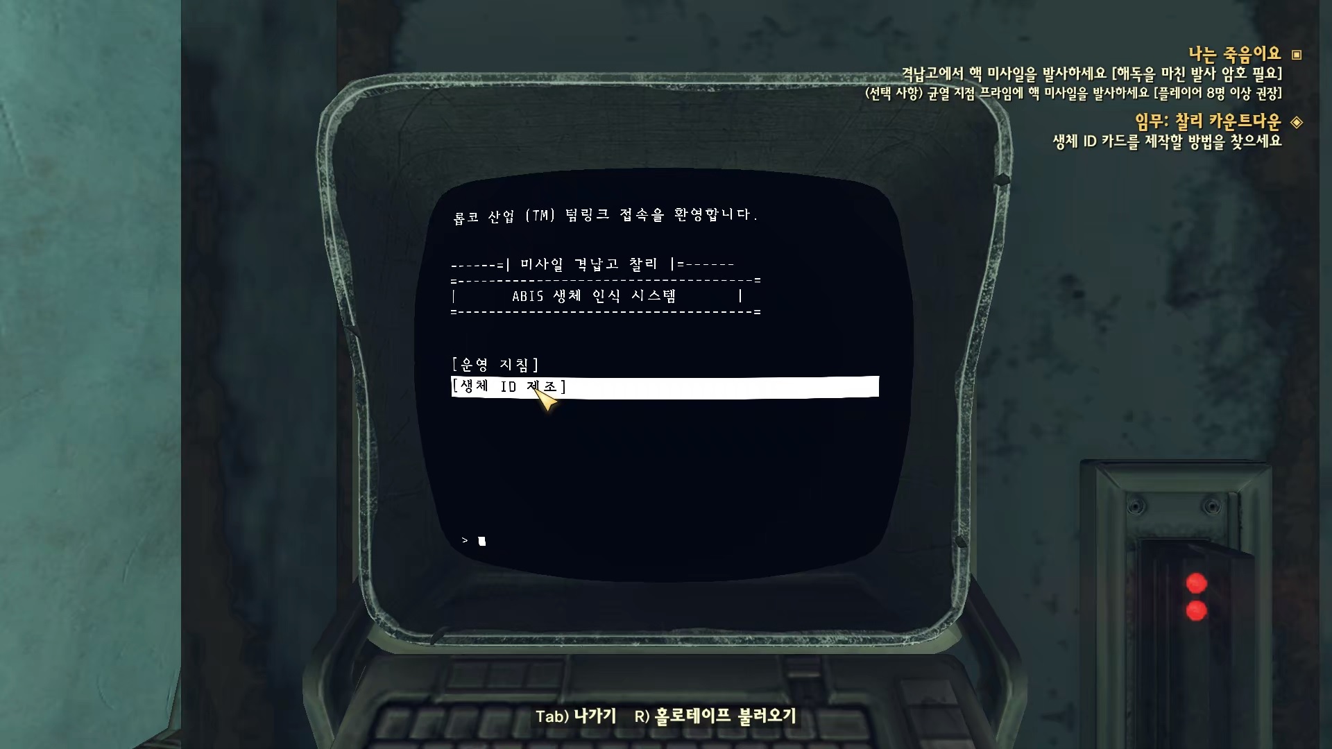 보안 시설 단말기에 접속해 '보안 프로토콜 - 보안 시설 알파'를 선택하면 생체 ID 카드를 만들 방법을 찾으라고 한다.