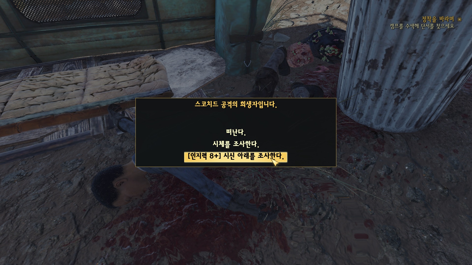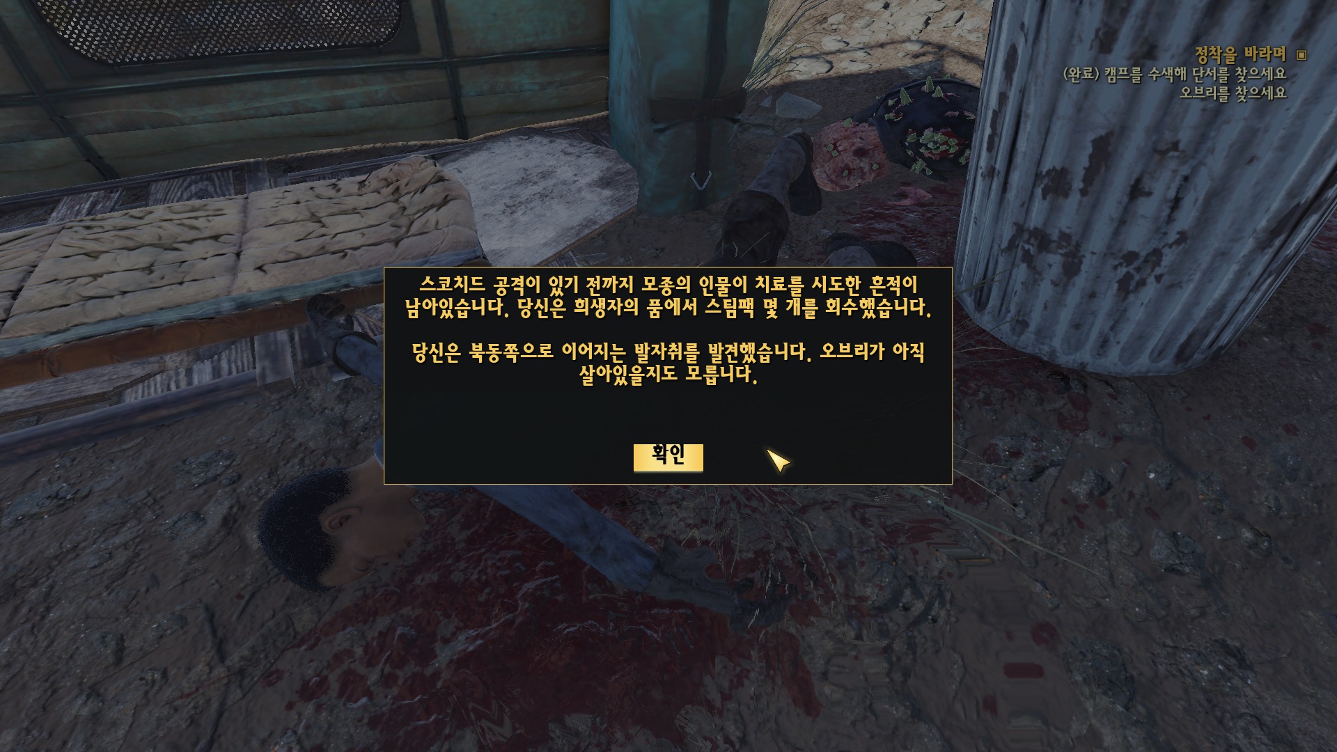 오브리의 관측 캠프로 가면 이미 스코치드에게 절단이 나 있는 상황.