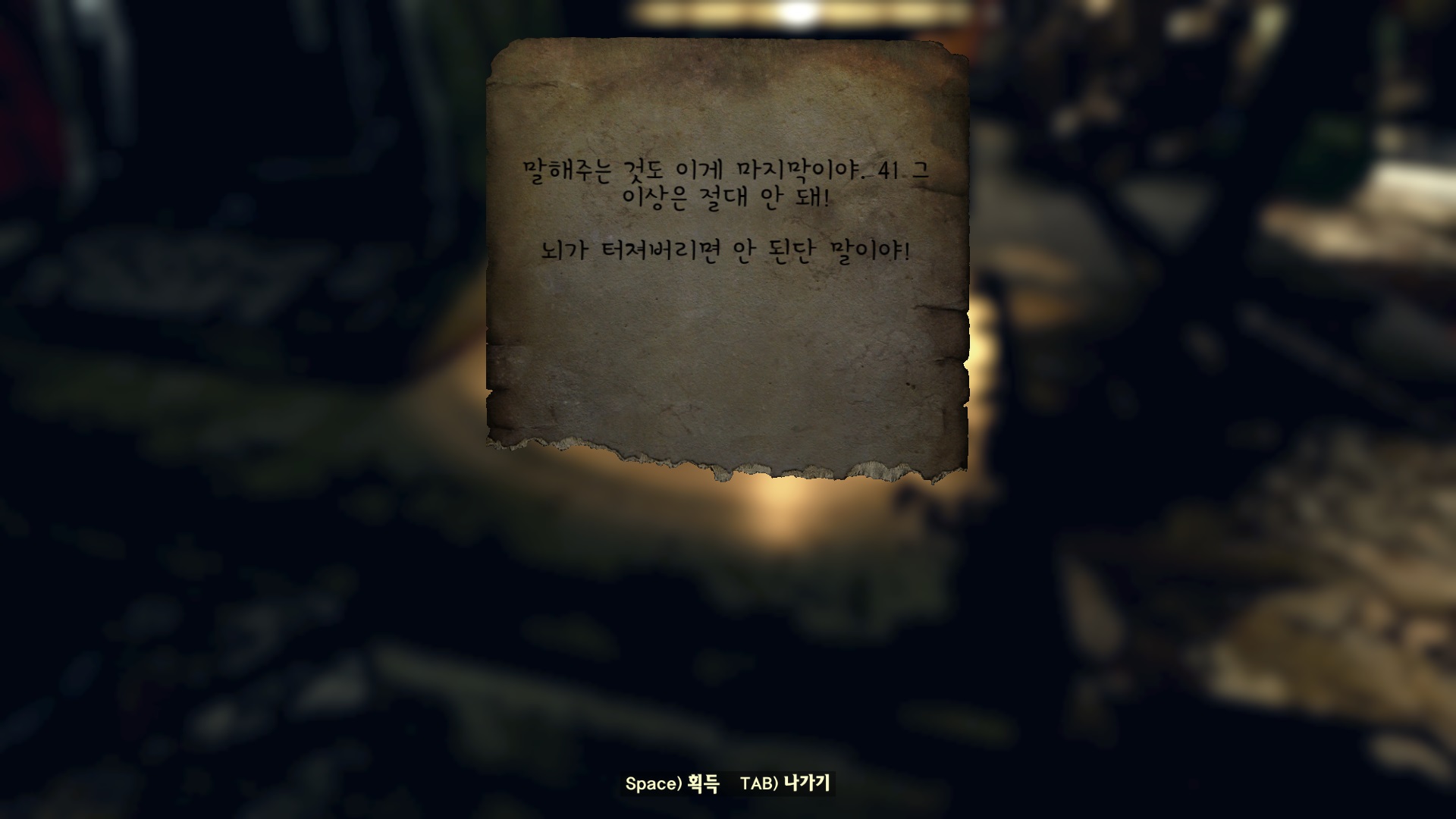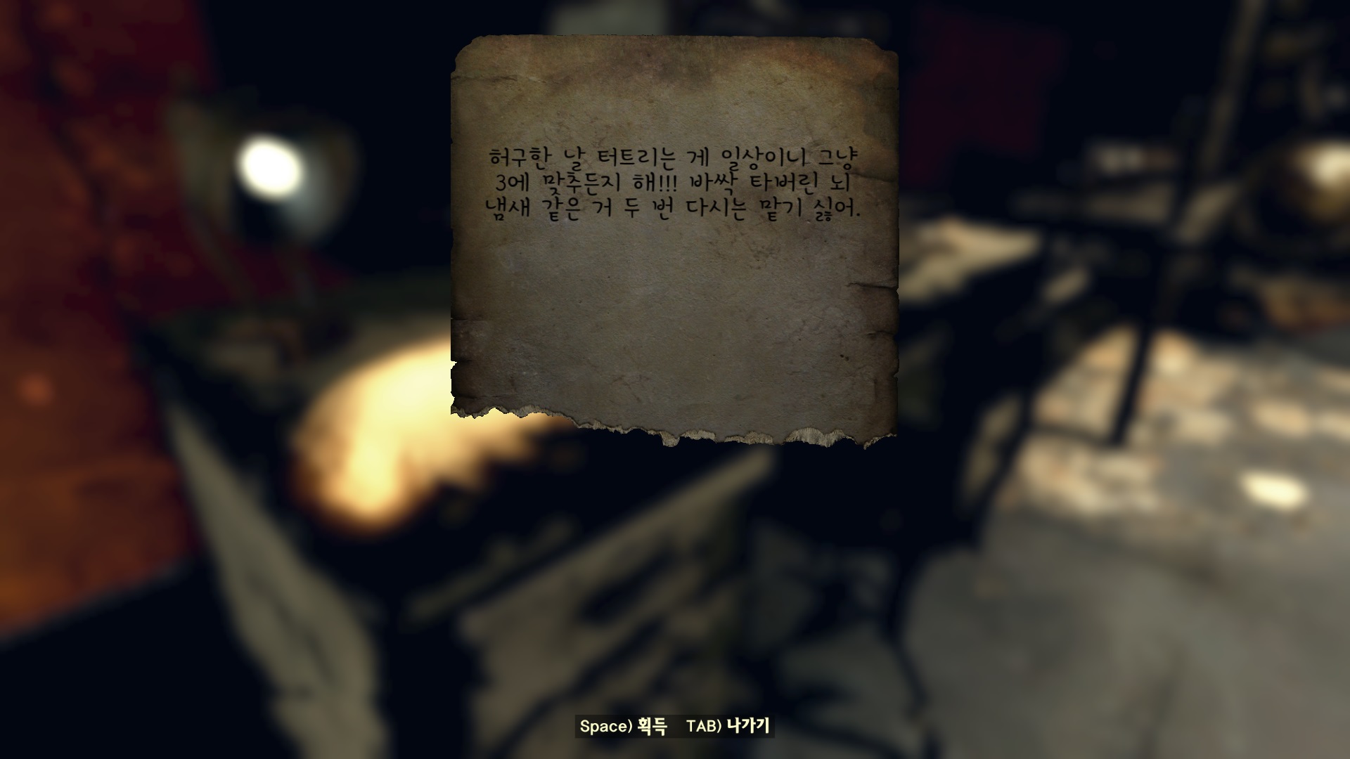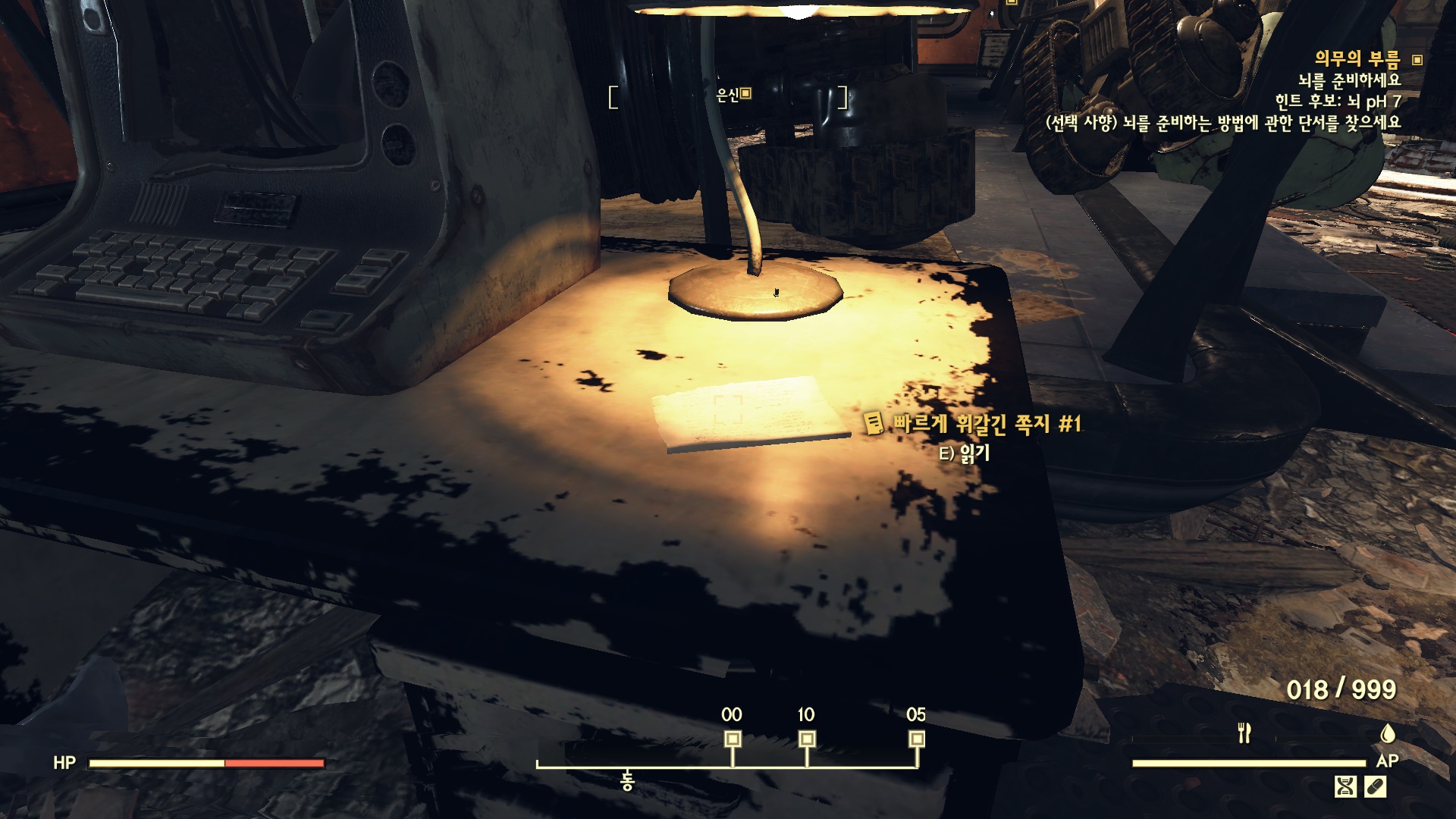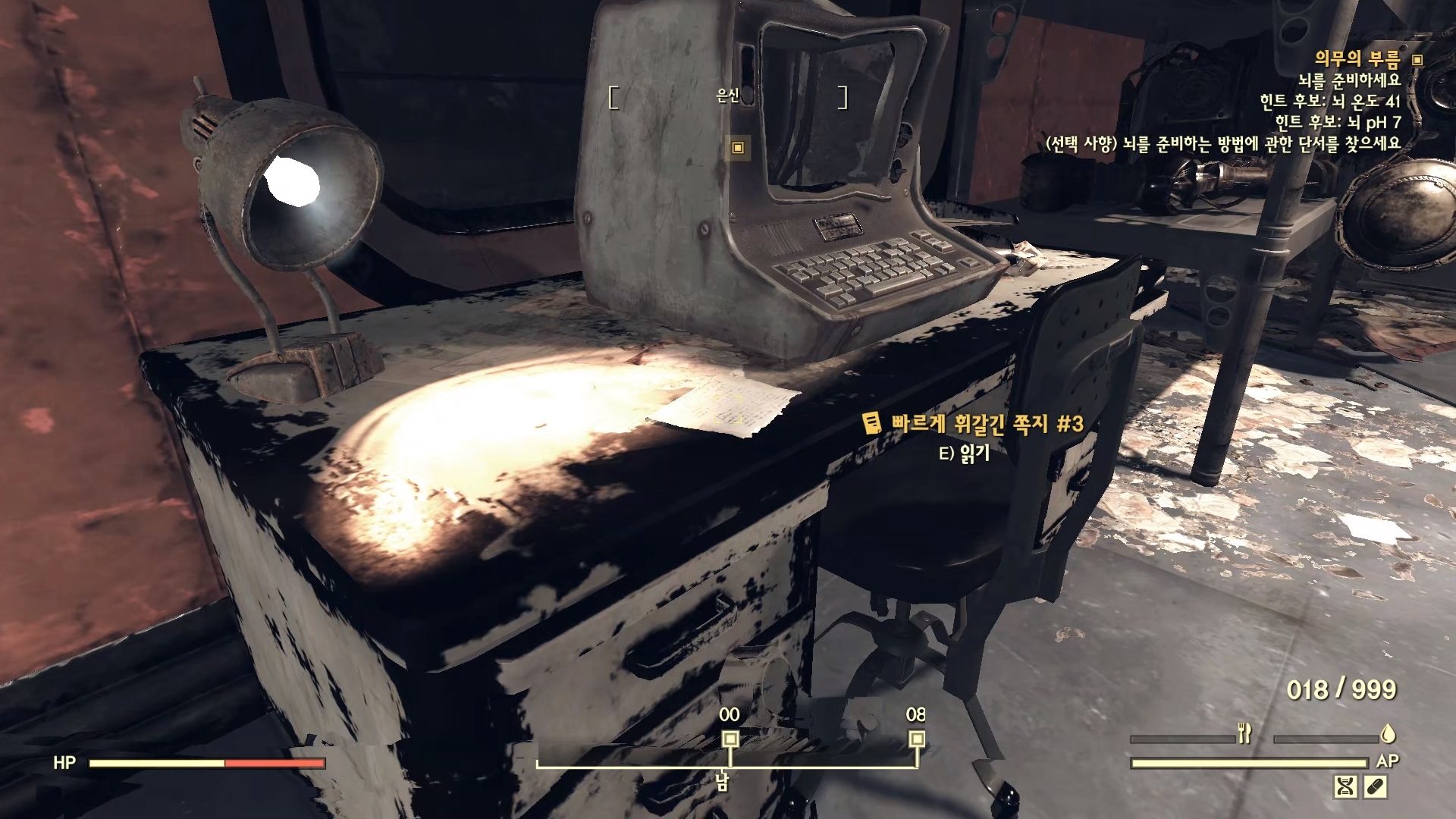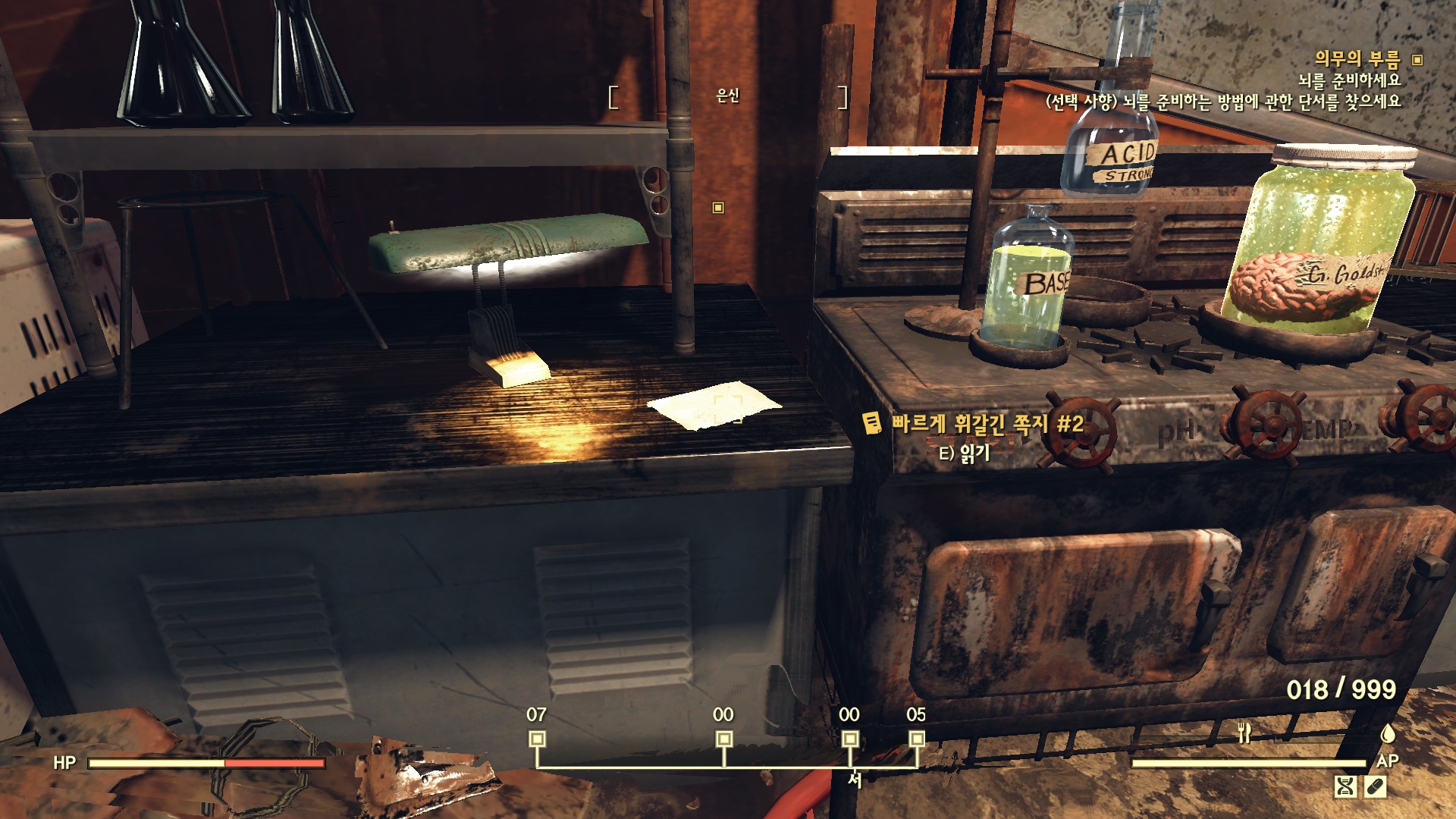 Robobrain Assembly로 가면 조리대처럼 생긴 뭔가가 있다. 그렉의 뇌를 일단 여기다가 넣자. 이어서 생생한 뇌를 준비해야 하는데 뭔가 조작이 필요하다. 주변을 살펴보면 '빠르게 휘갈긴 쪽지'가 3개 있다. 이걸 찾아야 정확한 조정값을 알 수 있다.