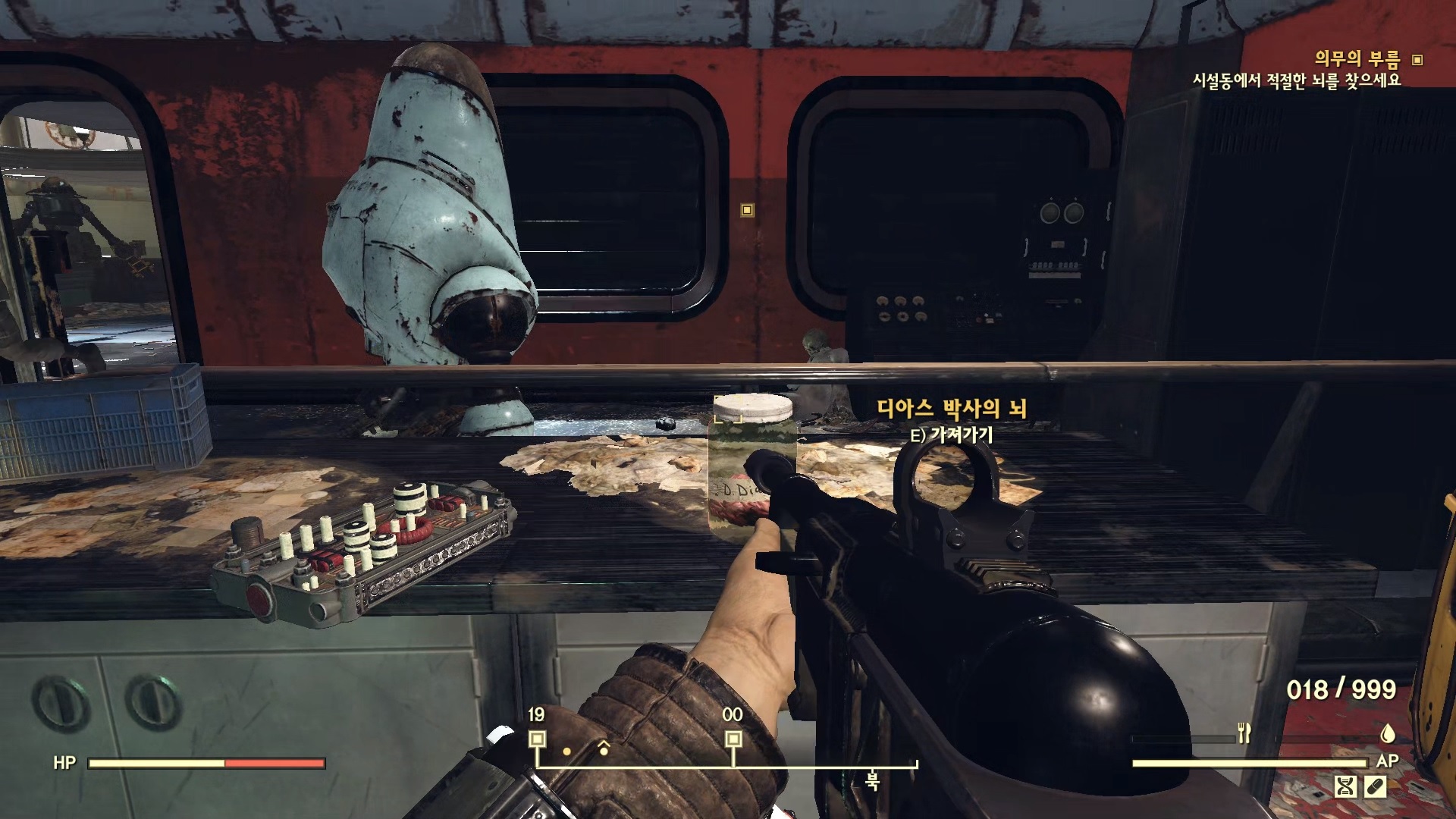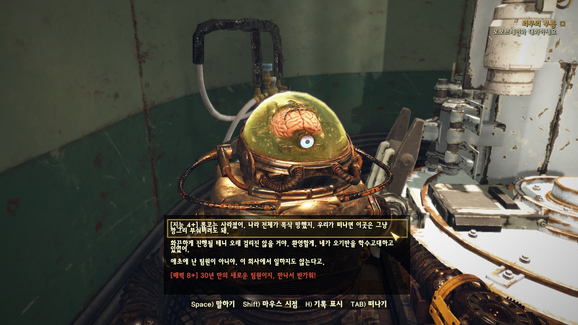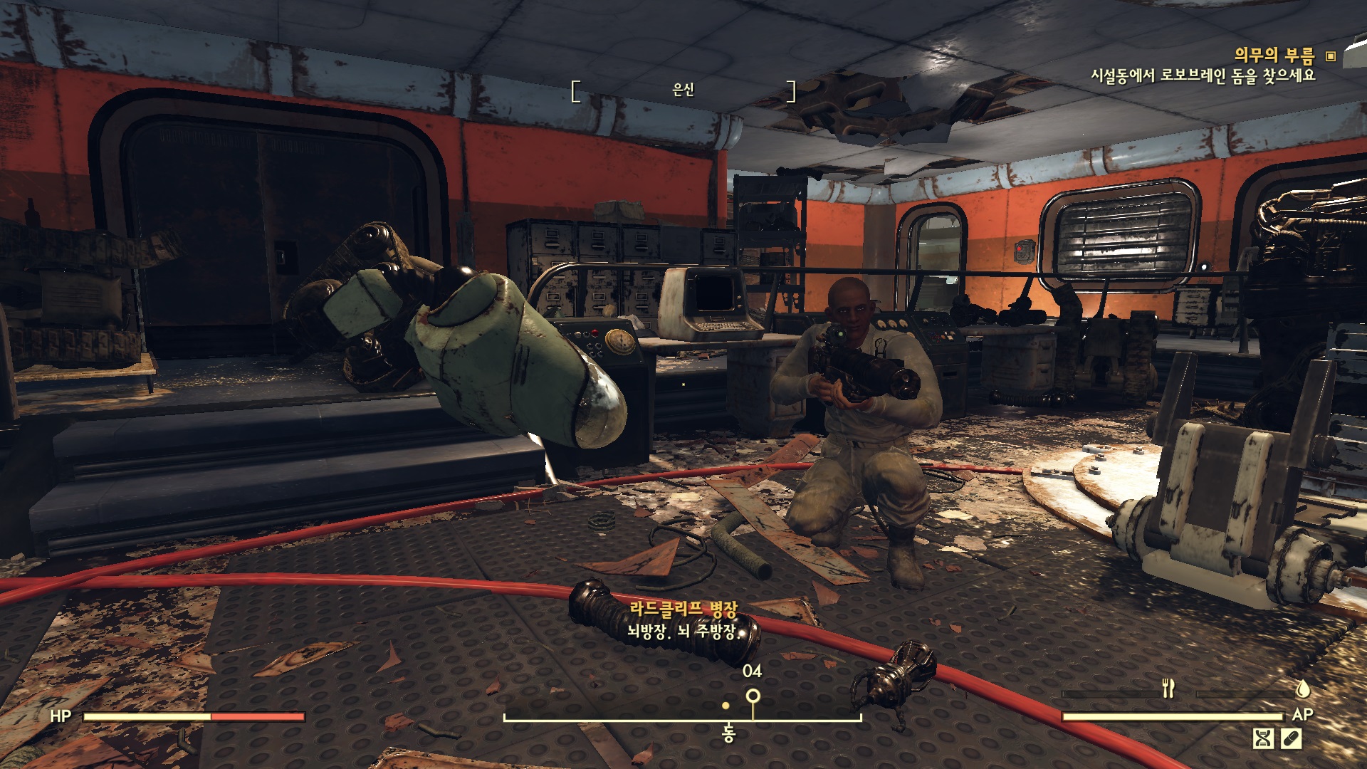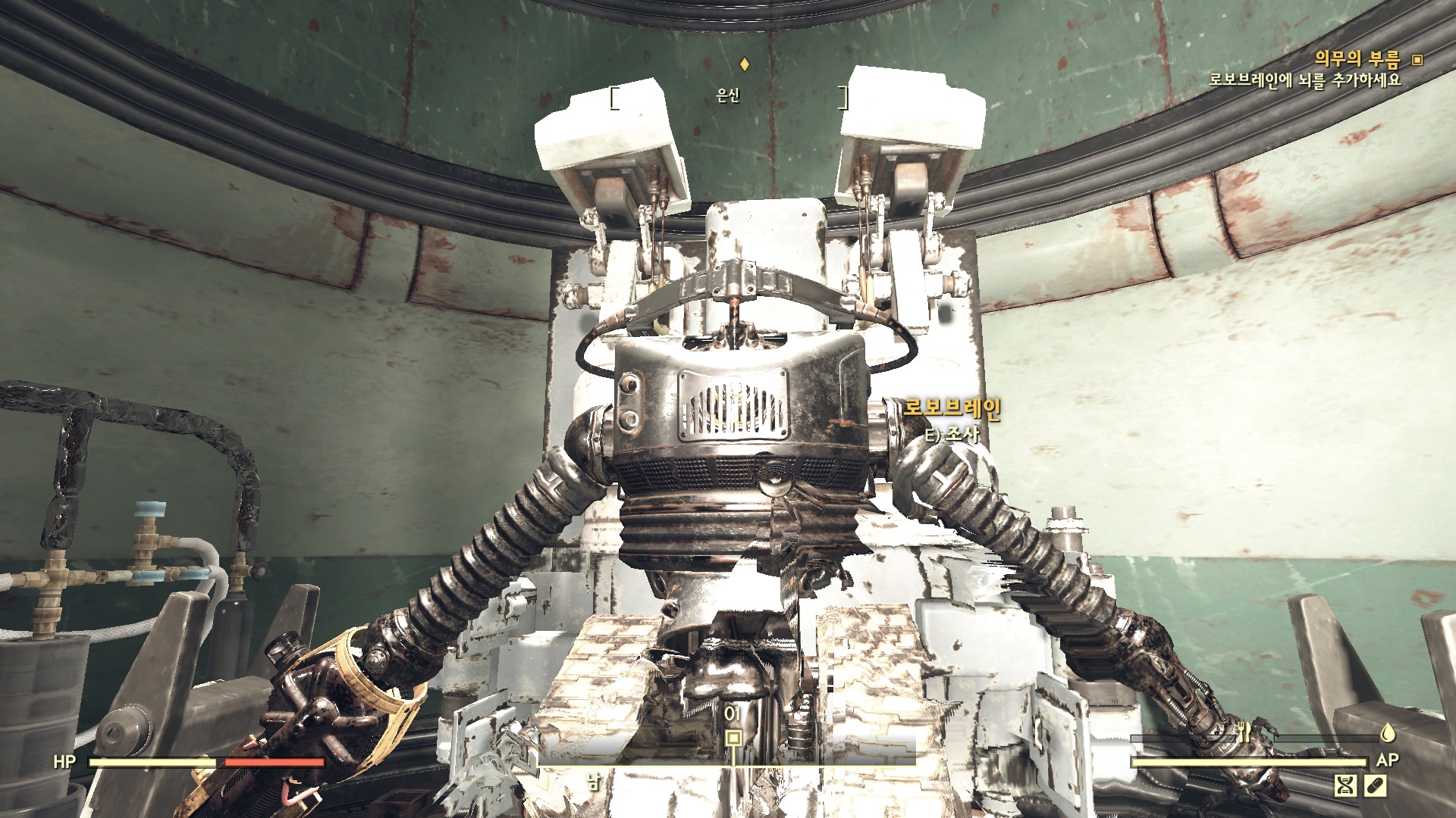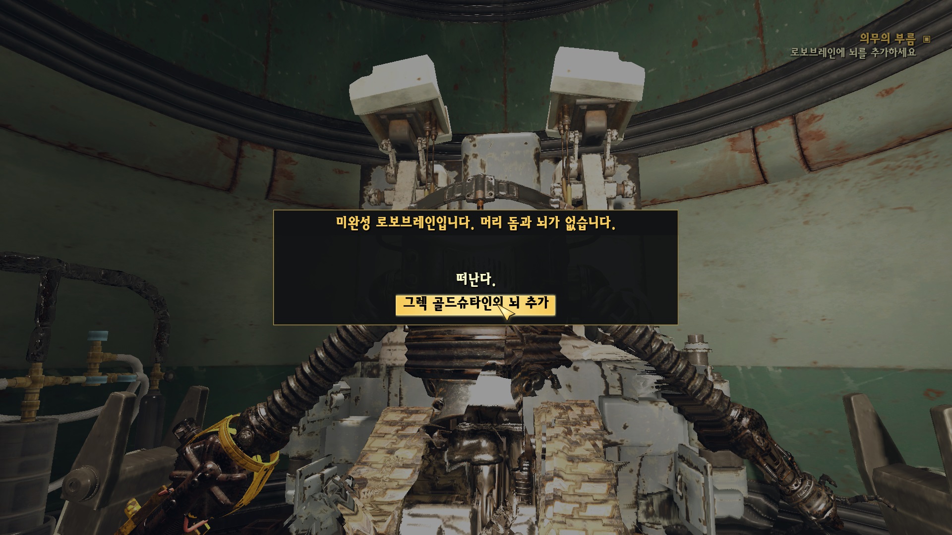 방을 나와서 바로 오른쪽의 문을 열고 들어가면 뇌가 없는 로보브레인이 있다. 여기에 뇌를 장착한다.
