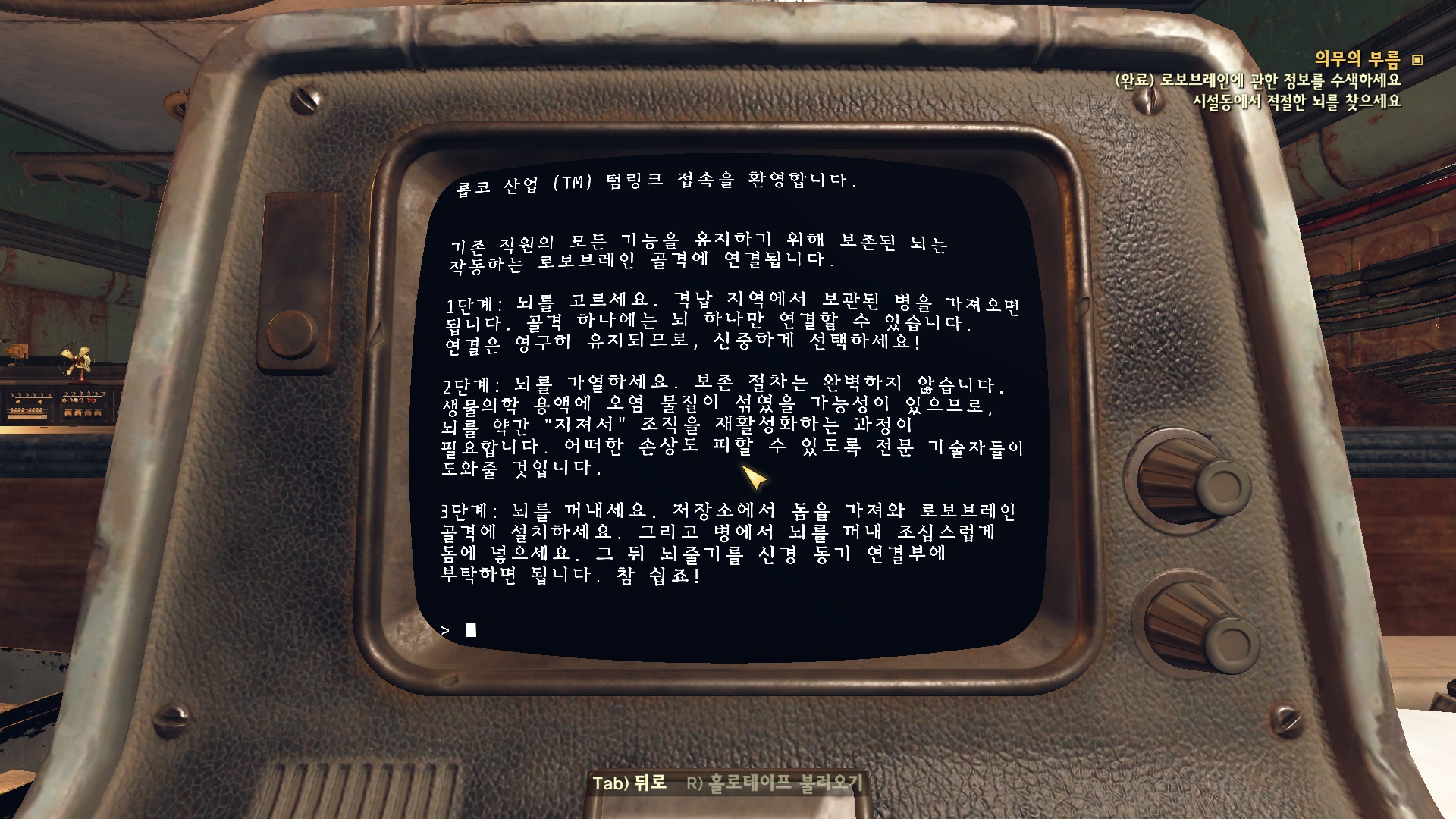 안에 단말기가 있는데 접속 해서 "좋은 소식입니다! 여로분 => 뇌 교체 절차"를 선택한다.