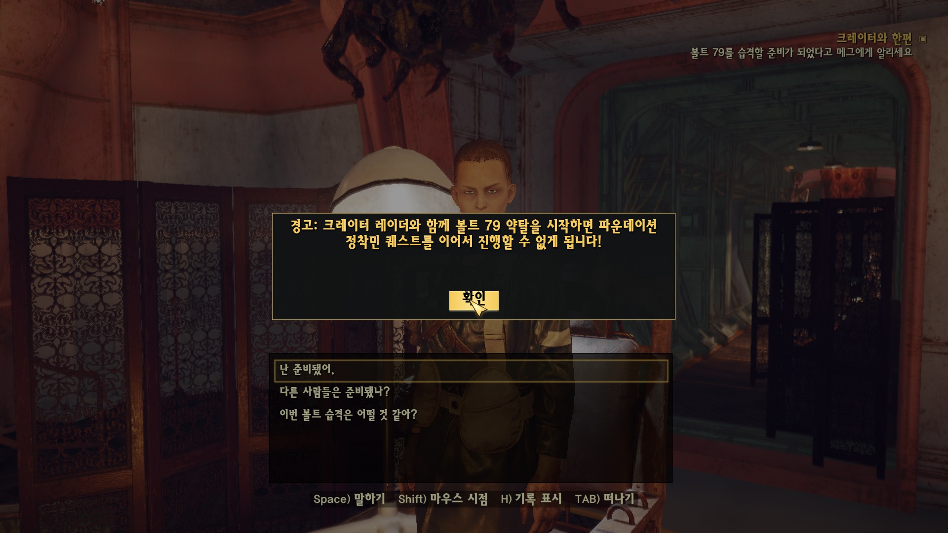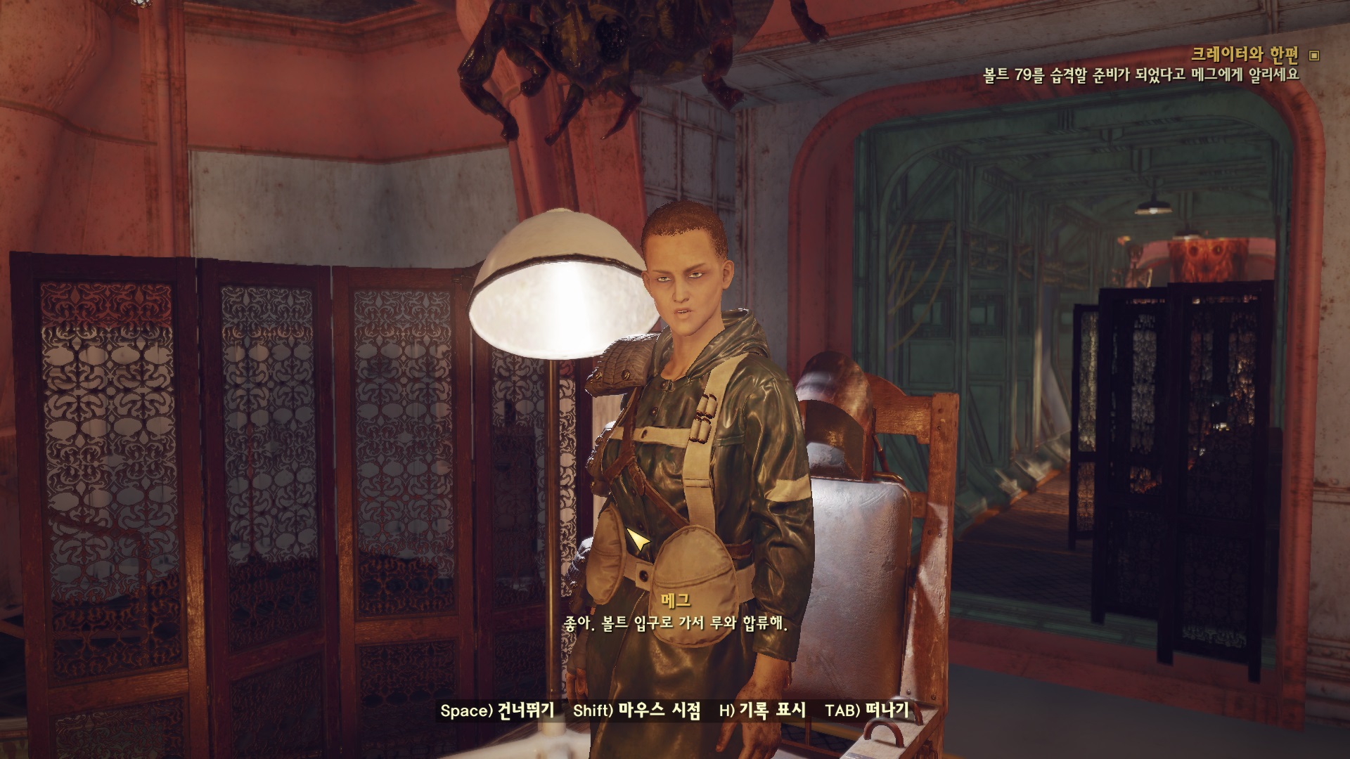 '크레이터와 한편 (Siding with Crater)' 퀘스트는 메그와 대화해서 준비 됐다고만 하면 된다. 이때 크레이터의 레이더와 볼트 79 약탈을 하게 되고 파운데이션의 퀘스트는 더이상 진행을 못 한다.
