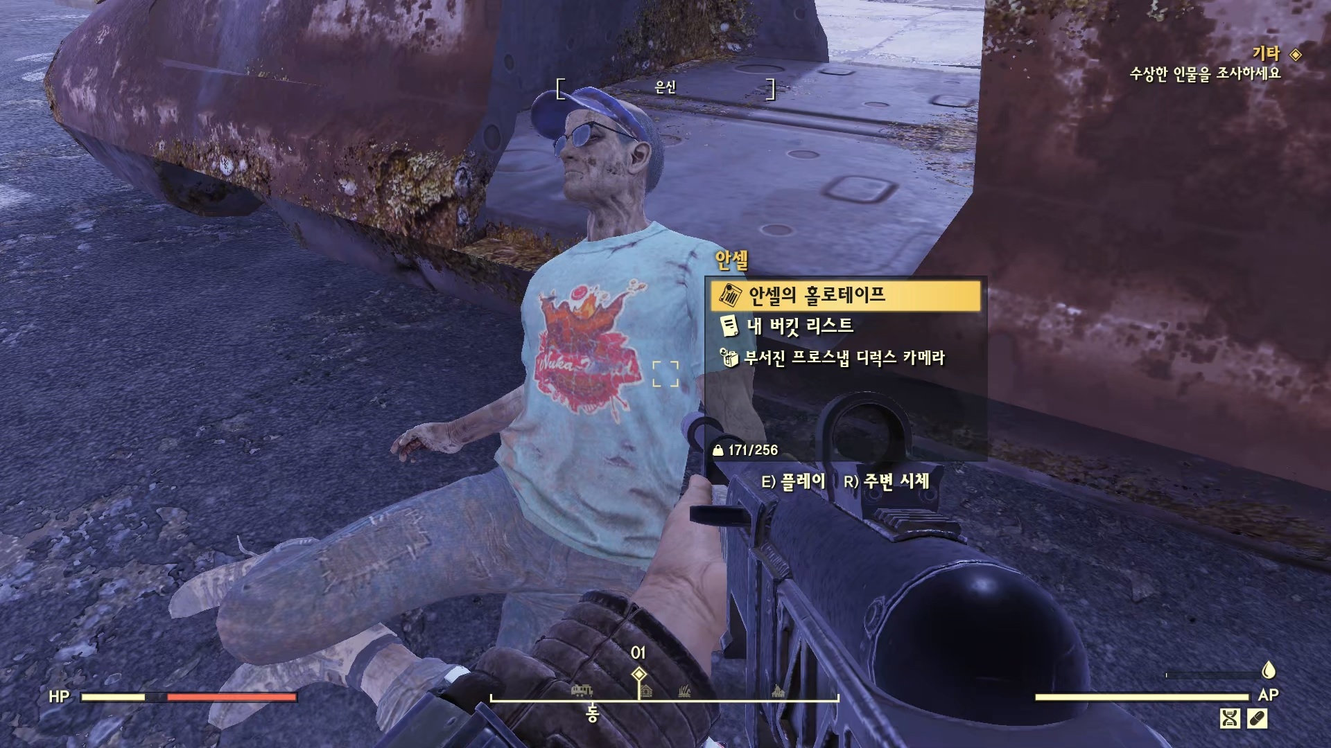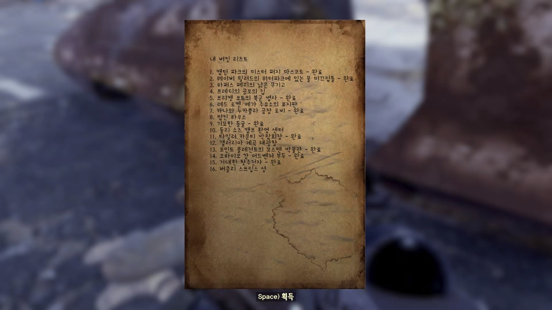 안셀의 시체가 있고 홀로테이프, 버킷 리스트 메모를 얻게 된다. 메모에 보면 완료가 안된 것들이 있는데 여기에 가서 사진을 찍어야 한다. 가야 할 곳은 총 7군데.