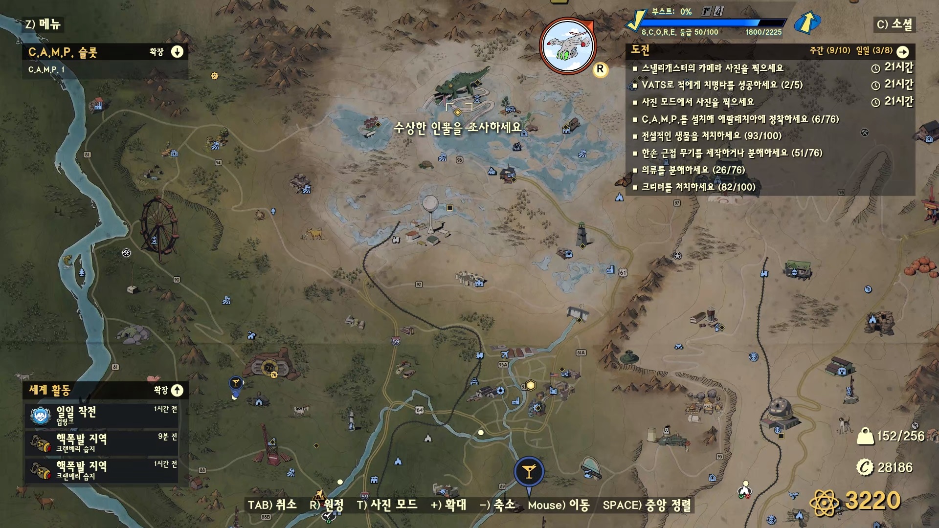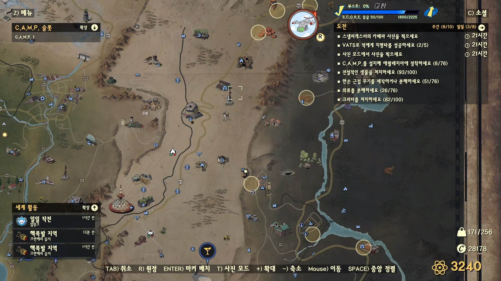 가야 할 곳 7 군데를 표시를 해준다. 사진을 찍을때 주의할 점은 카메라를 쥐고 우클릭(조준)을 하면 카메라 화면이 나오는데 우측 위에 보면 찍히는 대상 이름이 나온 상태에서 찍어야 제대로 찍힌다. 앞으로 카메라 찍는 일일 도전 과제가 나올때도 잘 확인하고 찍도록 하자.