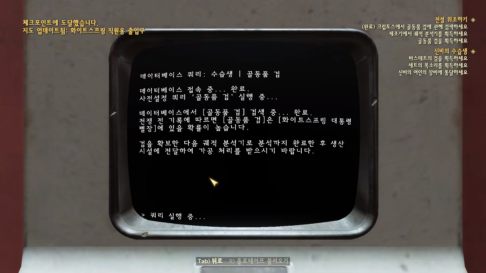 크립토스 단말기에 접속해서 '미확인 사용자 => 데이터베이스 쿼리 => 수습생 골동품 검'을 선택하면 화이트스프링 대통령 별장에 있을거라고 한다.