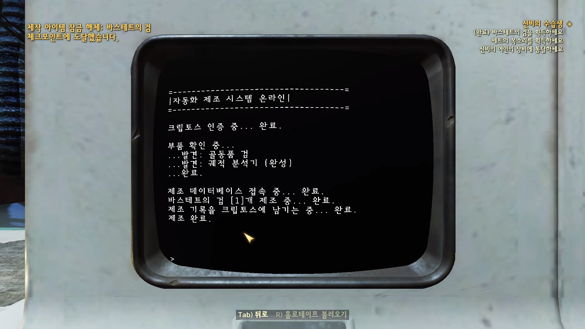 리버사이드 저택으로 돌아가 제조 단말기에서 '제조 서비스 => 수습생 | 바스테트의 검'을 선택하면 만들어지고 퀘스트는 완료된다.