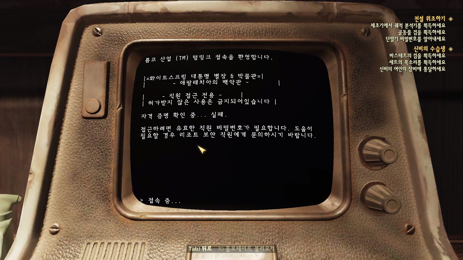 진열함 옆에 보면 대통령 별장 & 박물관 단말기가 있다. 접속 해서 '직원 접근'을 선택하면 자격 증명 확인 실패라고 뜬다. 단말기 비밀번호를 알아내야 한다.