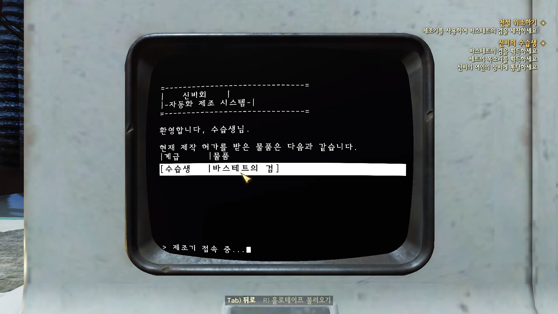 그러면 '신비회 - 바스테트의 검' 홀로테이프를 준다. 이제 검을 벼려내러 가야되는데 베이스가 될 검은 역사적인 중요성이 담긴 검이어야 한다.