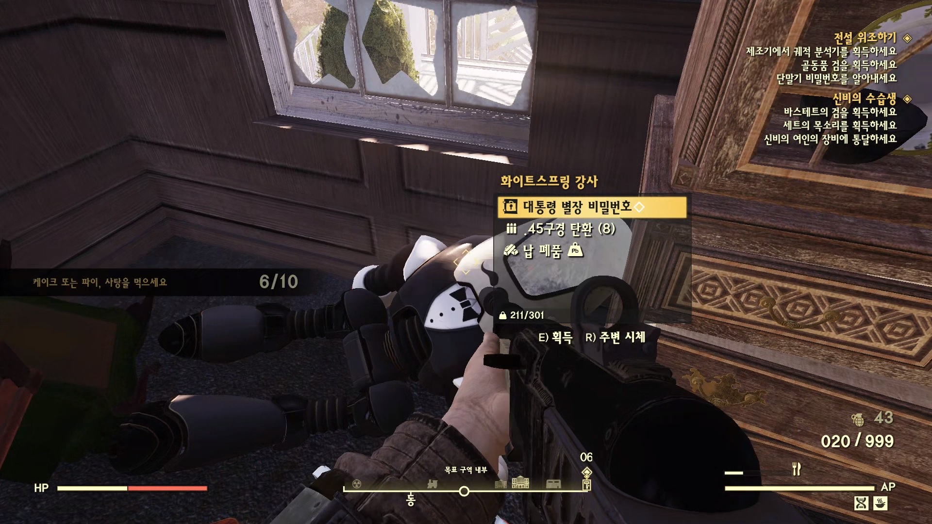 피아노 옆에 보면 화이트스프링 강사 프로텍트론에게서 '대통령 별장 비밀번호'를 입수 할 수 있다. 2층 오른쪽 샤워실에도 하나 있다.