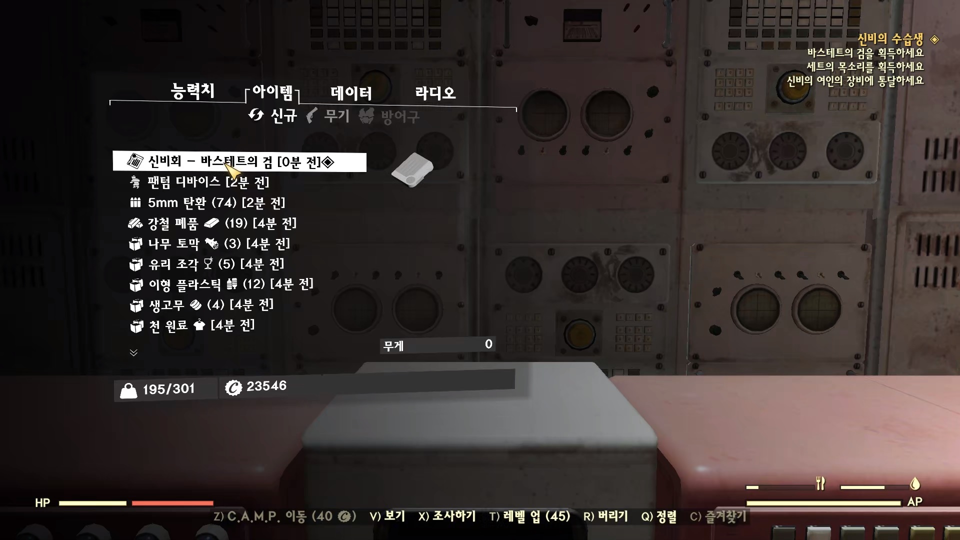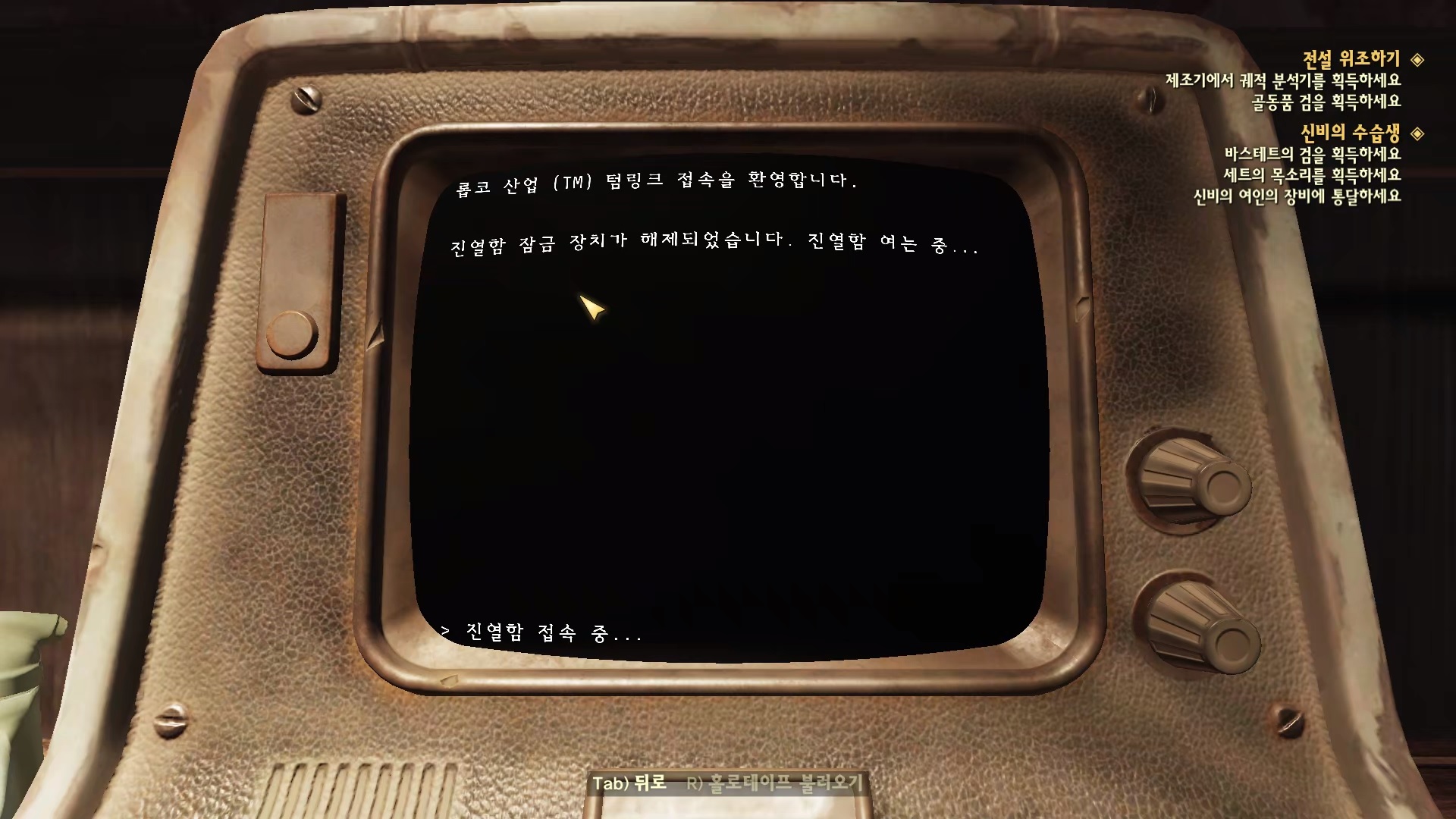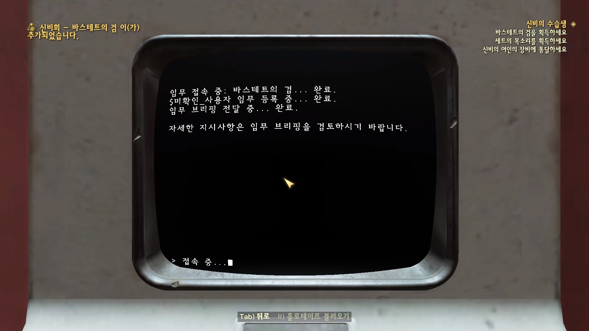 크립토스 단말기에 접속해 '미확인 사용자 => 임무판 => 수습생 | 바스테트의 검'을 선택한다.