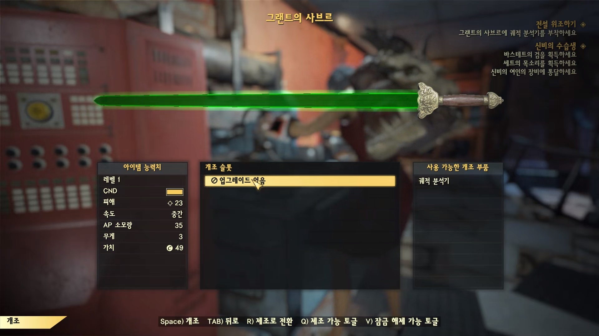 무기 작업대에 가서 개조를 선택해서 그랜트의 사브르에 궤적 분석기를 달자.