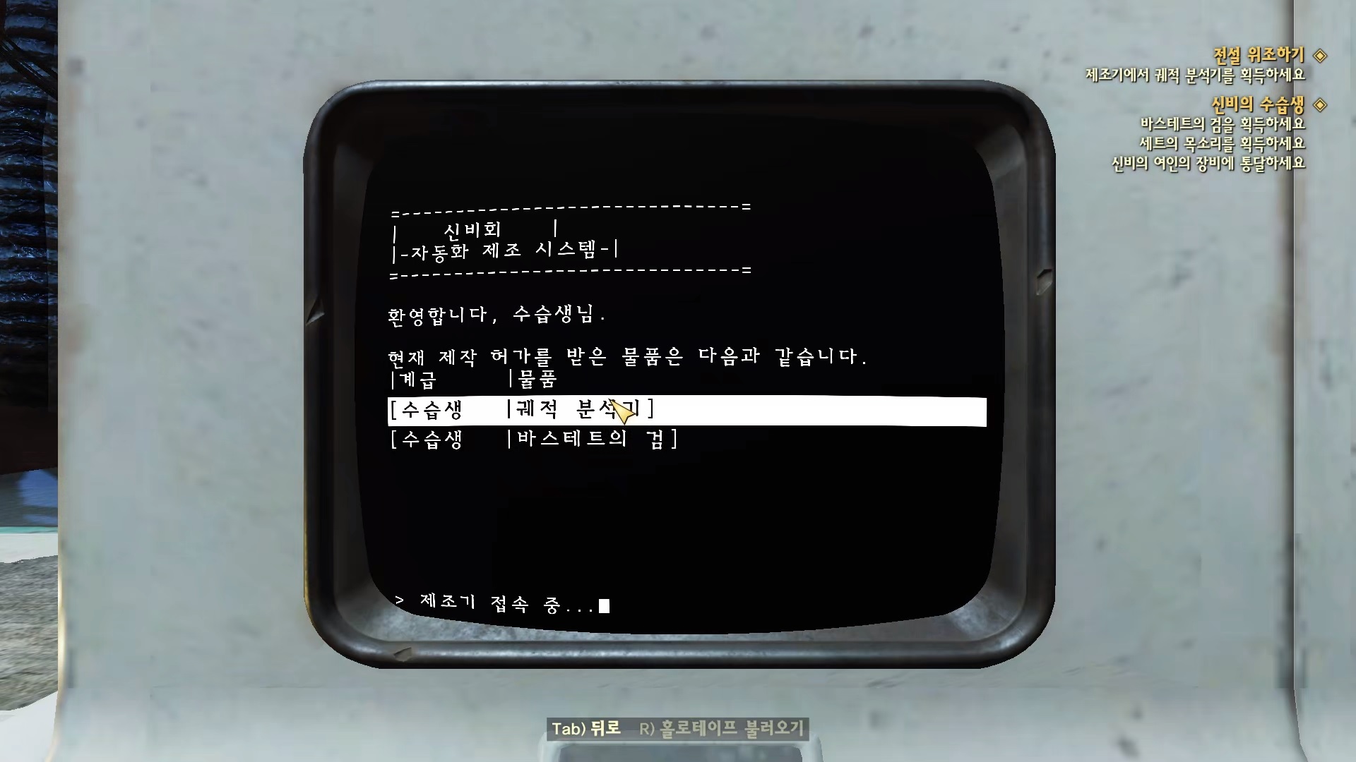 리버사이드 저택으로 돌아가서 제조 단말기에서 '제조 서비스 => 수습생 | 퀘적 분석기'를 제조한다.