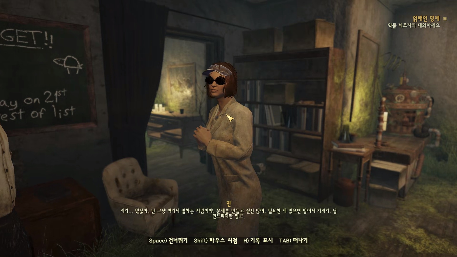 빈과 대화 후 약물 제조자 진과 대화하자. 진은 패밀에게 약물을 제작해서 보급하는 일을 담당하고 있다. 악마의 피 중독제에 대해서 물어보면 기밀이라고 한다. 힘 8+면 협박을 해서 물어 볼 수 있는데 여기 재료로는 만들기가 불가능하단다.