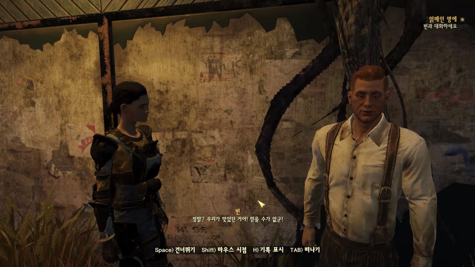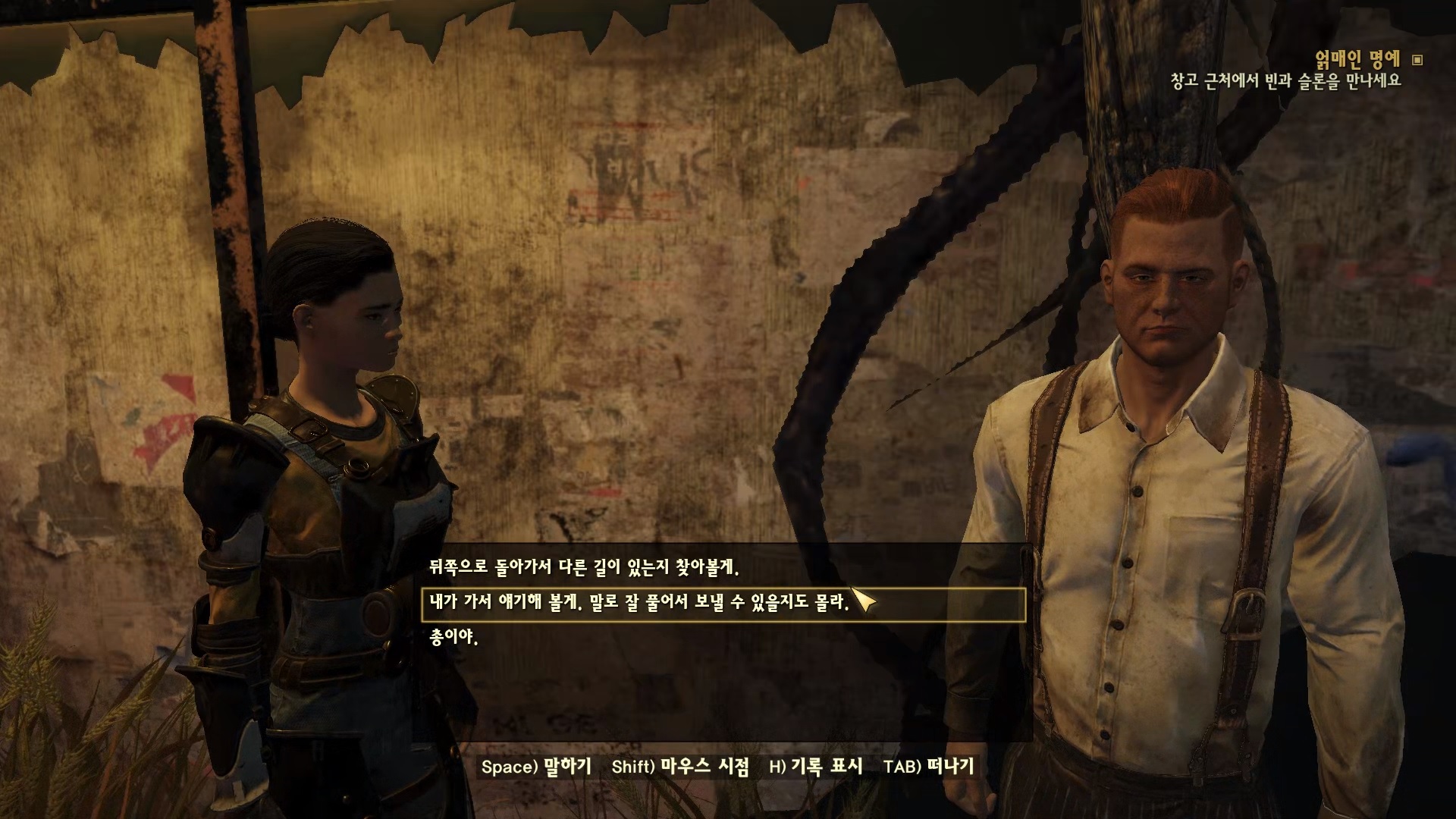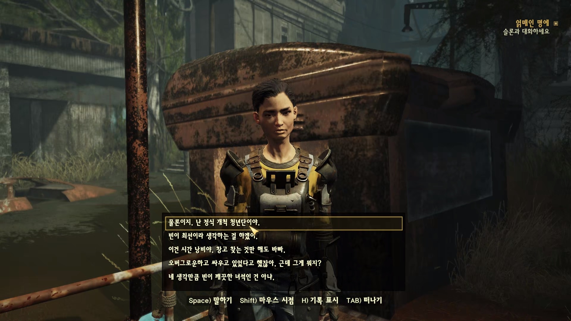 슬론이 곤경에 처한 사람을 그냥 지나치느냐는 질문에 당당하게 '개척 청년단'이라고 대답하자. (퀘스트를 했기 때문에 나오는게 아닐까 싶다..)