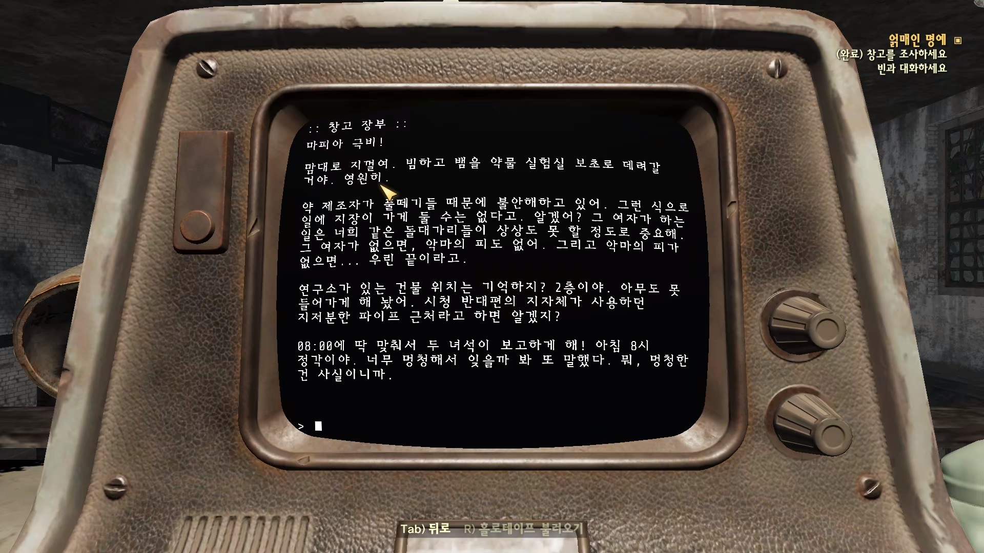 창고 단말기에 접속해 '실험실 보초'를 선택한다. 그리고 빈에게 돌아가서 대화하자.