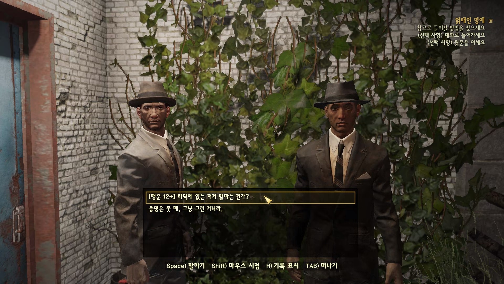 창고 근처로 가서 빈과 대화를 한다. 창고에 들어갈 방법은 뒤쪽 문, 그리고 대화 두 가지 방법이다. 뒤쪽 문은 근처 벽에 부착된 종이를 찾아 문을 4번 두드리면 되고, 대화는 행운 12+로 간단한 대화로 문을 열 수 있는 방법이다.