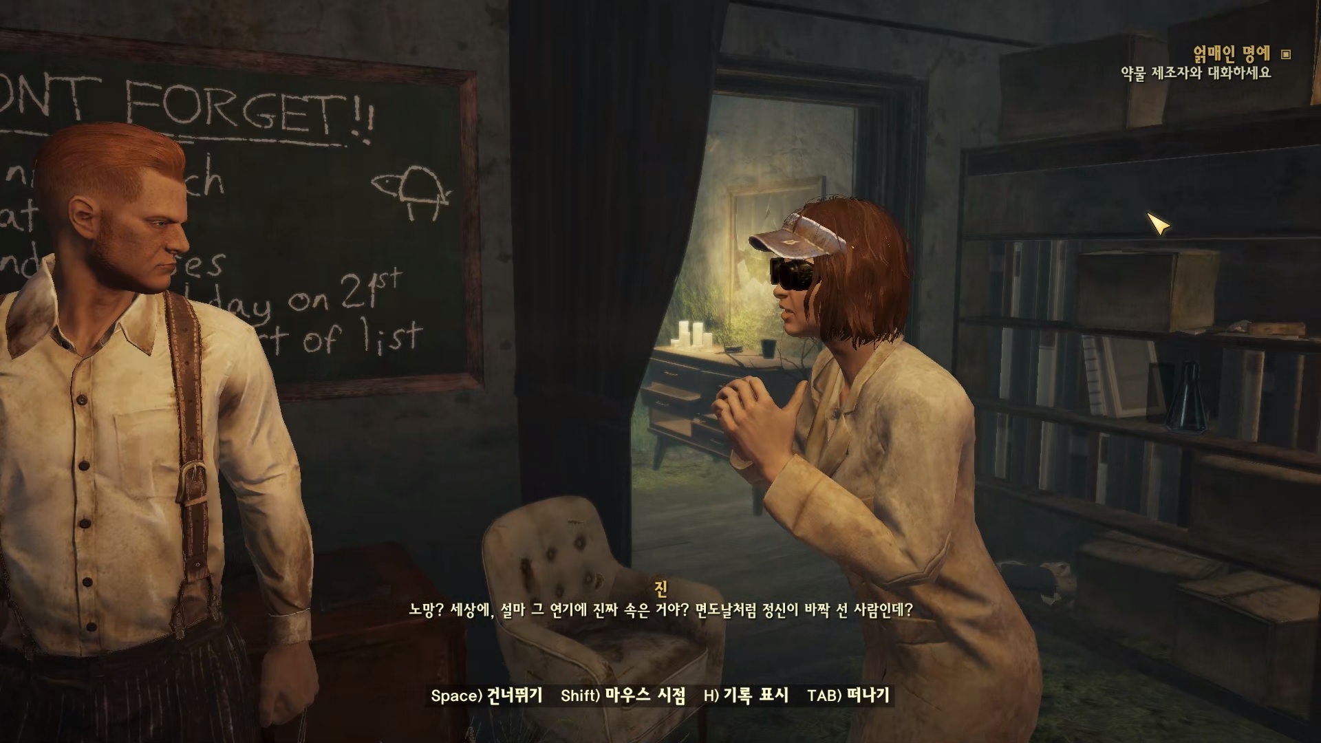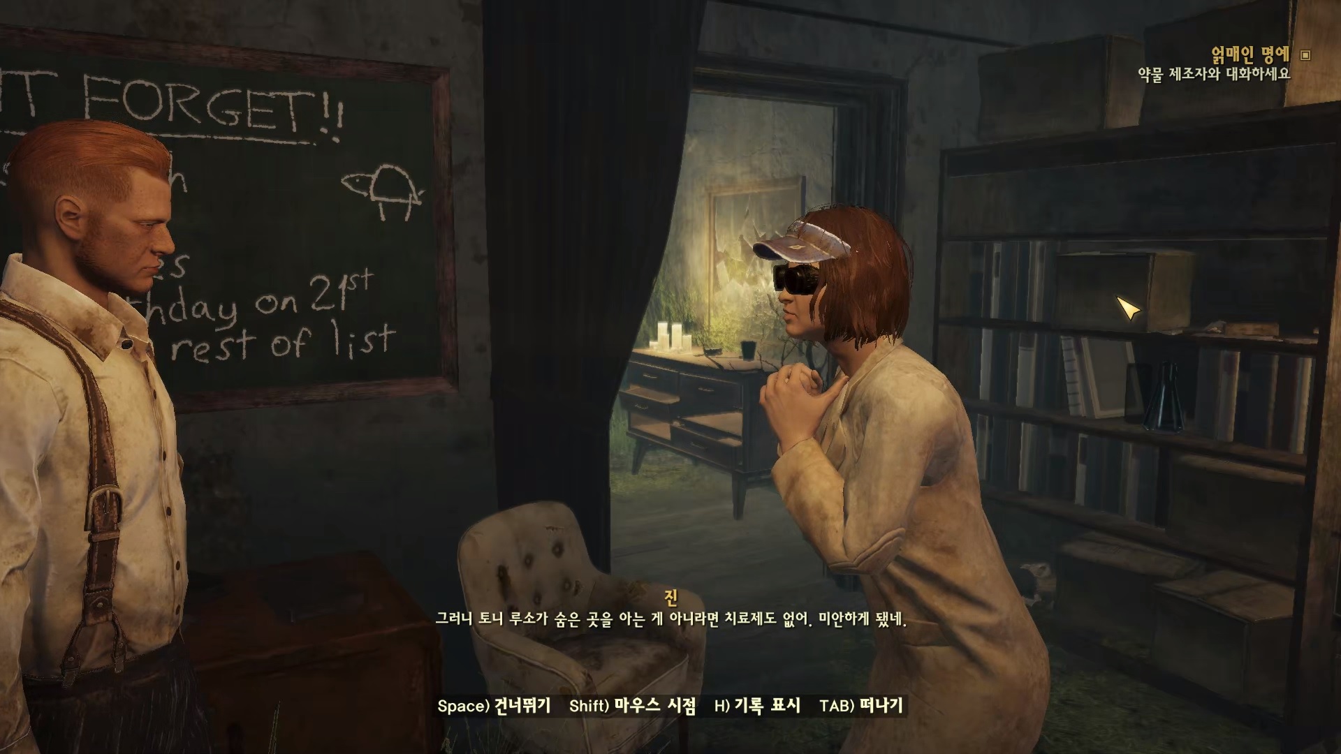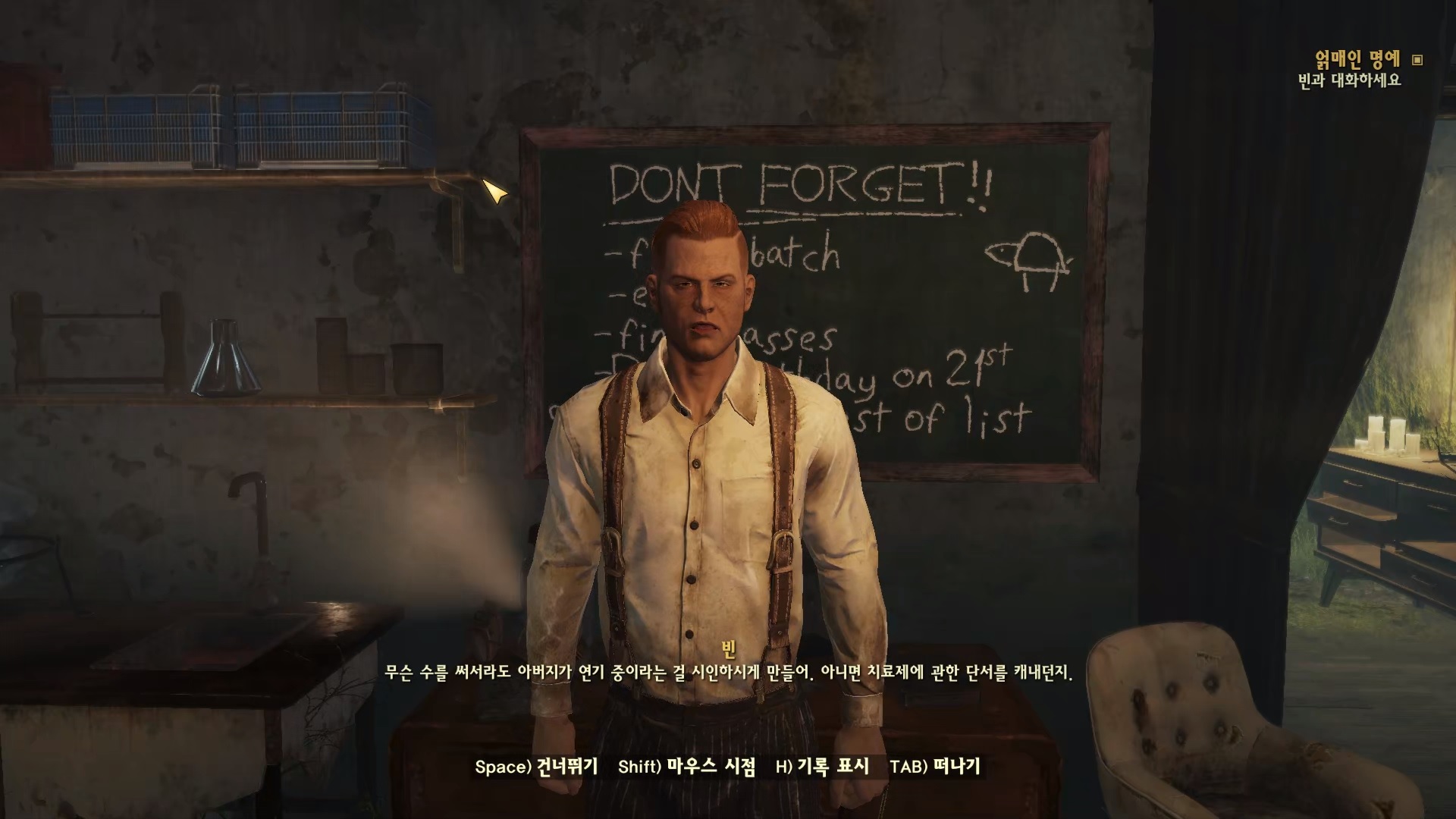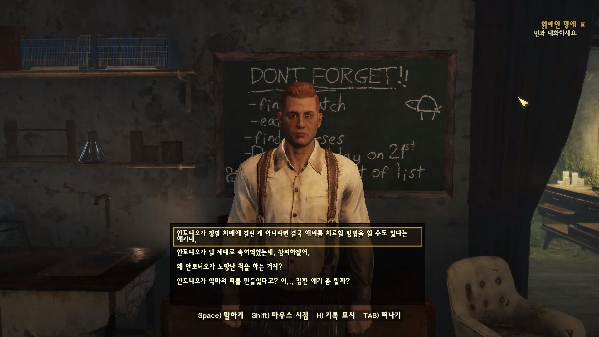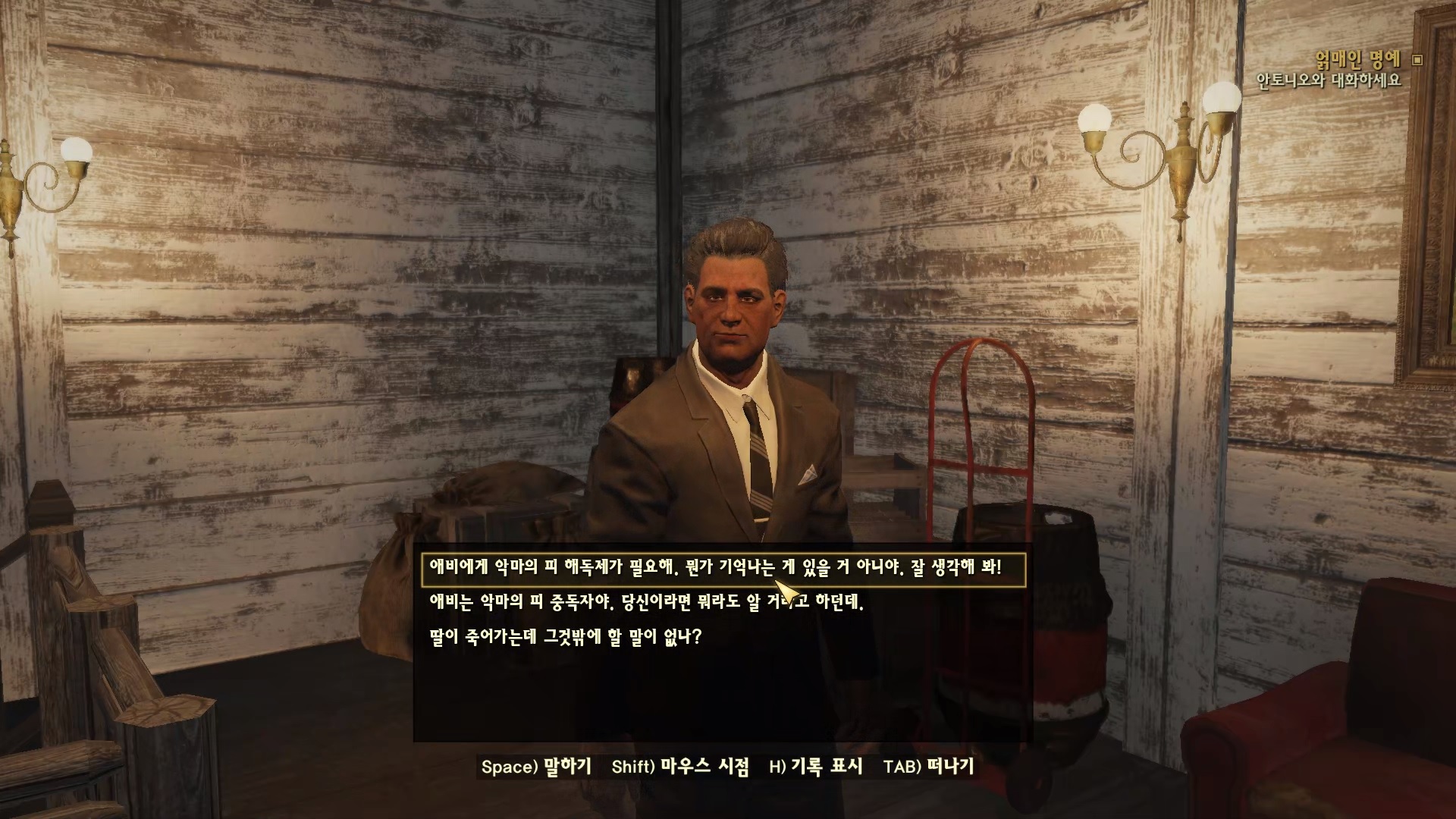 2층에 있는 안토니오에게 애비에게 악마의 피 해독제가 필요하다고 기억나는거 생각해보라니깐 뭔가 말하려다가 엉뚱한 소리를 한다. 수상한데... 이 녀석도 에블린처럼 냄새가 나는데...
