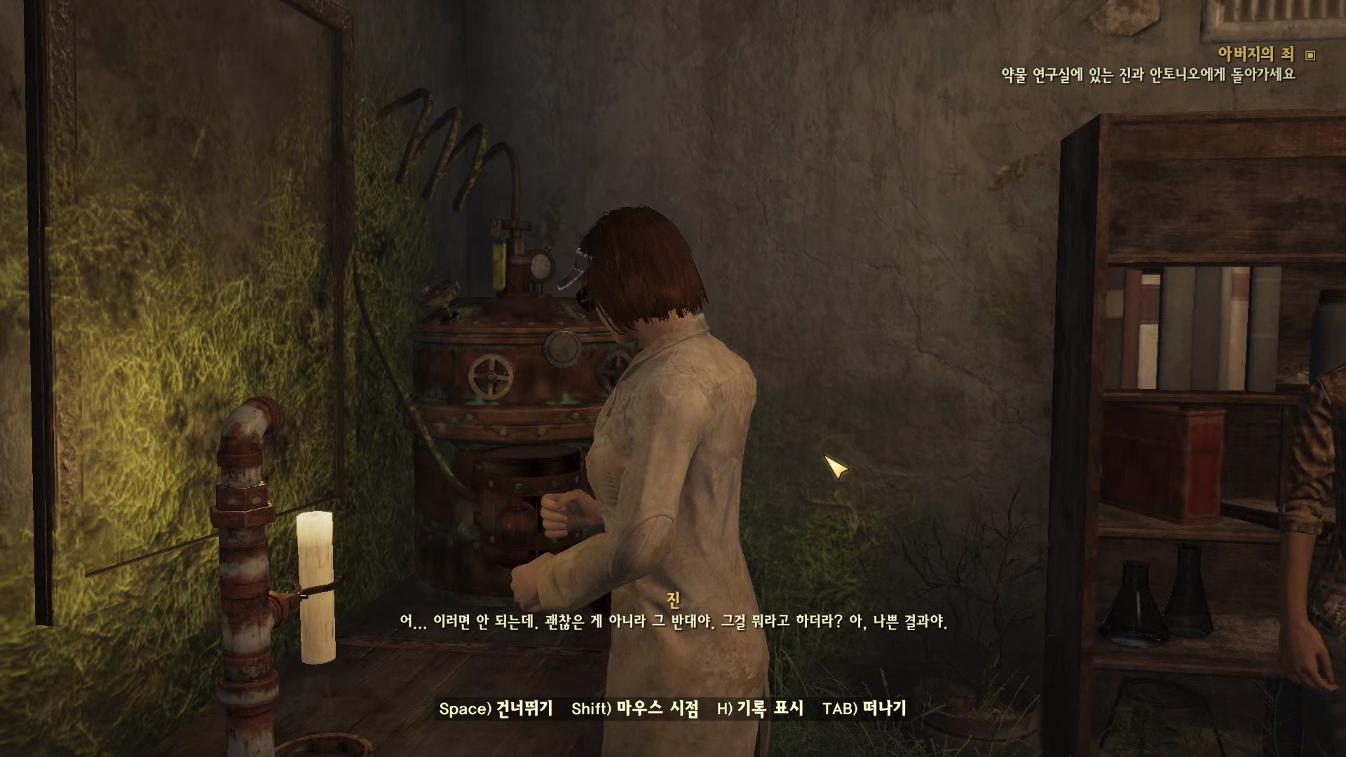 진 연구실에 오니 애비는 사라지고 없다. 진짜 아빠가 있었던 곳이라는걸 보니 애비는 안토니오의 진짜 딸이 아니었구나. 그래서 빈 보다 애비를 더 애지중지했던건가.. 하여튼 애비를 찾으러 가자.