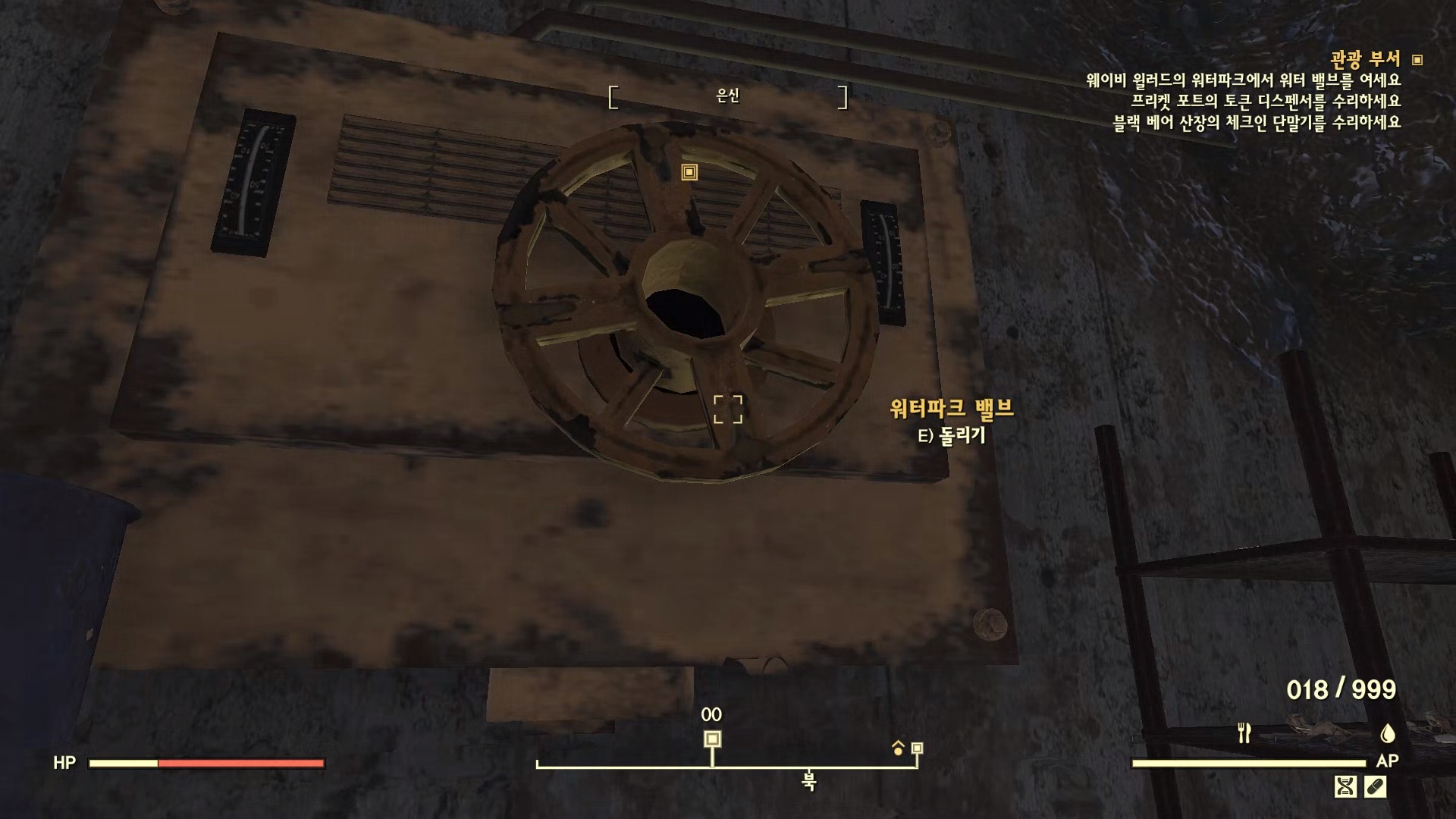 빠른 이동으로 직진하다가 분수대 왼쪽편 계단으로 올라가 바로 오른쪽에 보면 철망이 보이는데 거기 지하로 내려가는 길이 있다. 지하로 가면 밸브가 있다.