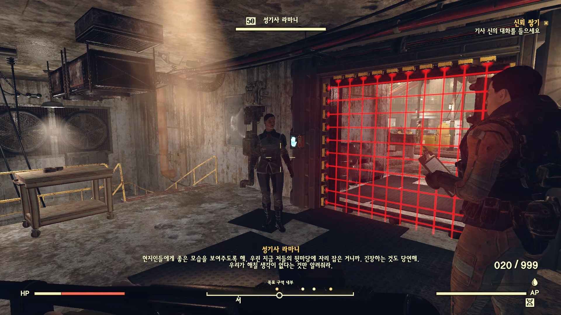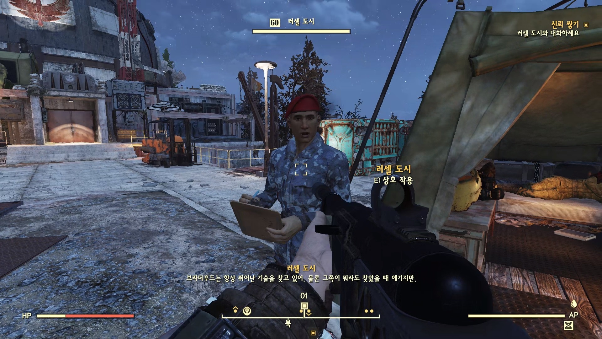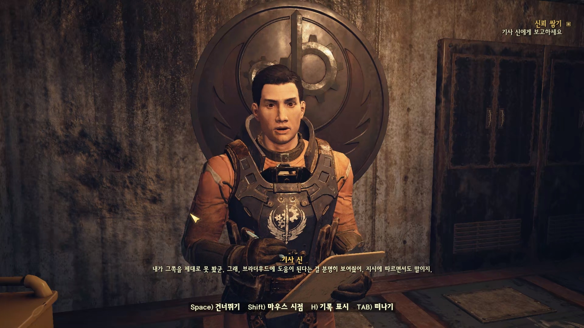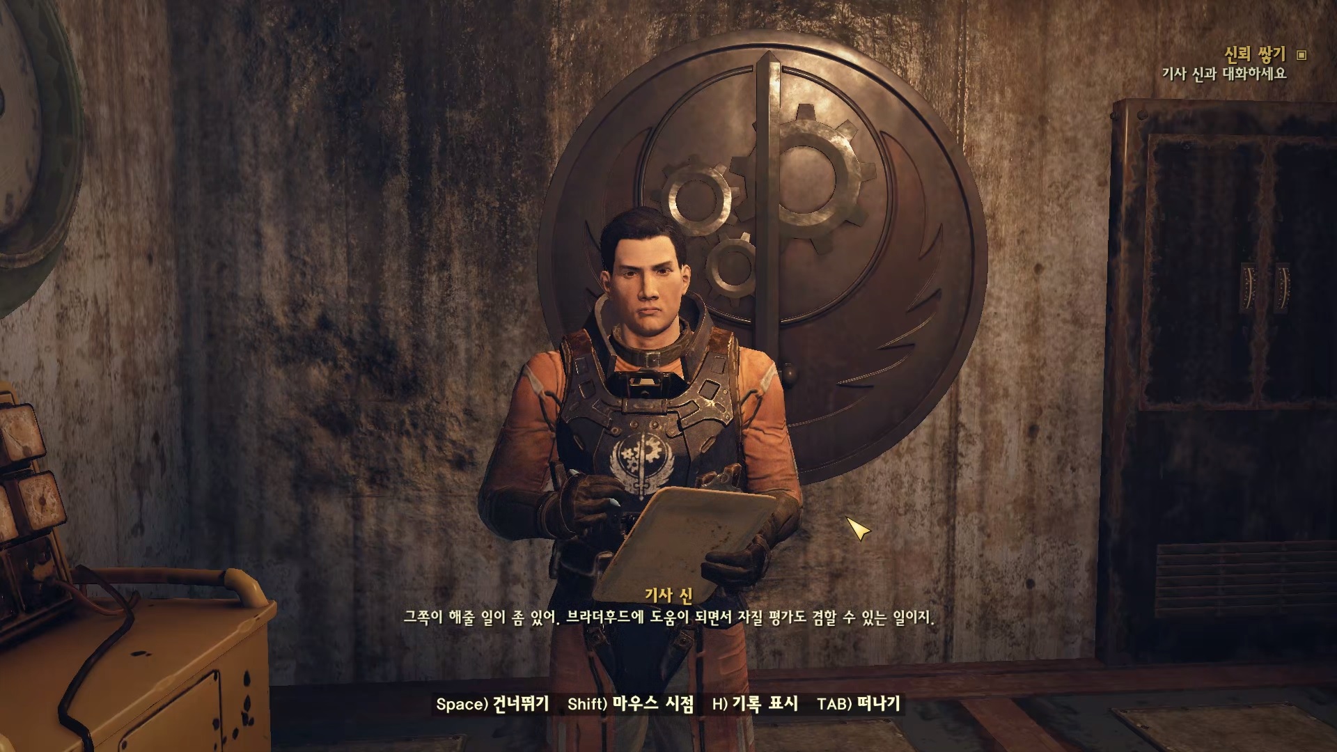 기사 신과 대화하자. 매력 4+ 있다면 브라더후드에 가입 하고 싶다는 항목이 나온다. 일단 가입한다고 하면 해줄 일이 있다면서 일을 시킨다. 대민지원. 민간인들을 만나서 대화 하라고 한다.