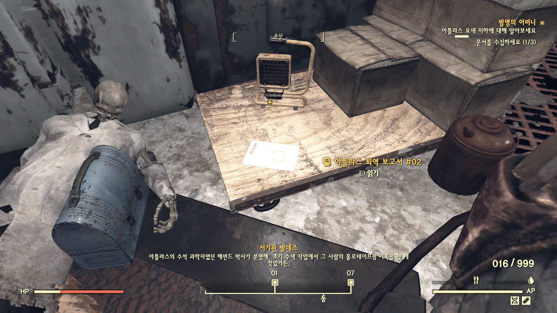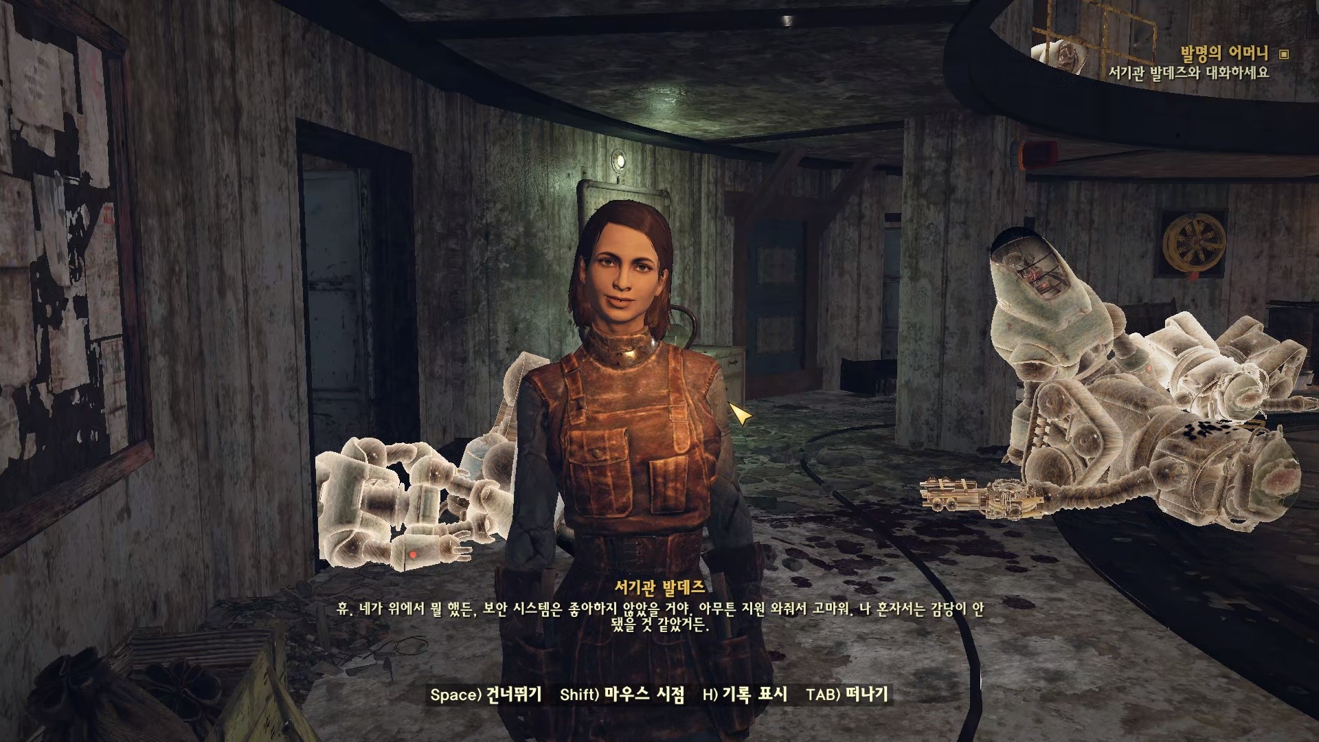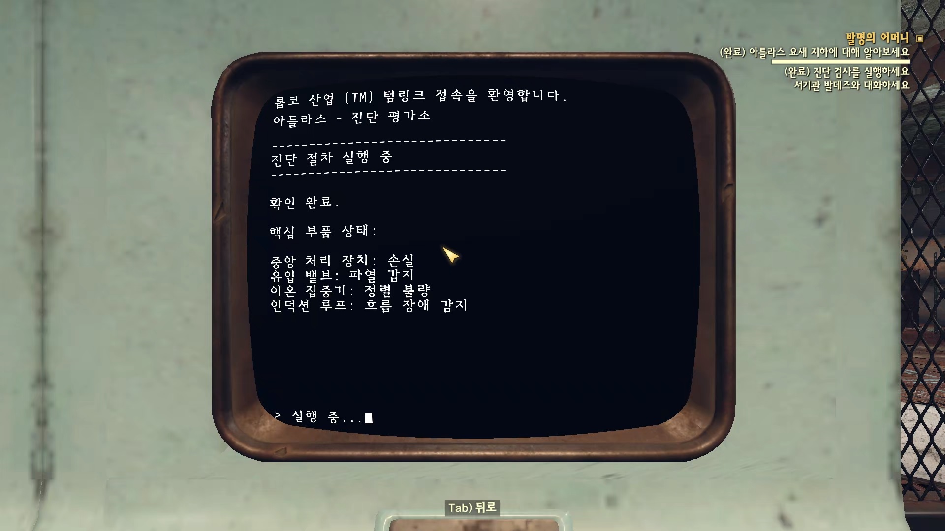 아틀라스 진단 단말기로 가서 진단을 받아보자. 그러면 핵심 부품 상태들이 쭉 나온다. 다시 발데즈에게 가서 대화를 하자.