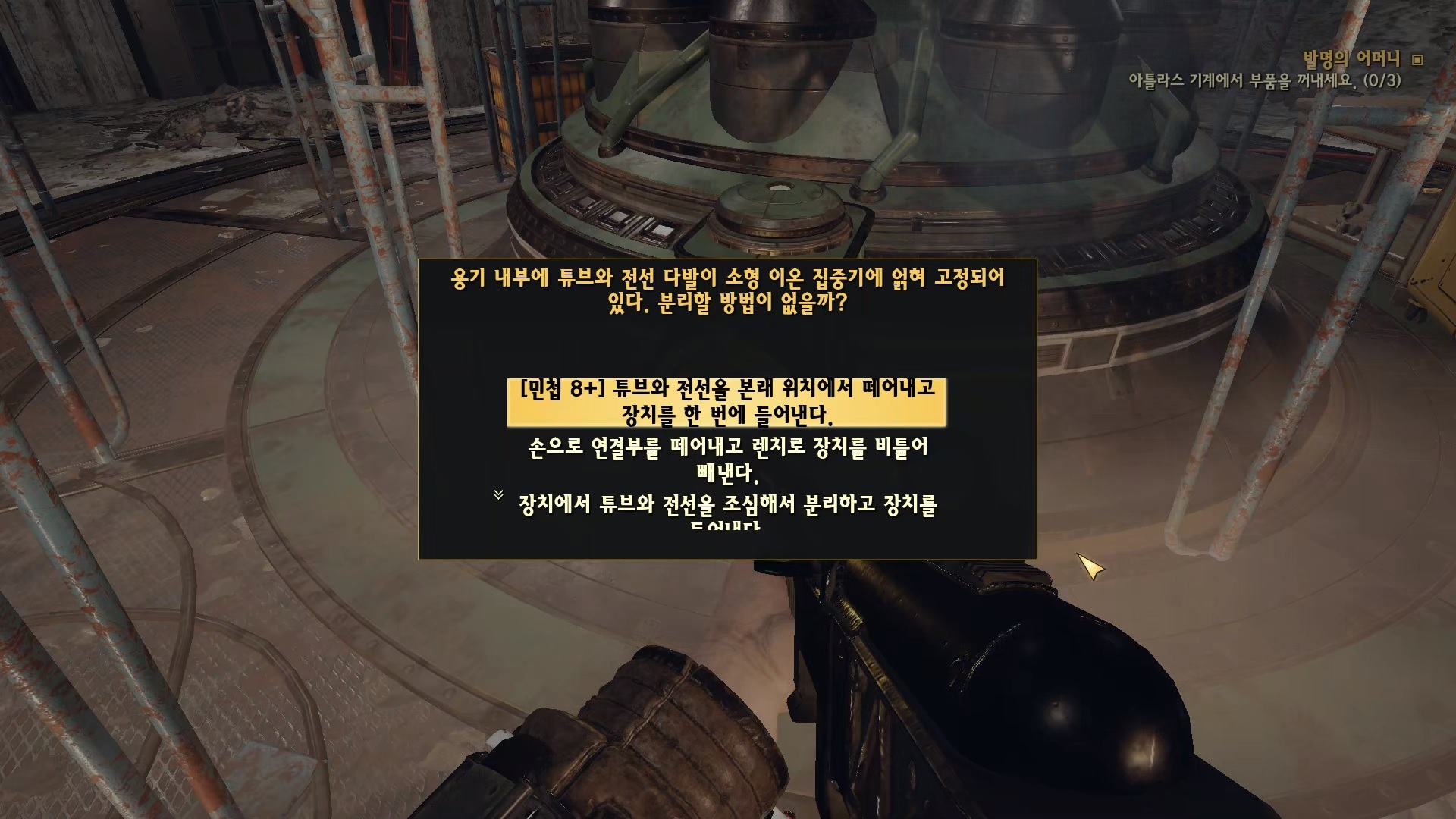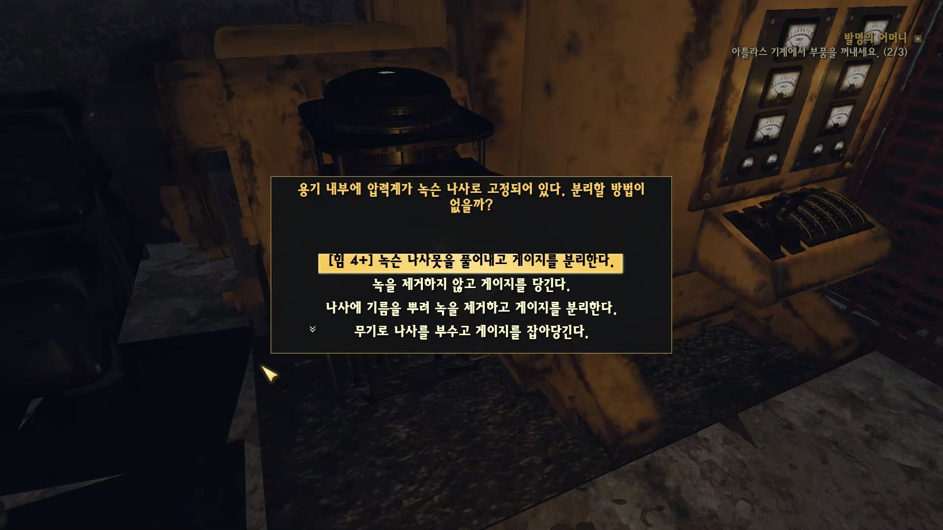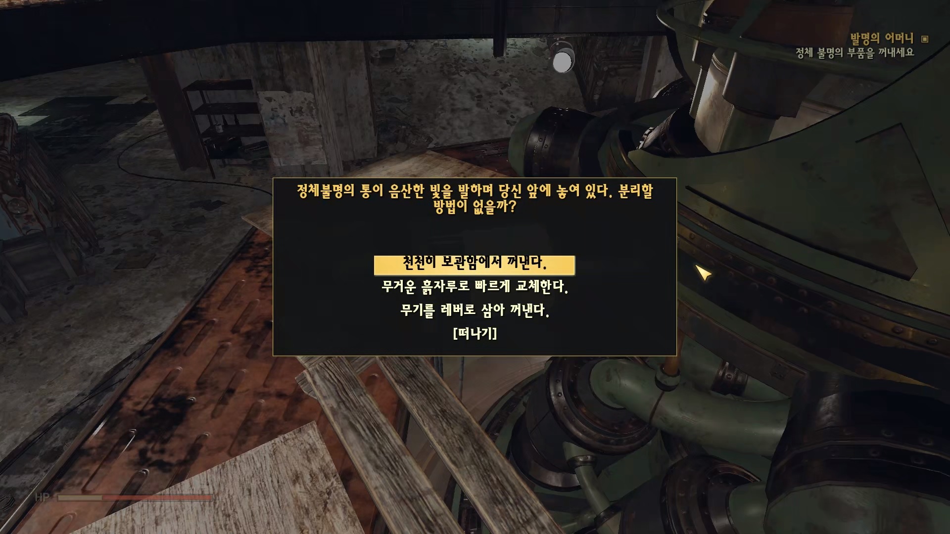 그러면 정체 불명의 부품이 나온다. 선택지가 나오는데 아무거나 해도 상관 없는 듯. '천천히 보관함에서 꺼낸다'를 선택했다.