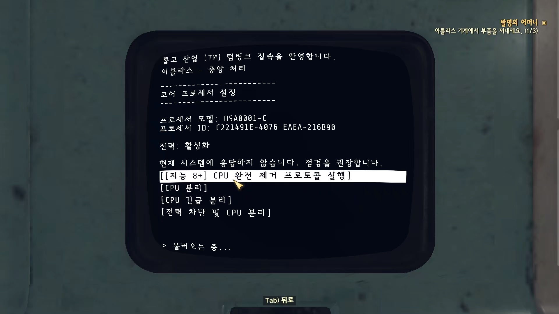 아틀라스 단말기에 접속해 'CPU 설정 => 지능 8+, CPU 완전 제거 프로토콜 실행'