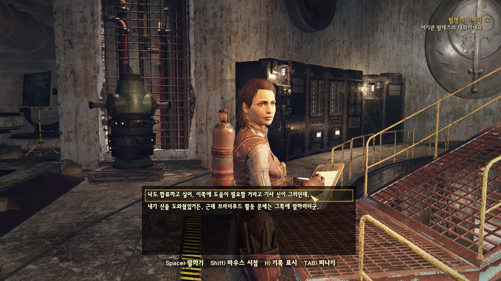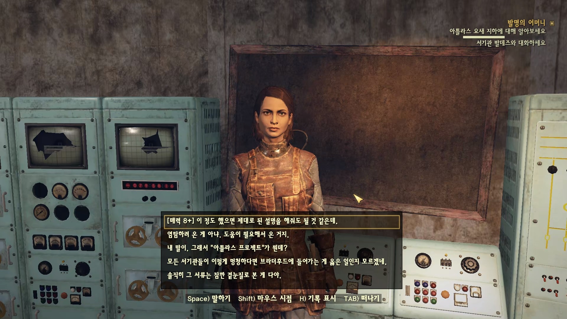 매력 8+ 이면 아틀라스 천문대에 대한 비밀을 알려준다. 전쟁 이전분터 선진적인 군사 연구시설이었다는 것. 브라더후드가 조사하는 이유는 그 기술이 뭔지 파악하고 가치가 있는지 알아보기 위함이다.