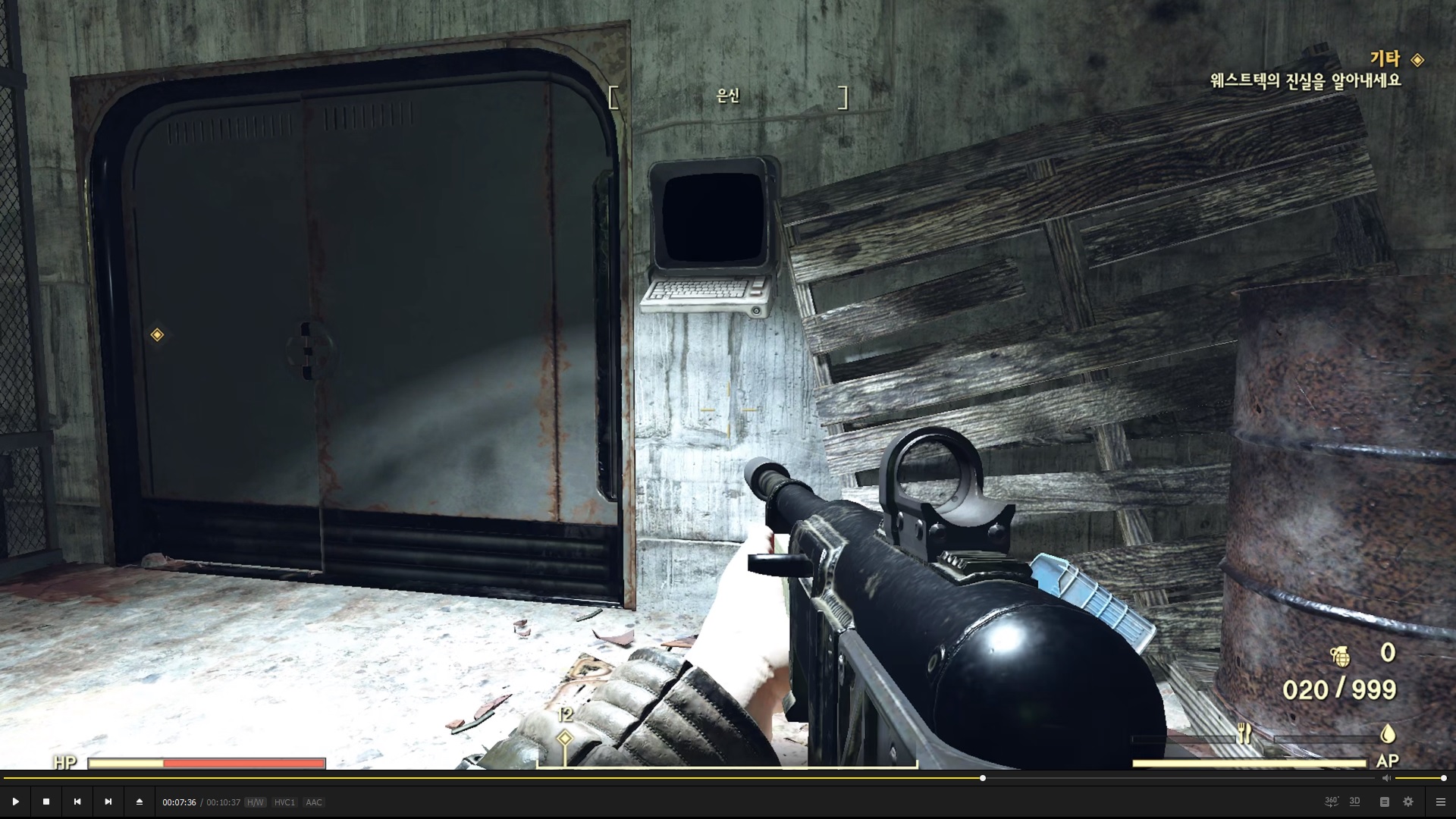 슈퍼 뮤턴트 투사가 지키고 있는 통제실의 단말기에 접속한다. 저 투사는 항상 있는것 같다.