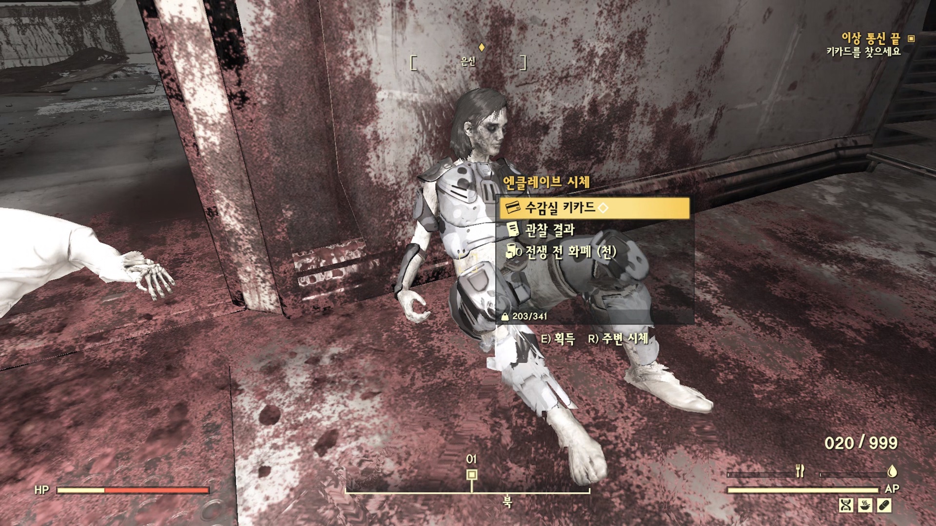 계속 진행 할려면 키카드를 찾아야 되는데, 스코치드 데스클로가 나왔던 문 옆에 엔클레이브 시체에서 얻을 수 있다. 열고 들어가자.
