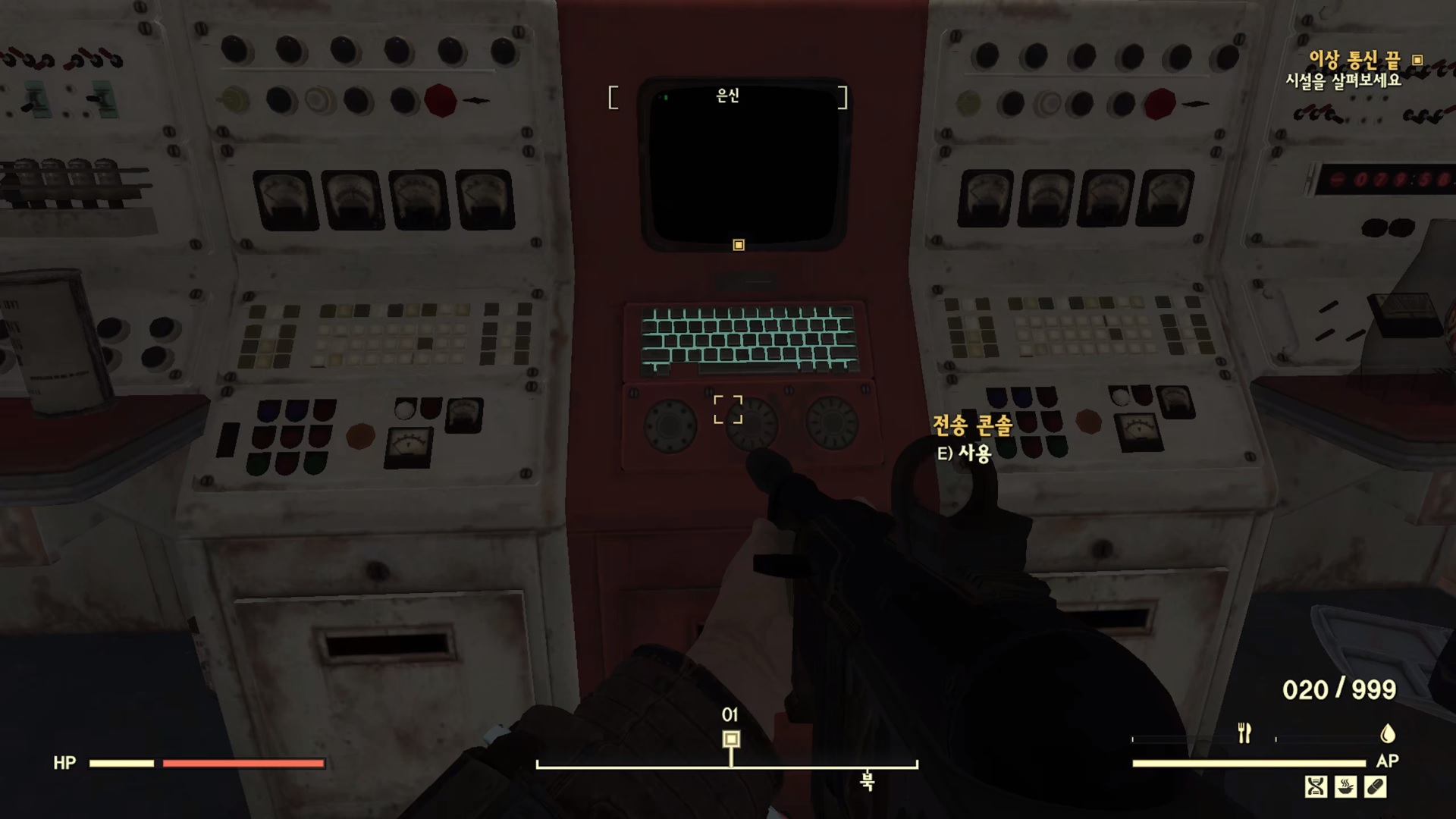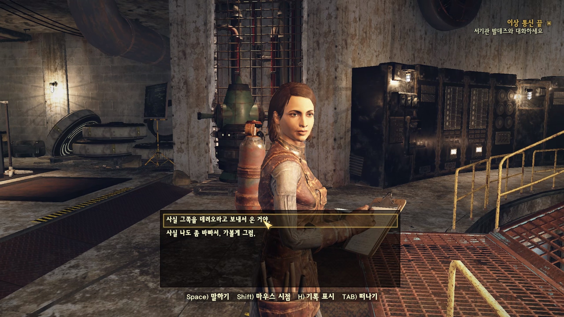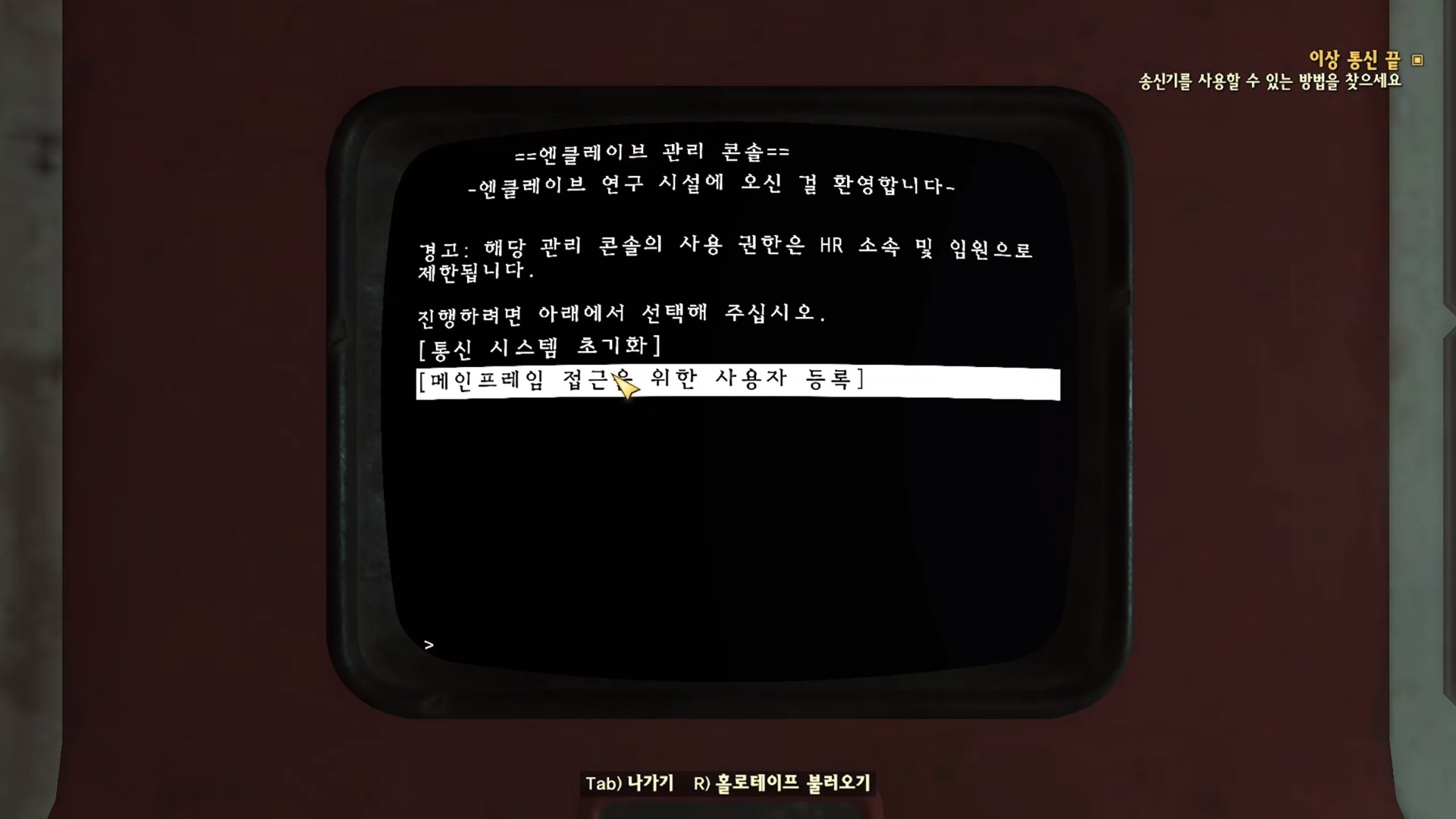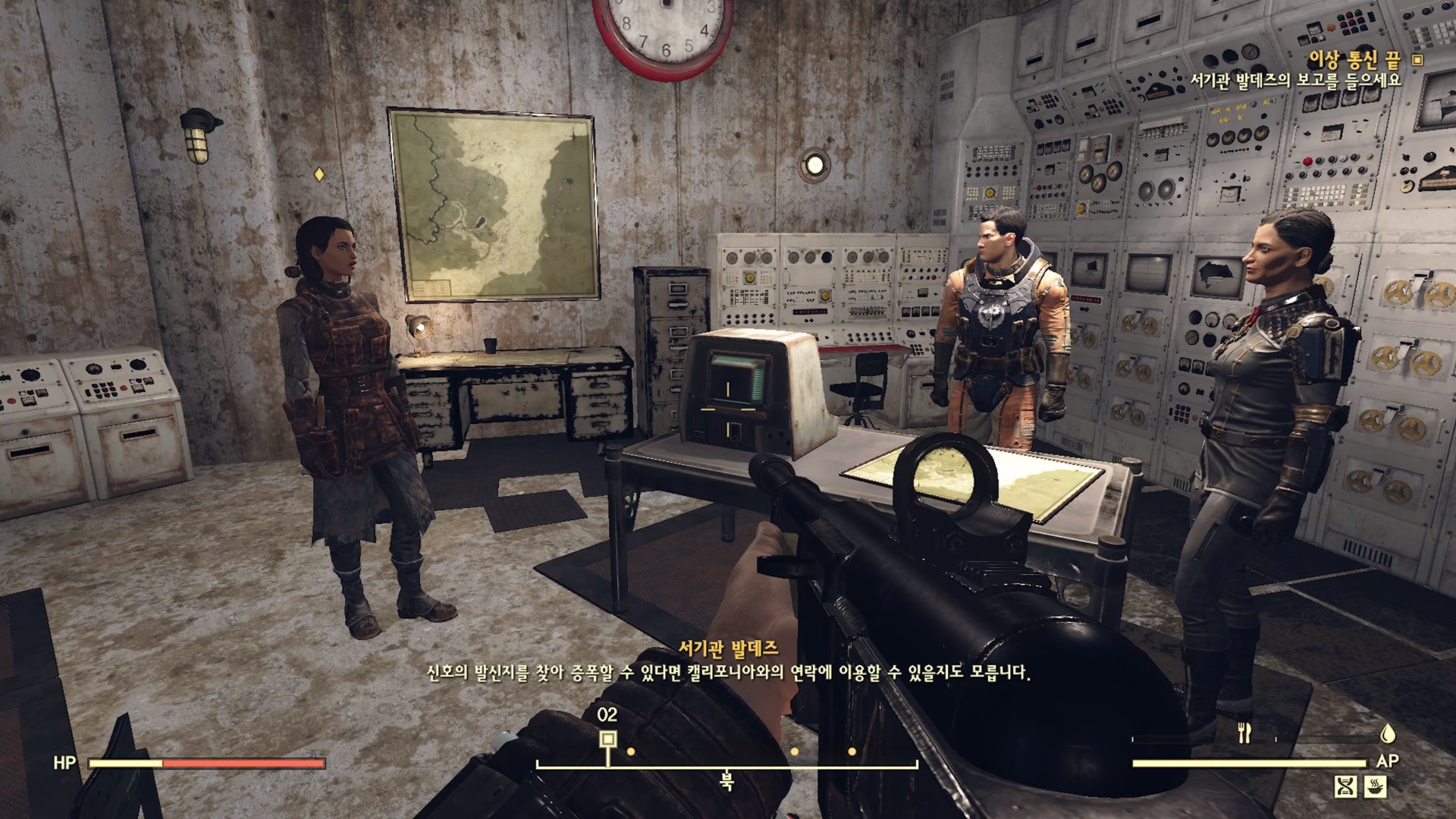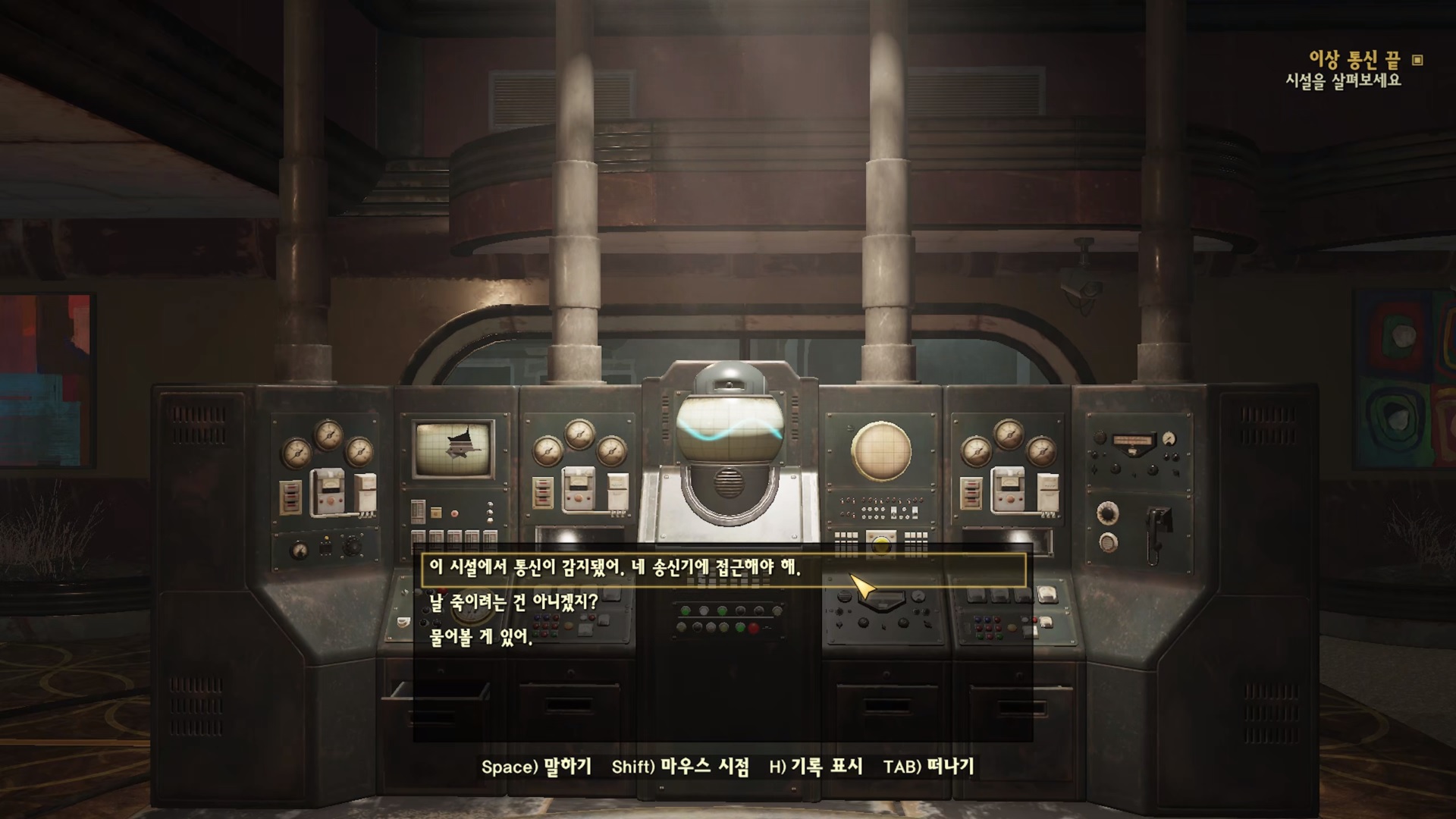 송신기에 접근 하려고 하면 14300여시간을 기다리라고 한다. 엔클레이브 퀘스트로 장군이 됐다면 장군이랑 대화가 생기는데 역시 선택해도 6600여시간으로 줄어들뿐 해결은 안된다.