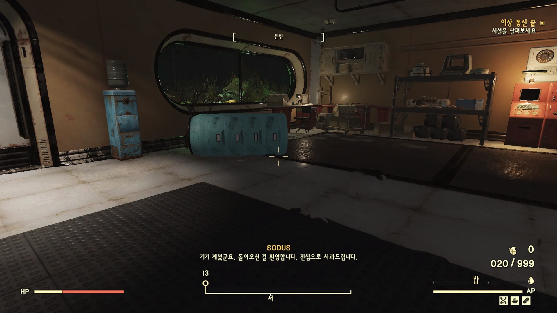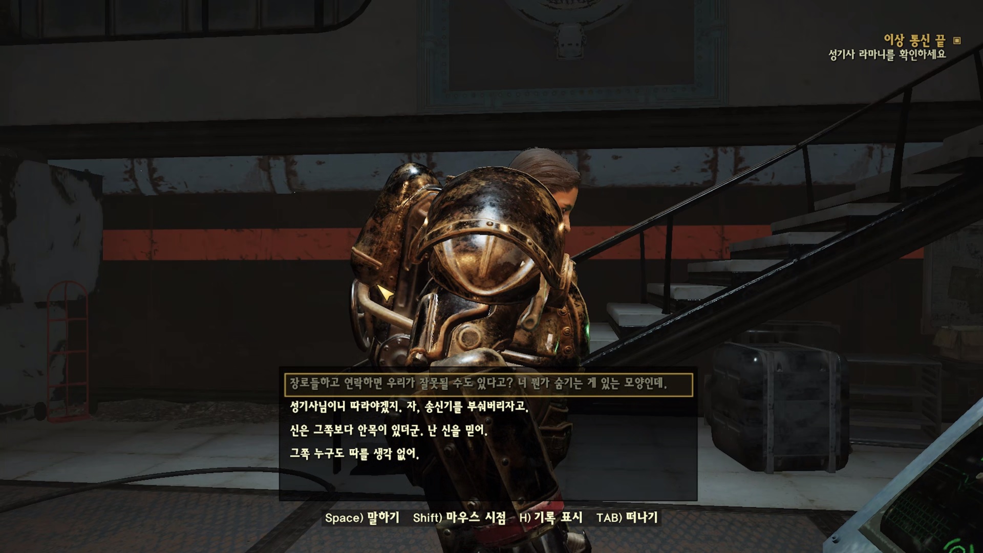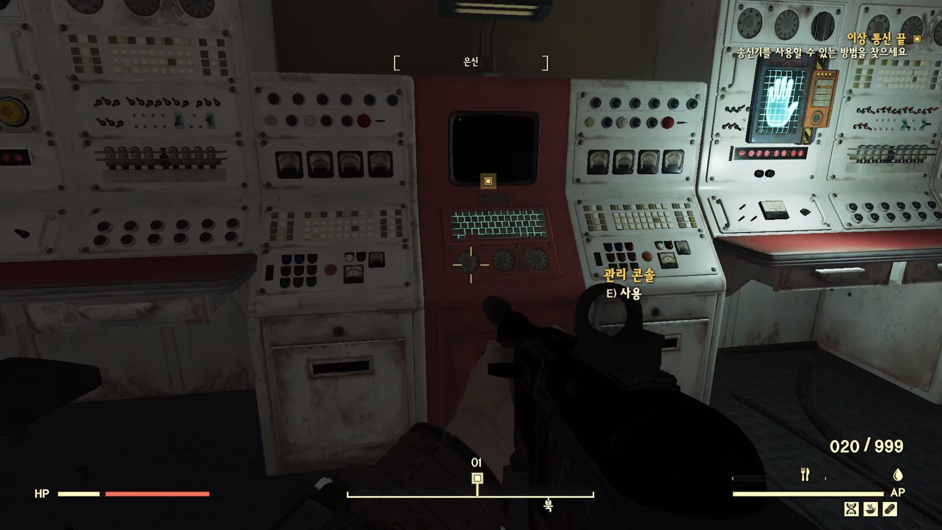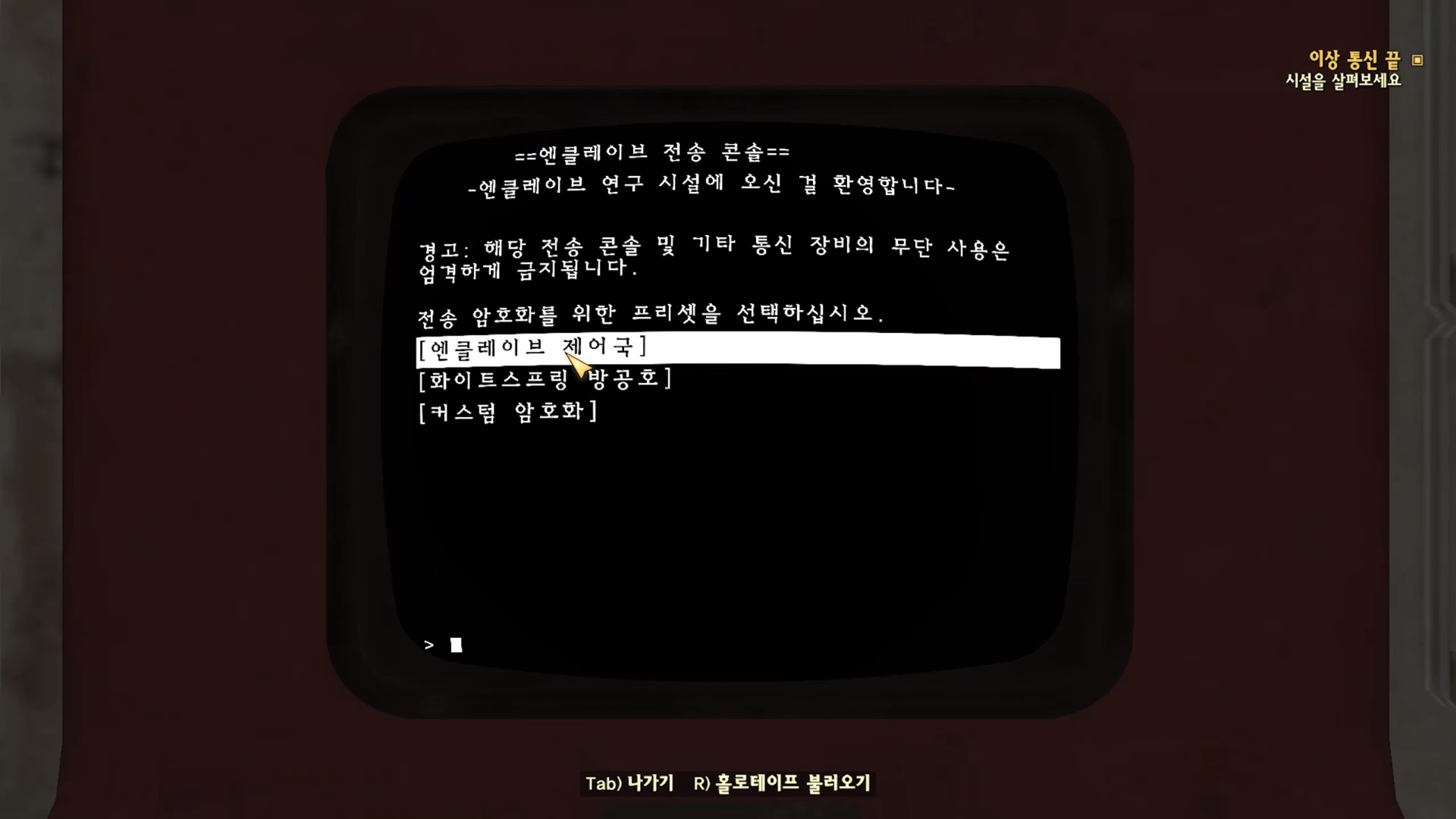 송신기에 접근 하려고 하면 14300여시간을 기다리라고 한다. 엔클레이브 퀘스트로 장군이 됐다면 장군이랑 대화가 생기는데 역시 선택해도 6600여시간으로 줄어들뿐 해결은 안된다.