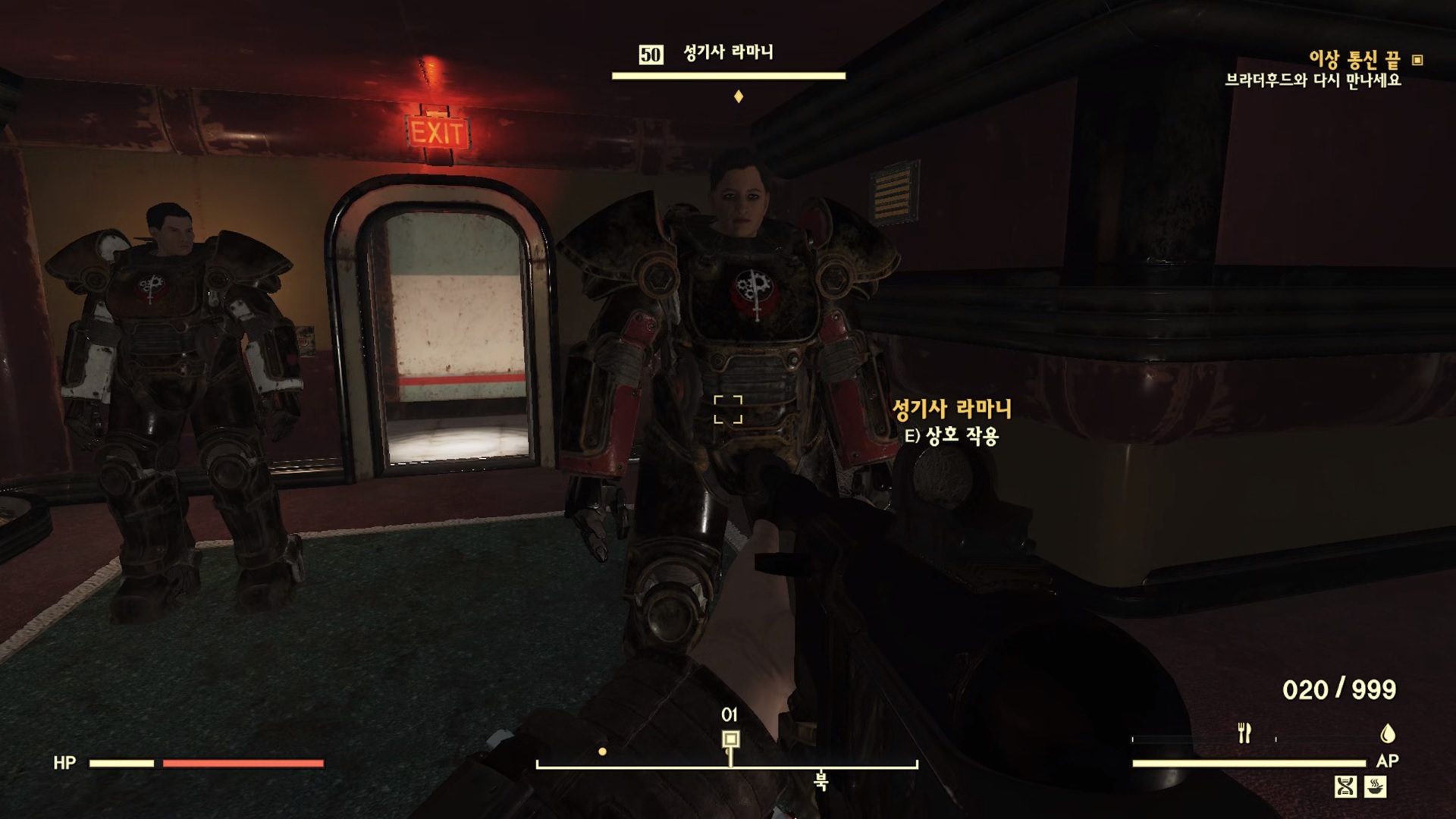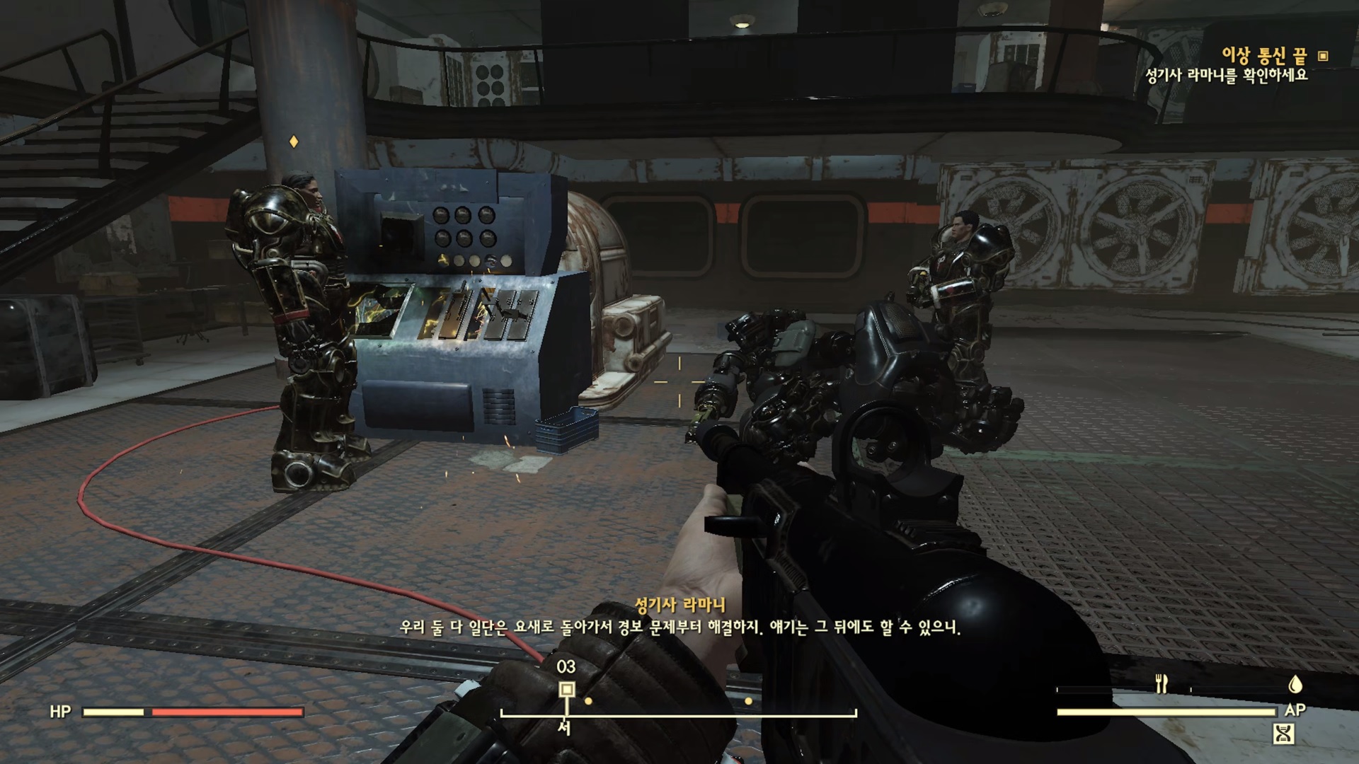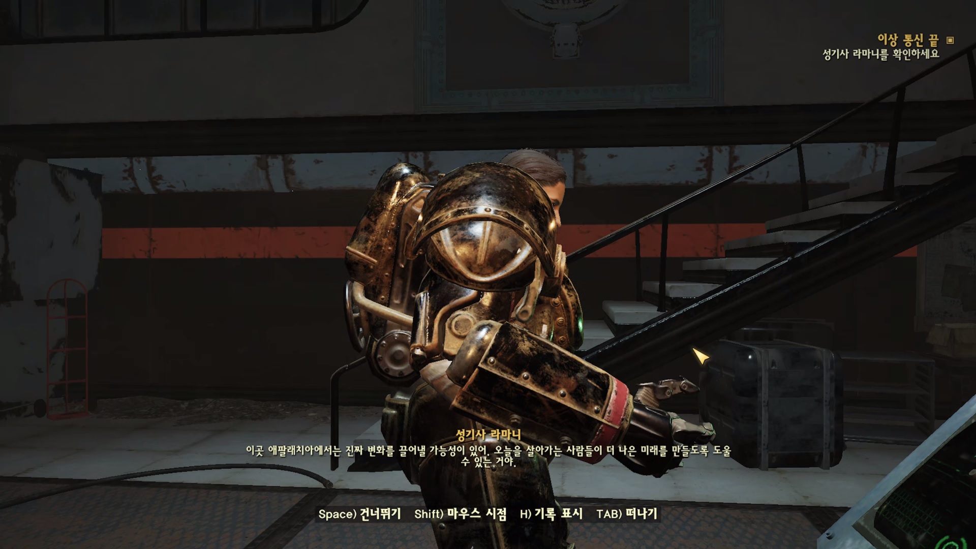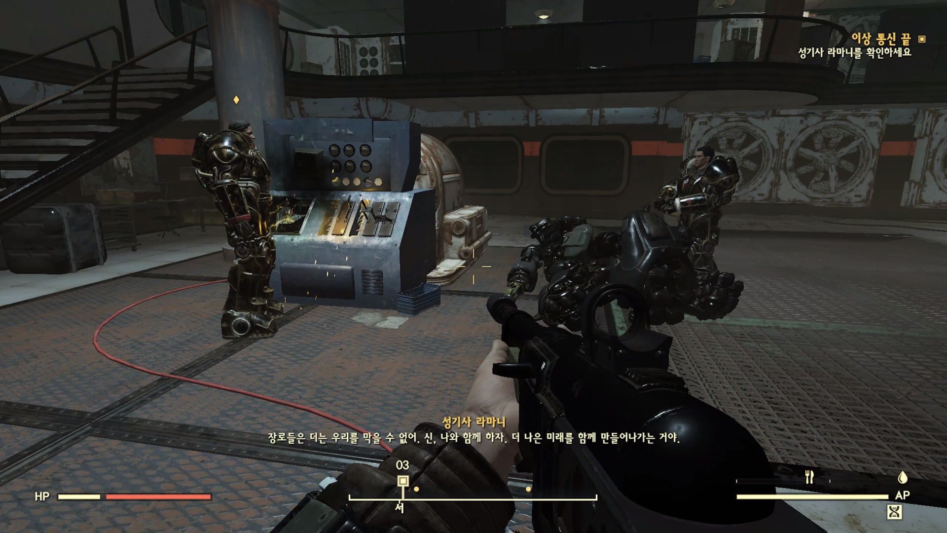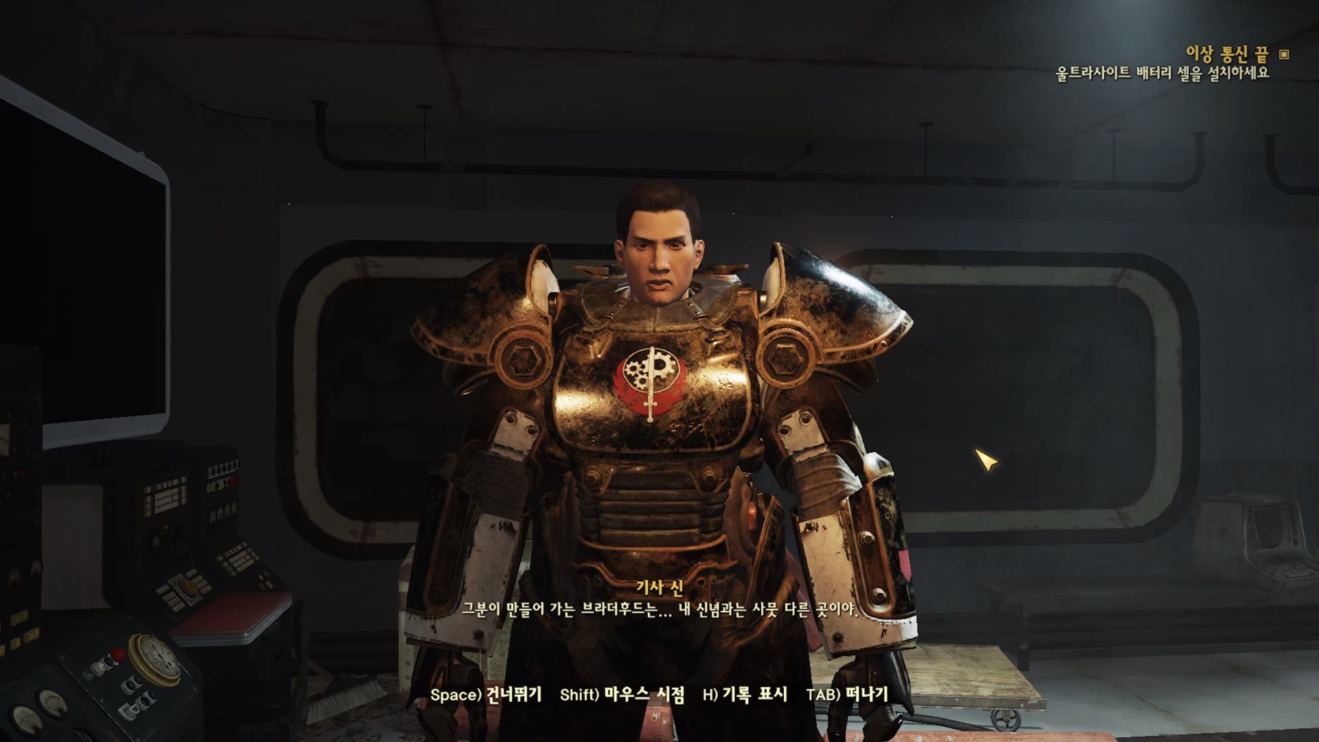 송신기에 접근 하려고 하면 14300여시간을 기다리라고 한다. 엔클레이브 퀘스트로 장군이 됐다면 장군이랑 대화가 생기는데 역시 선택해도 6600여시간으로 줄어들뿐 해결은 안된다.