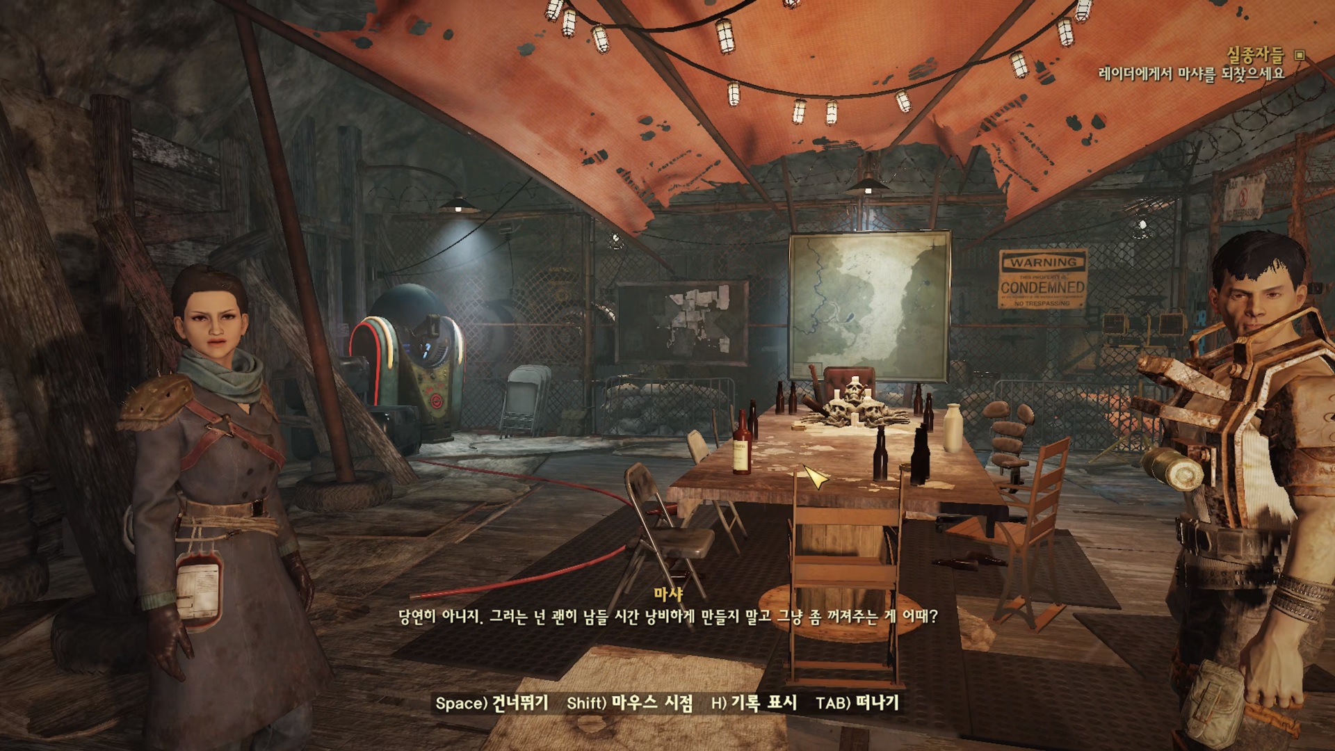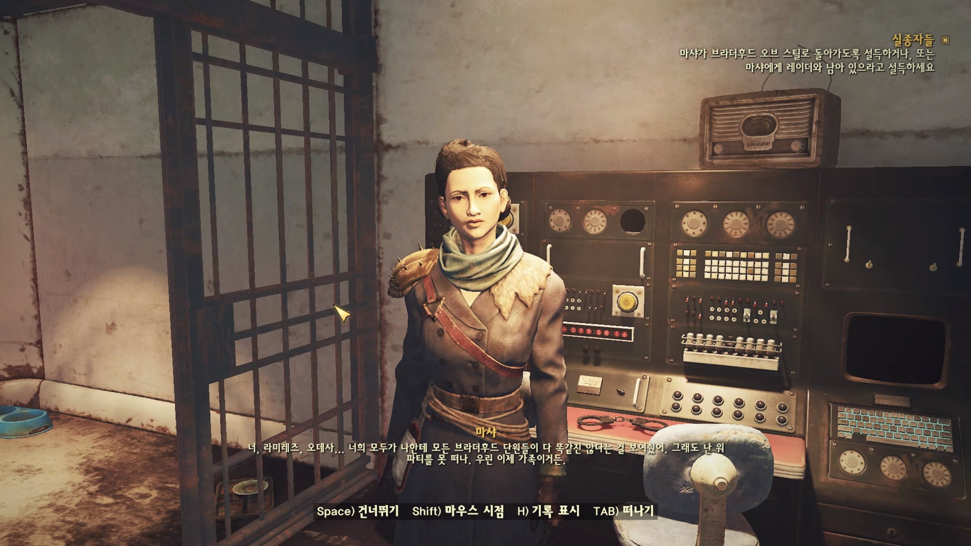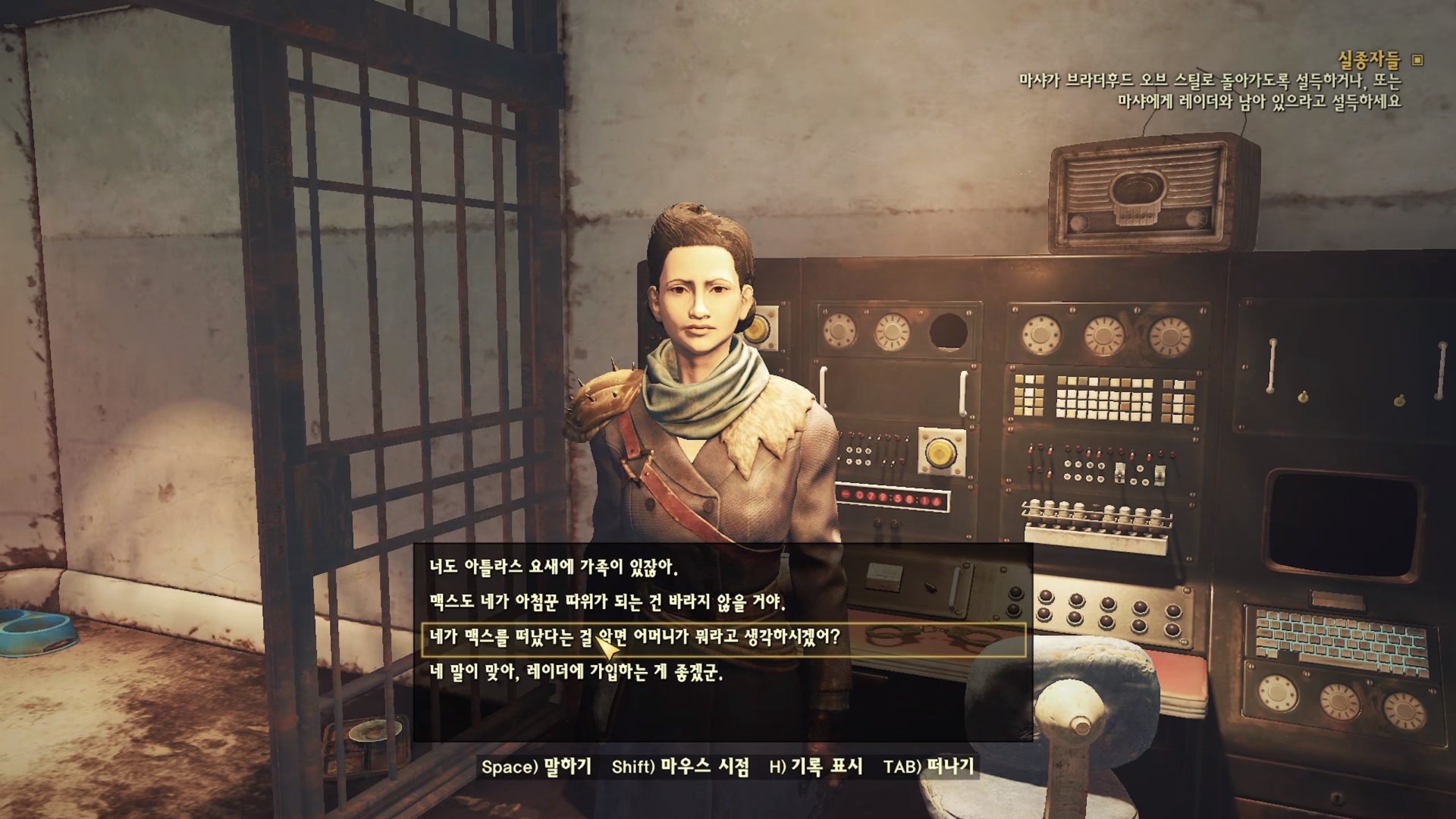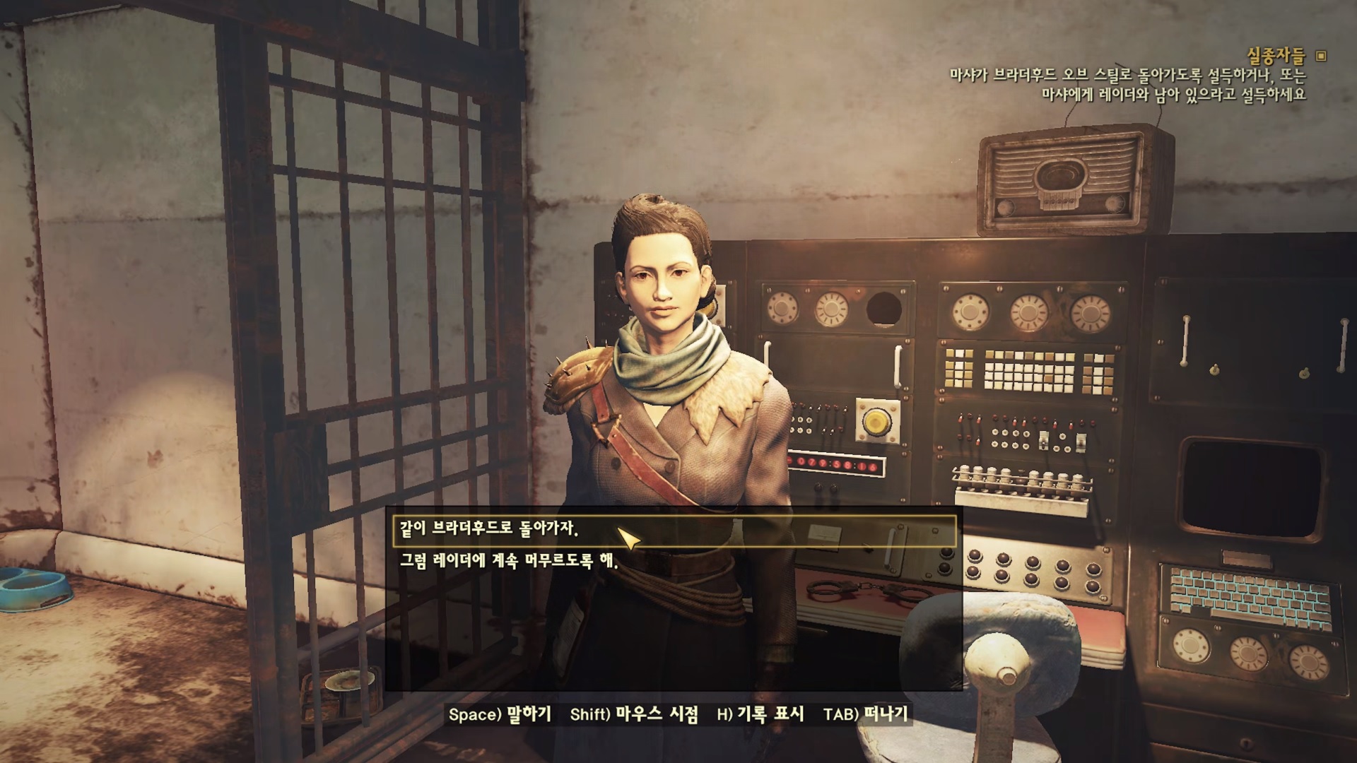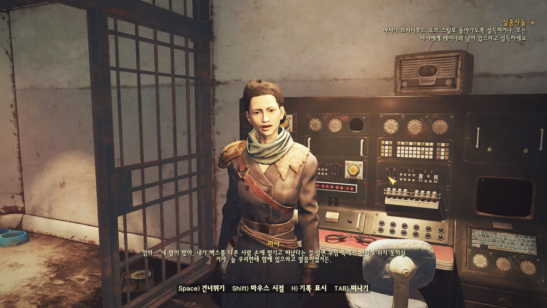 마샤가 왜 브라더후드를 싫어하는지도 알게 되는데 당시 브라더후드가 마을에 무기를 제공하지 않고 전쟁만 하지 않았다면 어머니가 죽지 않았을거라고 생각하고 있다는 것. 레이더가 원래 살인과 약탈을 밥 먹듯 하는 애들인데... 마샤는 지금 착각을 하고 있다! 악의 소굴에서 데려와야겠다.