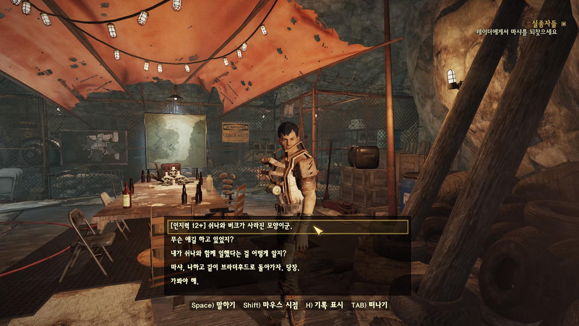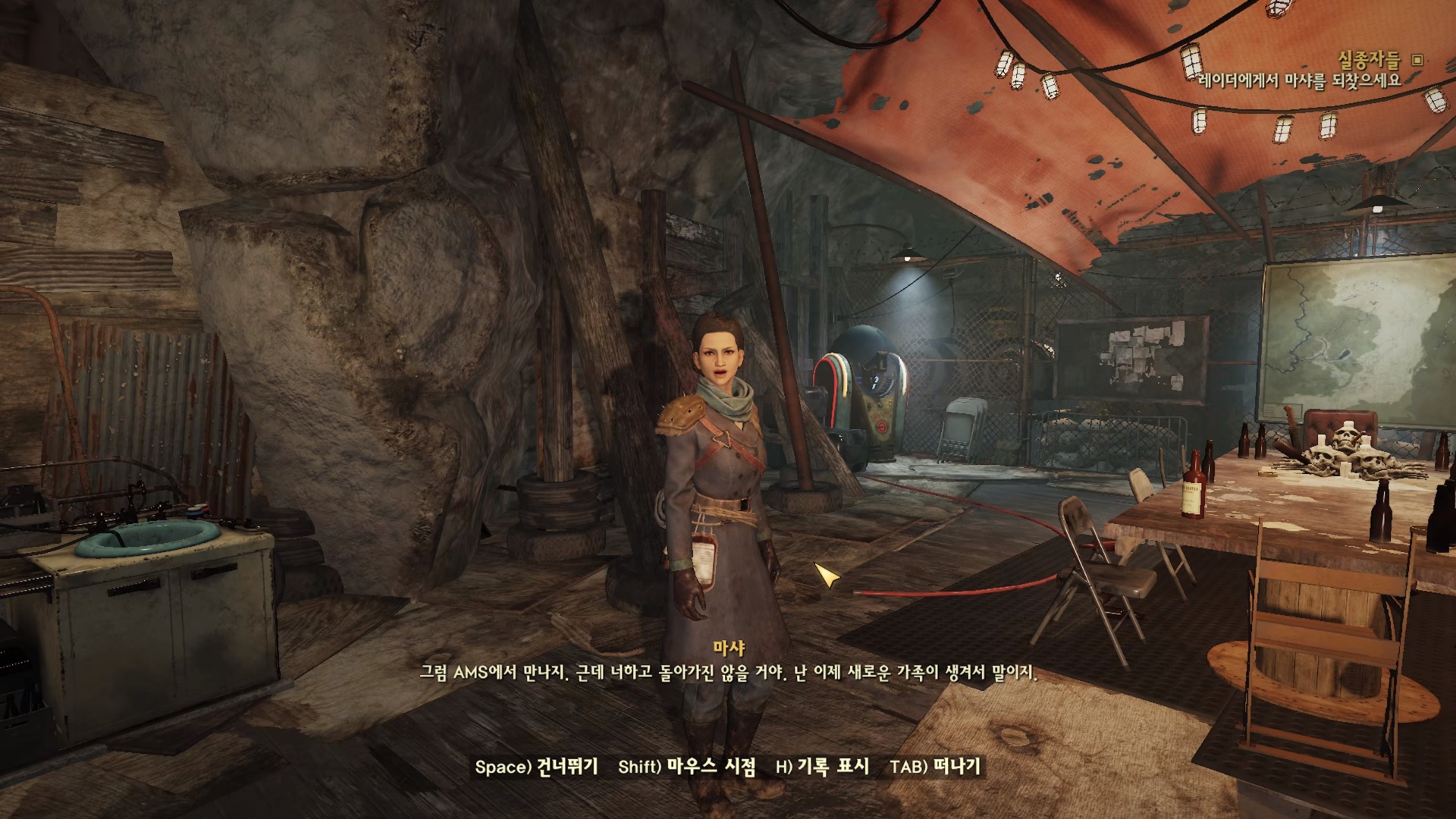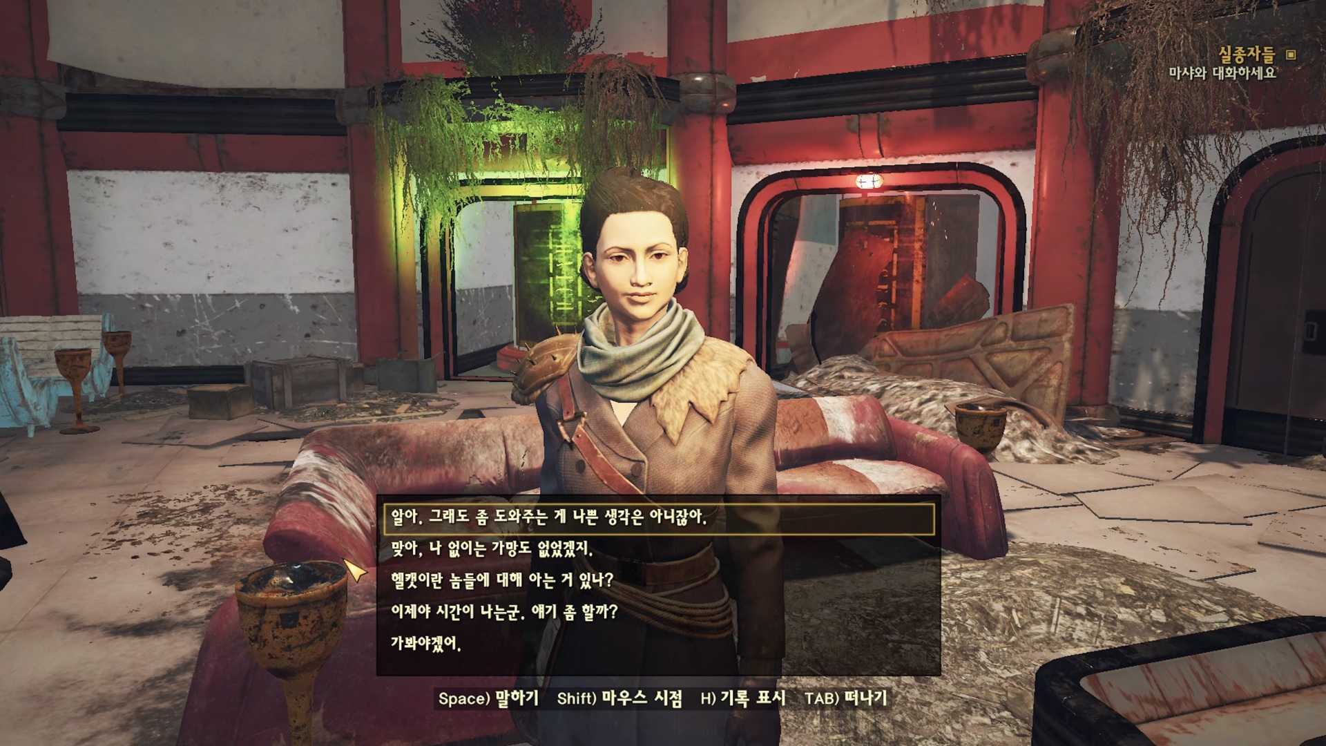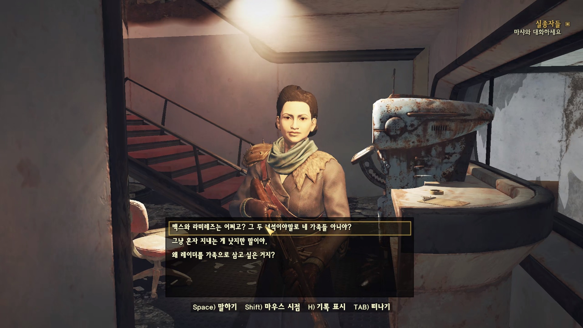 마샤가 왜 브라더후드를 싫어하는지도 알게 되는데 당시 브라더후드가 마을에 무기를 제공하지 않고 전쟁만 하지 않았다면 어머니가 죽지 않았을거라고 생각하고 있다는 것. 레이더가 원래 살인과 약탈을 밥 먹듯 하는 애들인데... 마샤는 지금 착각을 하고 있다! 악의 소굴에서 데려와야겠다.
