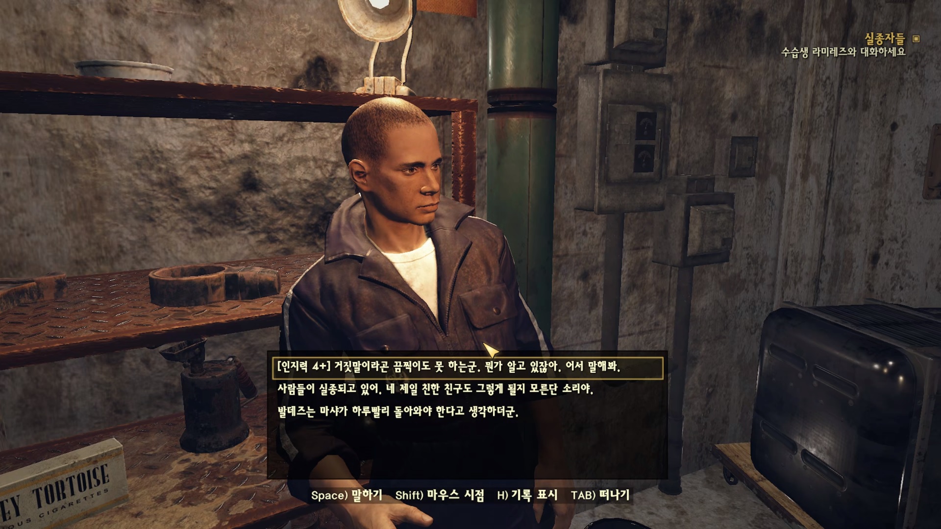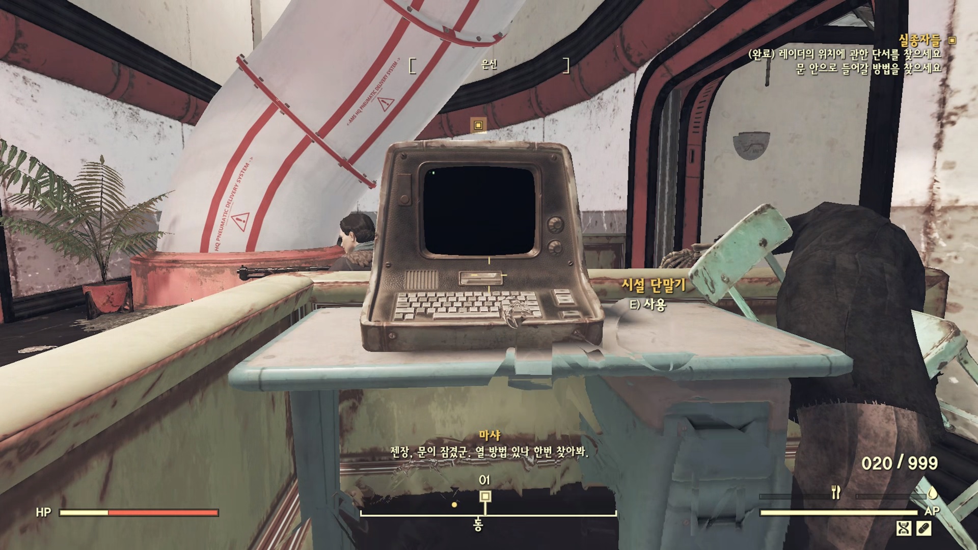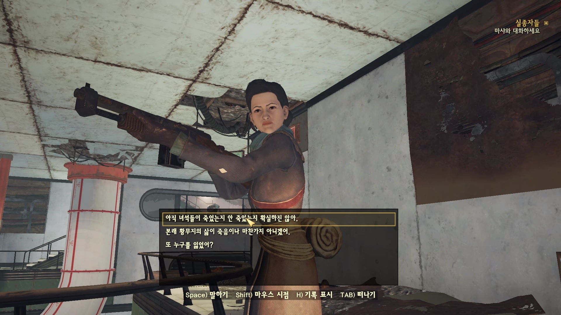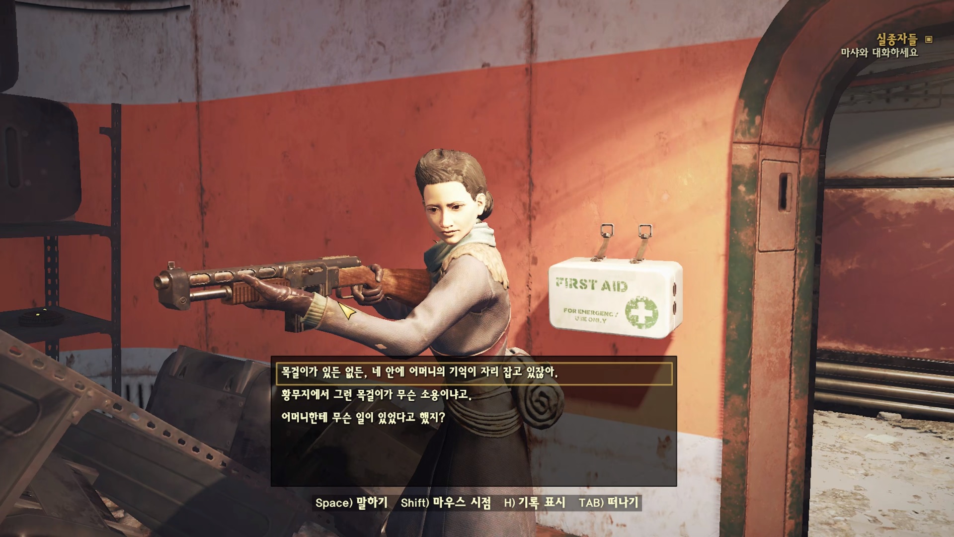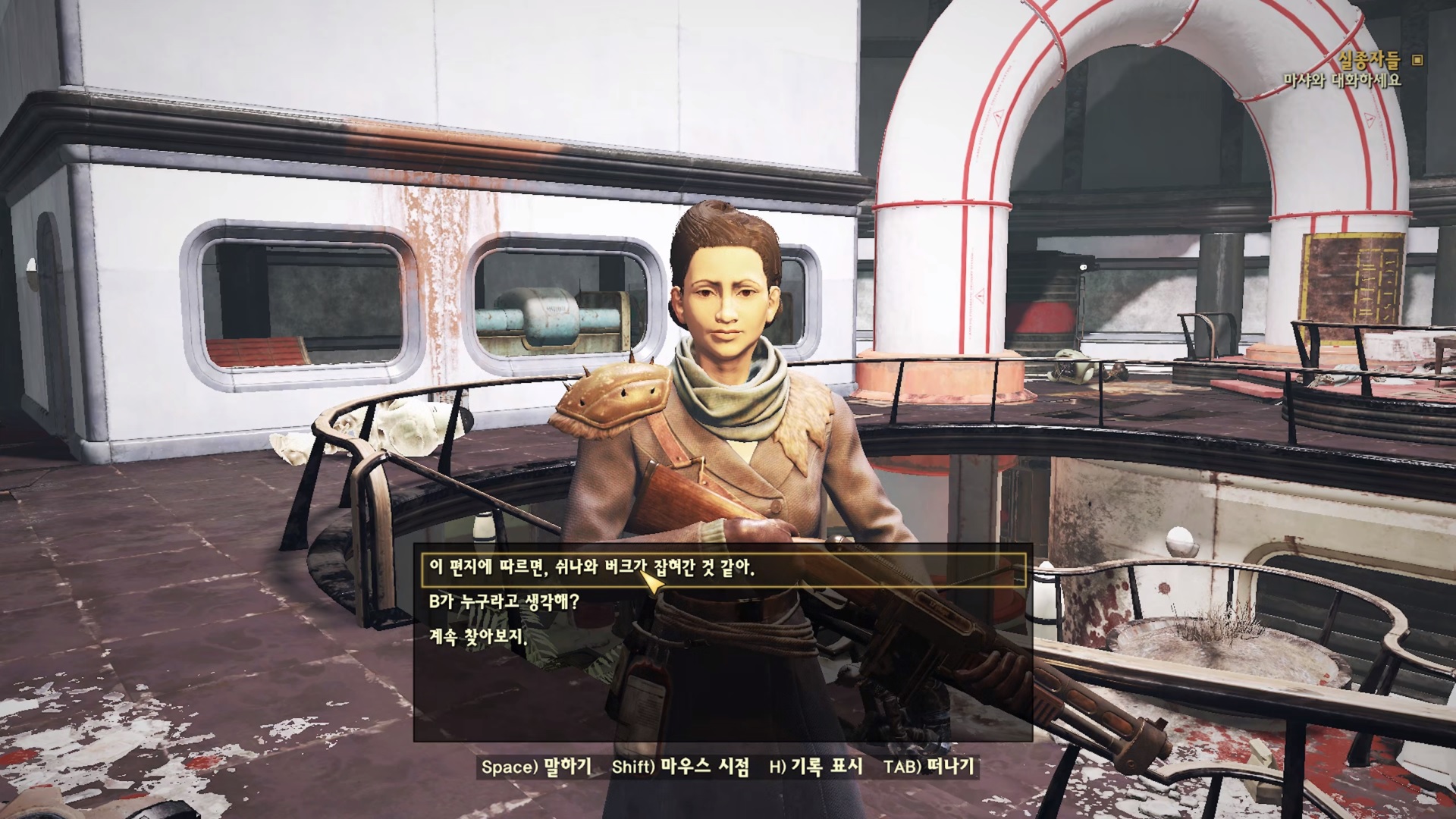 마샤가 왜 브라더후드를 싫어하는지도 알게 되는데 당시 브라더후드가 마을에 무기를 제공하지 않고 전쟁만 하지 않았다면 어머니가 죽지 않았을거라고 생각하고 있다는 것. 레이더가 원래 살인과 약탈을 밥 먹듯 하는 애들인데... 마샤는 지금 착각을 하고 있다! 악의 소굴에서 데려와야겠다.