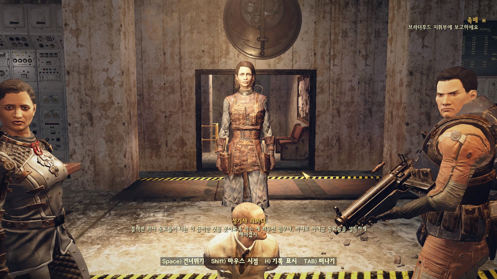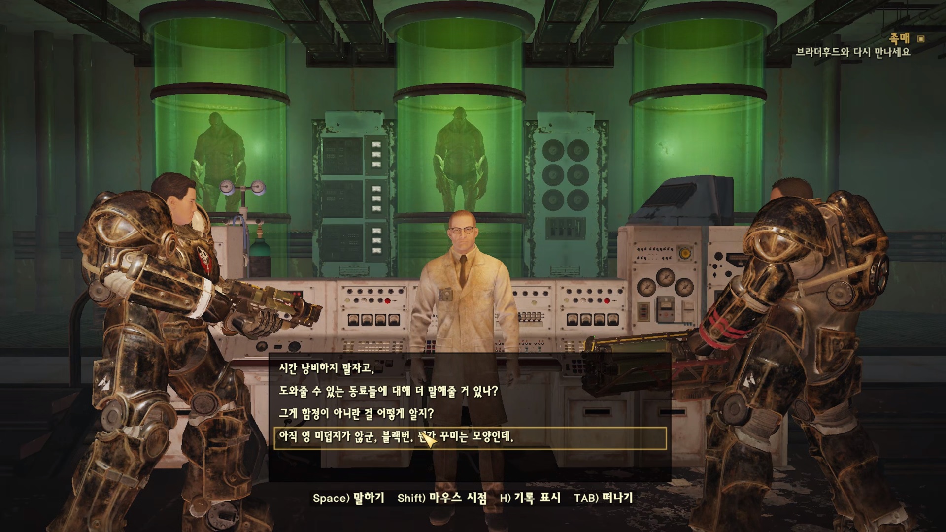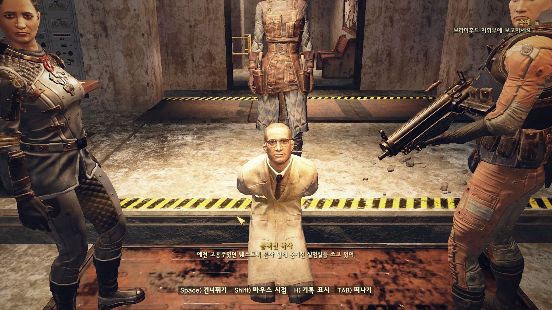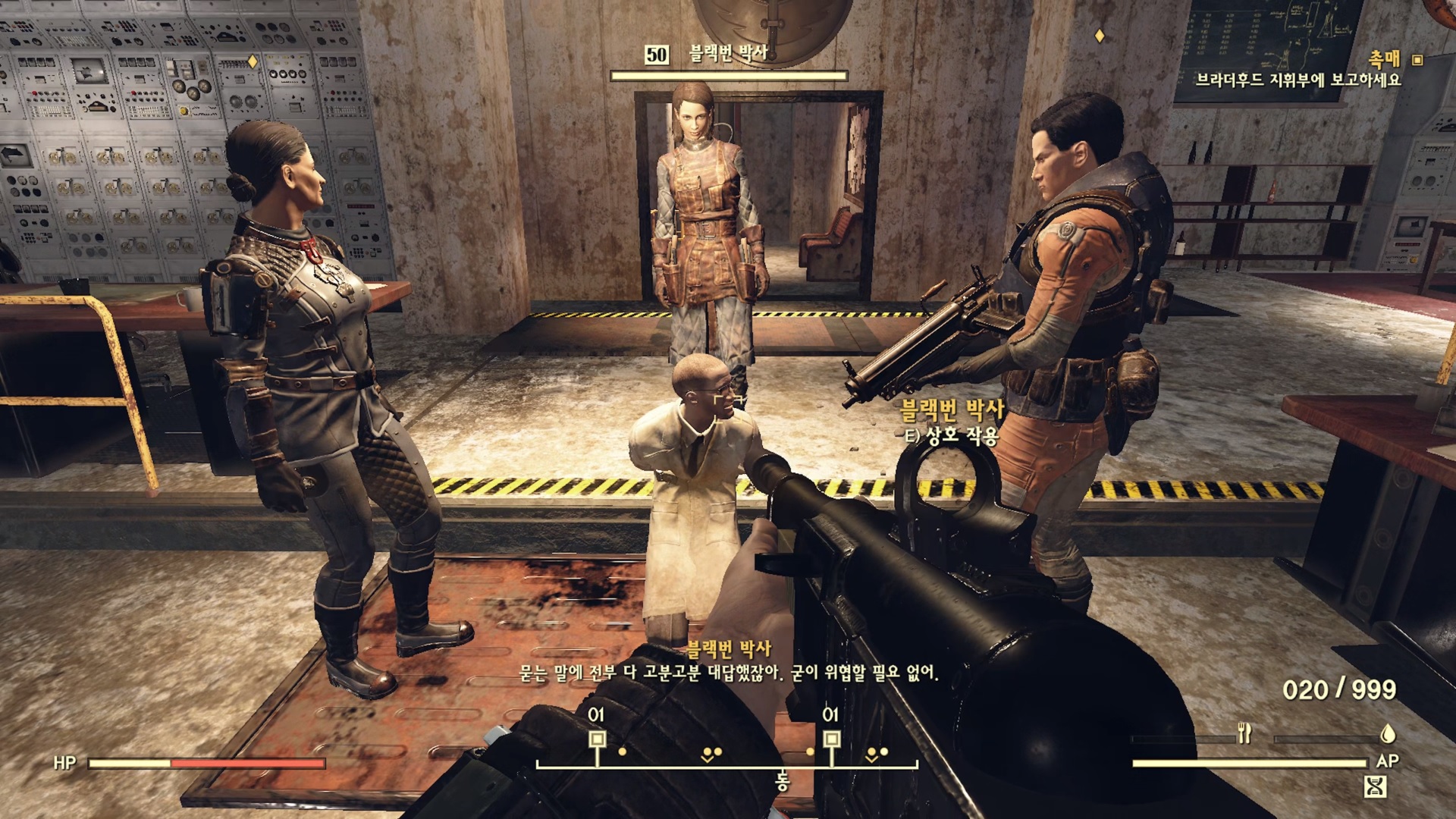 들어가자마자 바로 뒤통수 치는 블랙번. 애초에 브라더후드를 도와줬던건 자신이 직접 여기까지 올려는 심산이었던 모양. 볼트 96에서 반항했던간 죽었을테니깐 도와주는 척해서 브라더후드를 보디가드 마냥 데리고 다녔던 것이다. 빌런 답네.