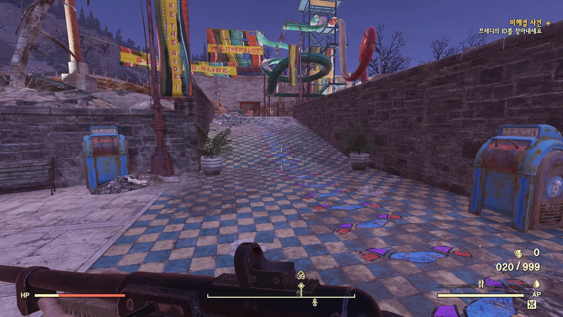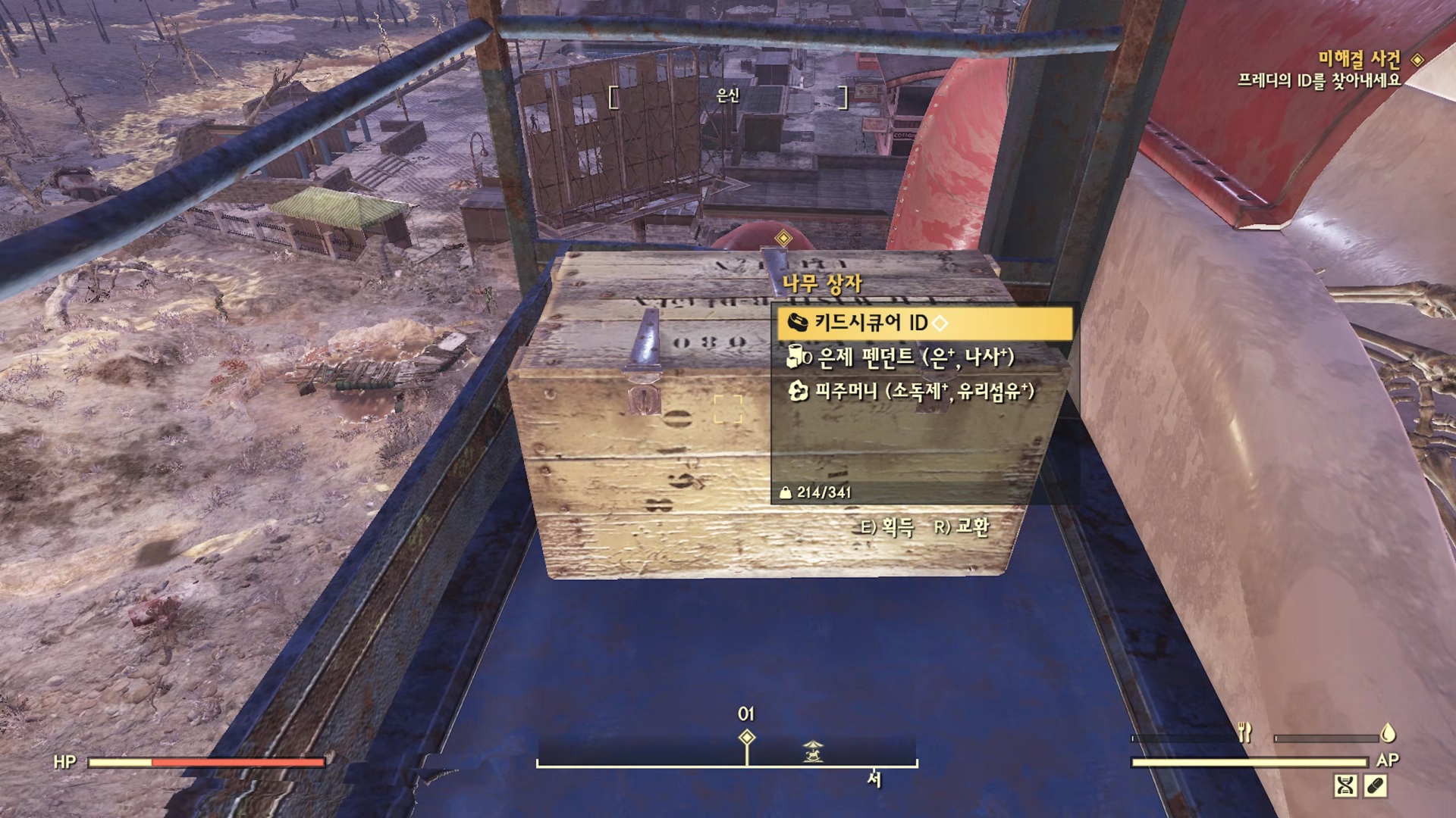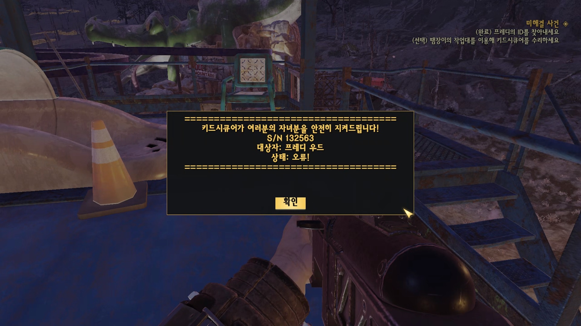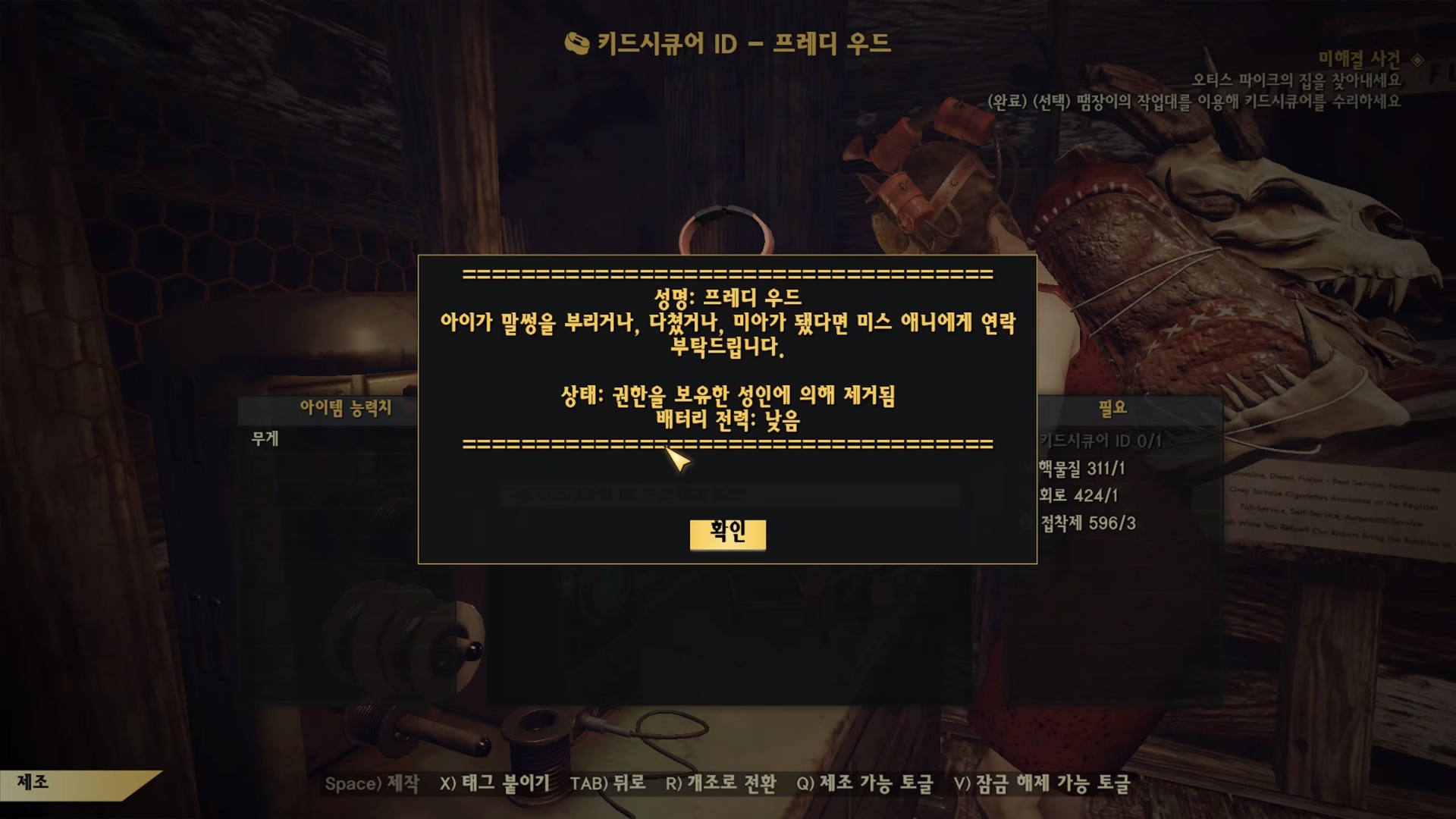 크래프턴 댐에 땡장이 작업대가 있다는걸 몰랐을때라 크레이터에서 프레디의 키드시큐어를 수리했다. 퀘스트에 큰 영향을 주는건 아닌 모양이다.