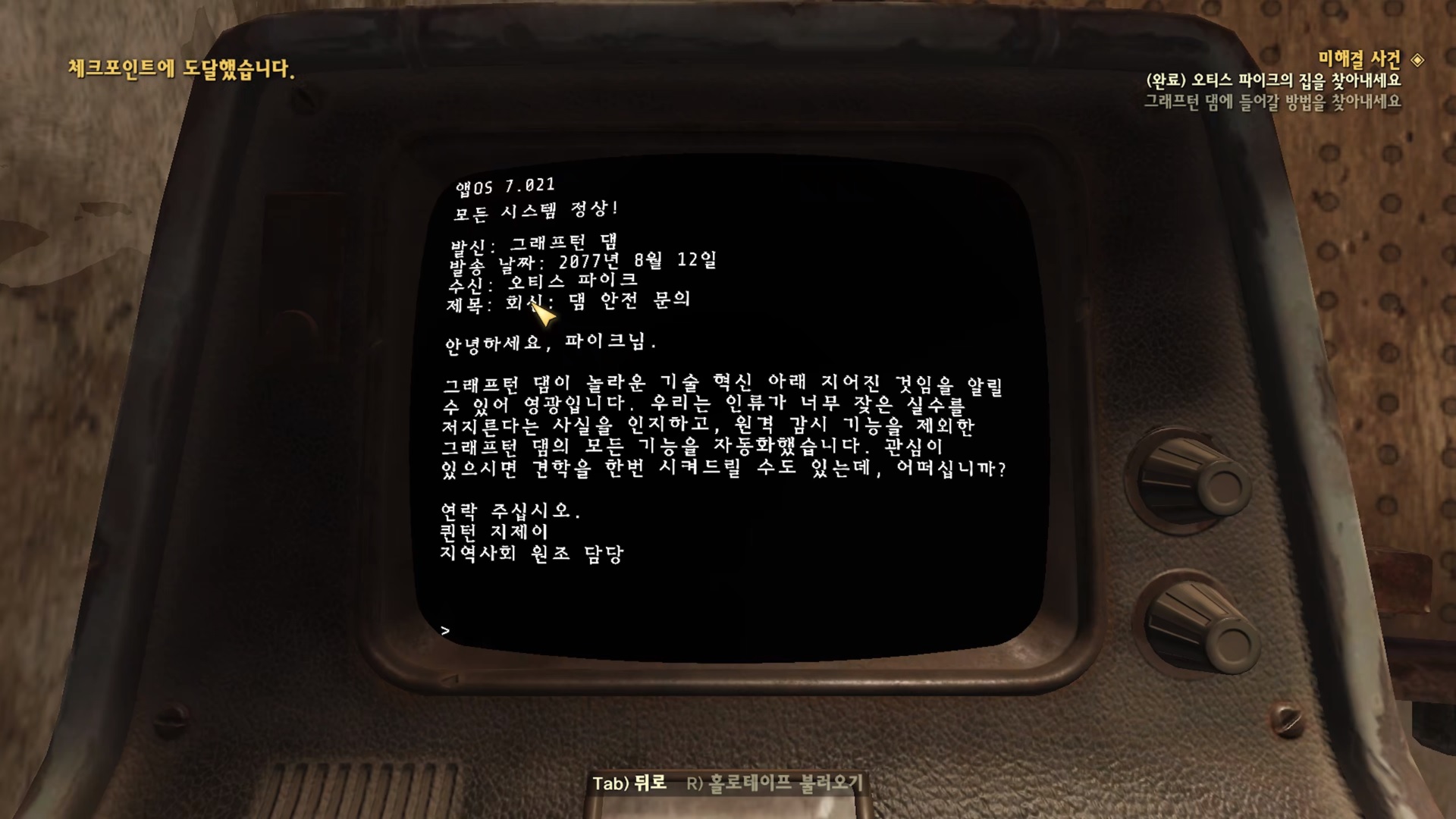 크래프턴 댐으로 가면 슈퍼 뮤턴트들이 지키고 있고 문은 모두 잠겨 있다.