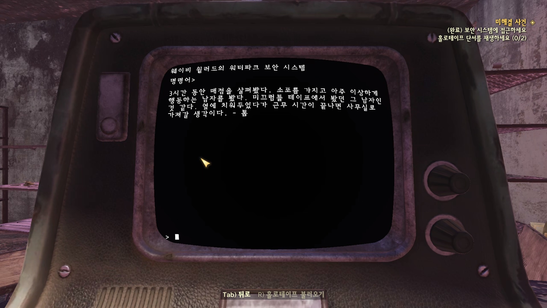 단말기에 접속해 '홀로테이프 조사 => 10월 23' 자를 조사하면 홀로테이프 단서를 재생하라고 한다.