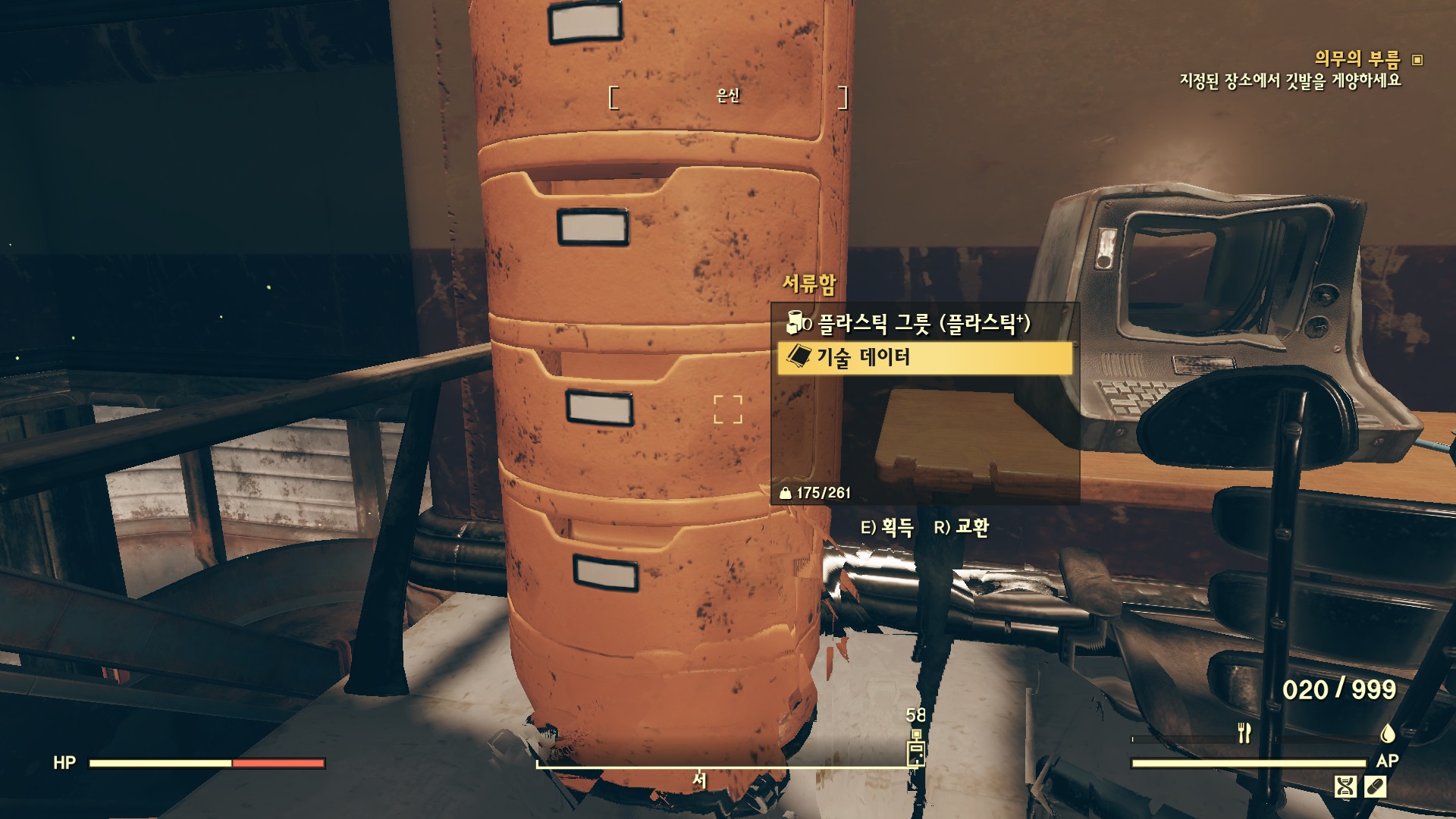 '디파이언스의 몰락 (Defiance Has Fallen)' 퀘스트를 완료하고 나면 서류함이나 상자 등에서 '기술 데이터'라는 것을 얻게 된다. 이걸 반납하면 경험치와 캡을 준다. 반납할때 가지고 있는걸 전부 다 주게 되는데 2개 이상일 경우 전설 아이템을 줄 확률도 있다. 하지만 확률이 너무 미미하다.