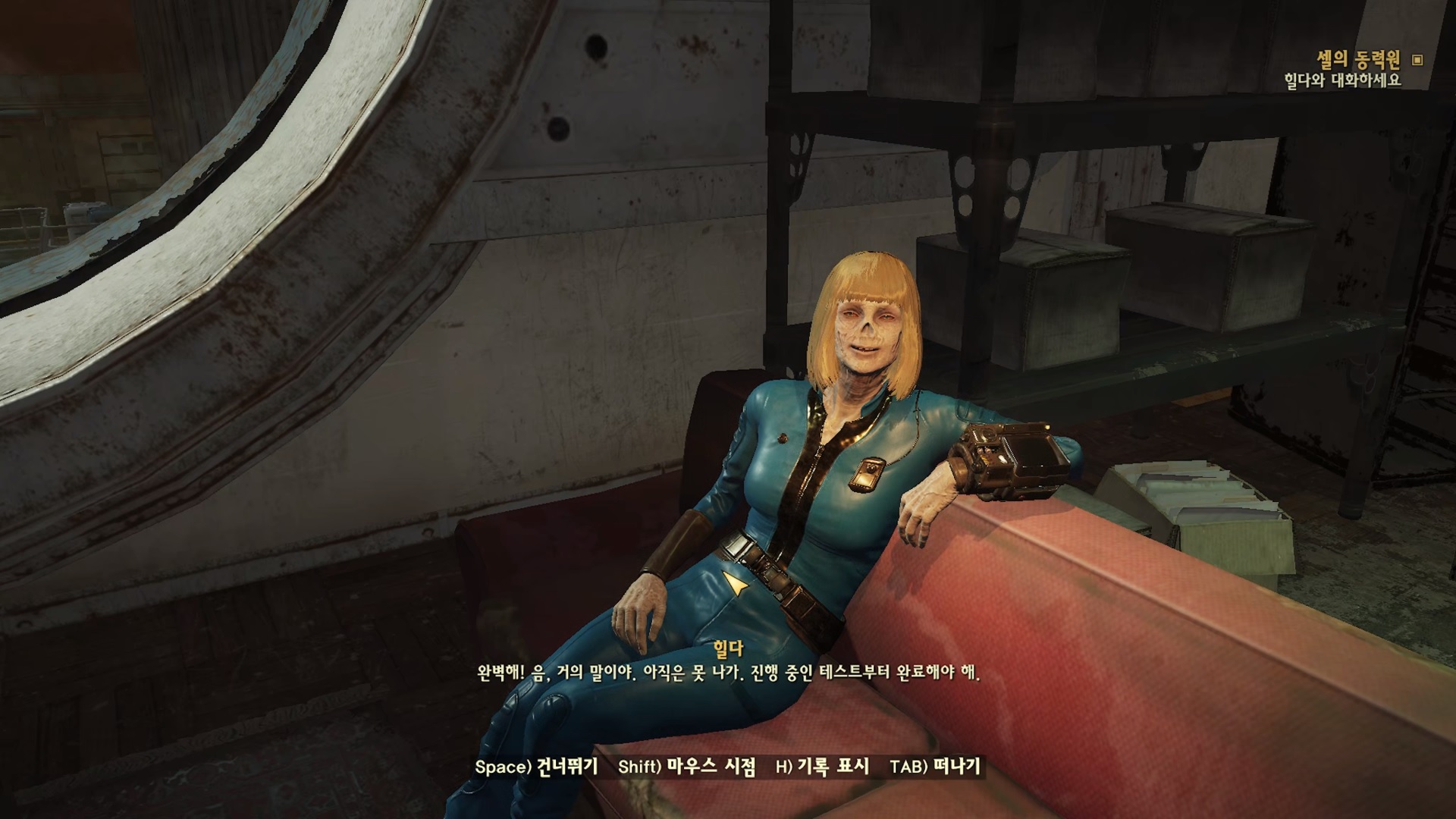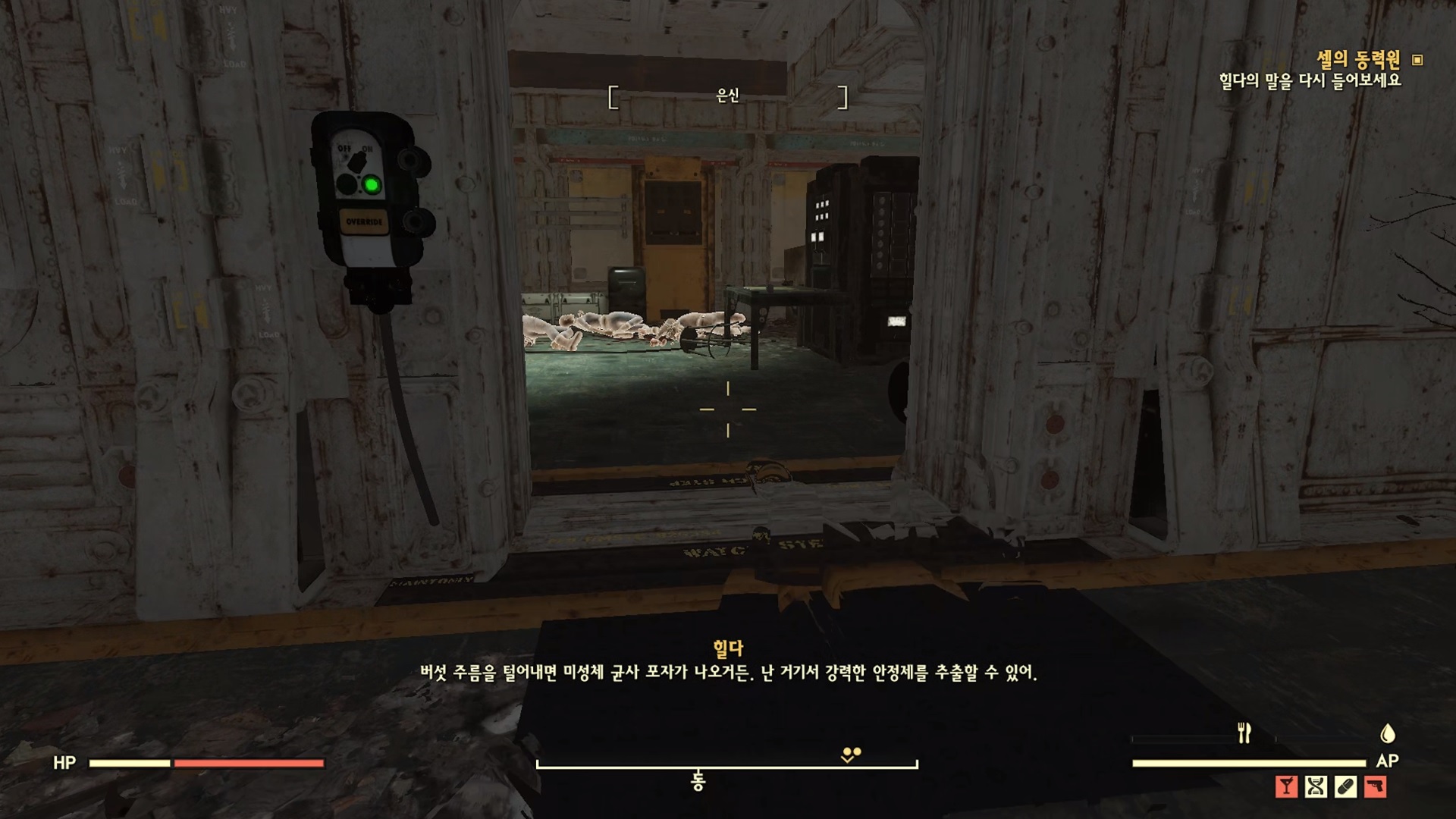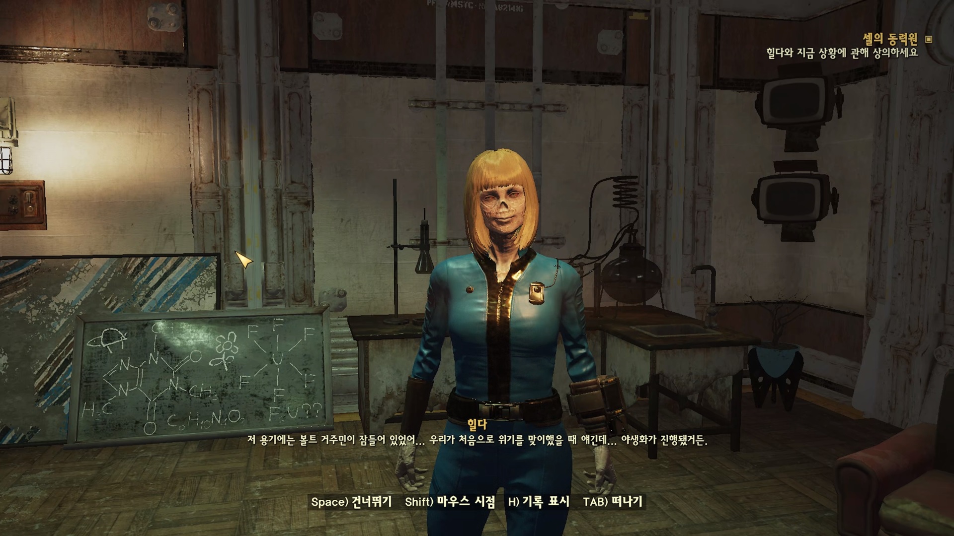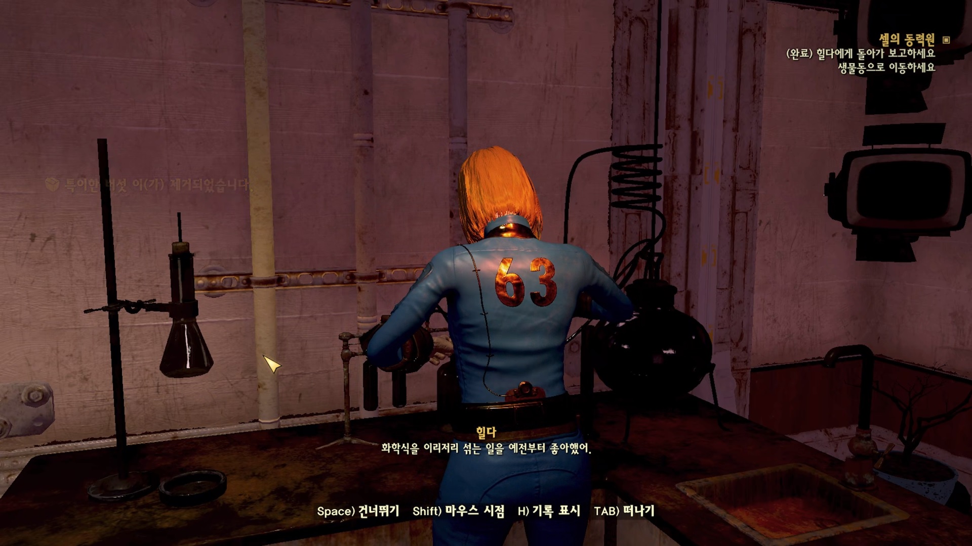원래 저 용기에는 볼트 거주민들이었으나 위기 후 야생화가 되어버렸다는 것. 위기는 전쟁을 말하는 것 같다. 볼트 63 자체가 건축이 늦어지는 바람에 전쟁으로 인한 피해를 직격탄으로 맞아버렸기 때문. 야생화를 늦추기 위해 볼터 거주민을 상대로 실험이 시작했고 힐다의 아버지 역시 자원해서 실험 대상자가 되었지만 그것이 마지막 실험이었다. 그걸 힐다가 이어 받아서 시작한 듯.