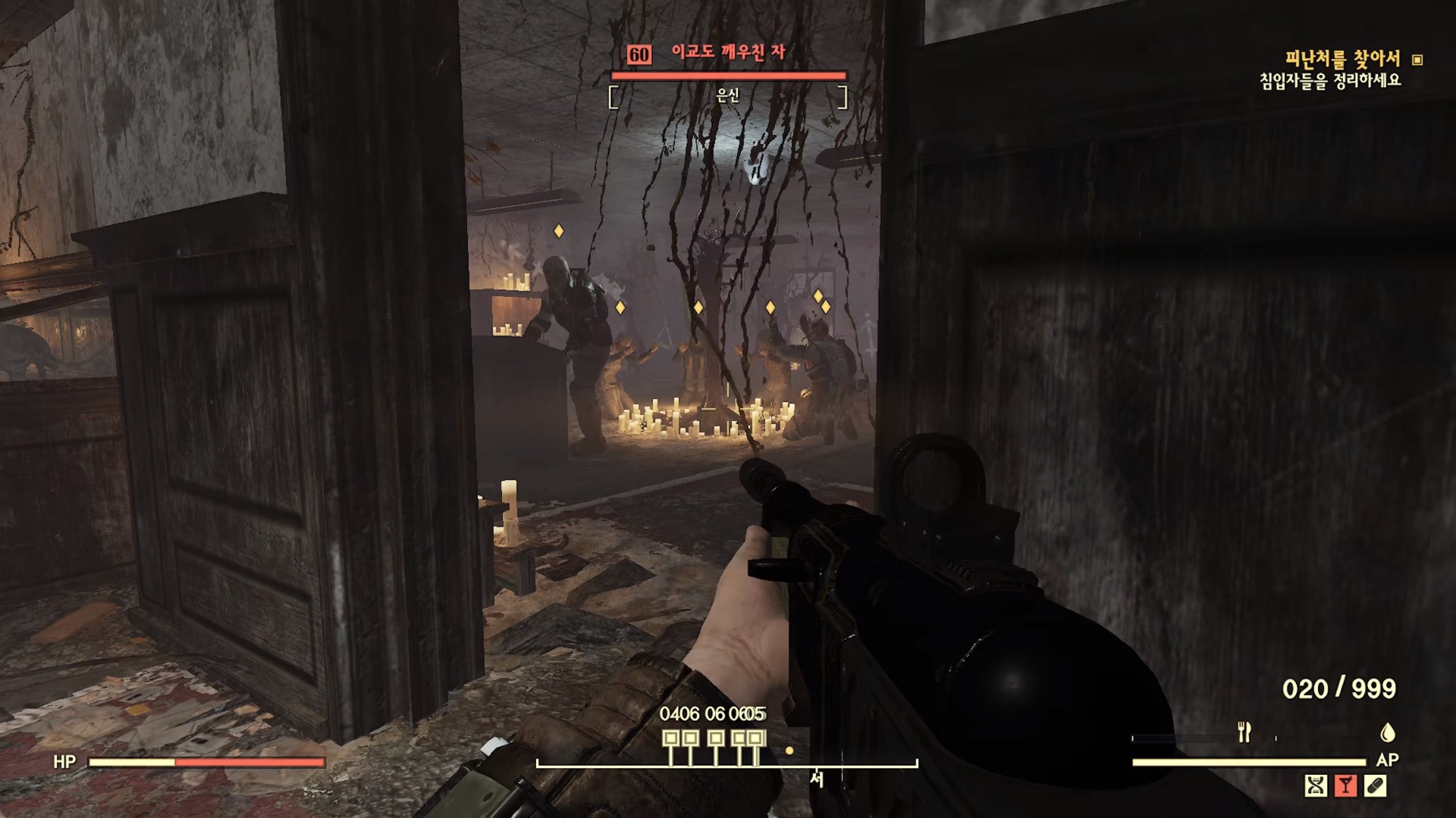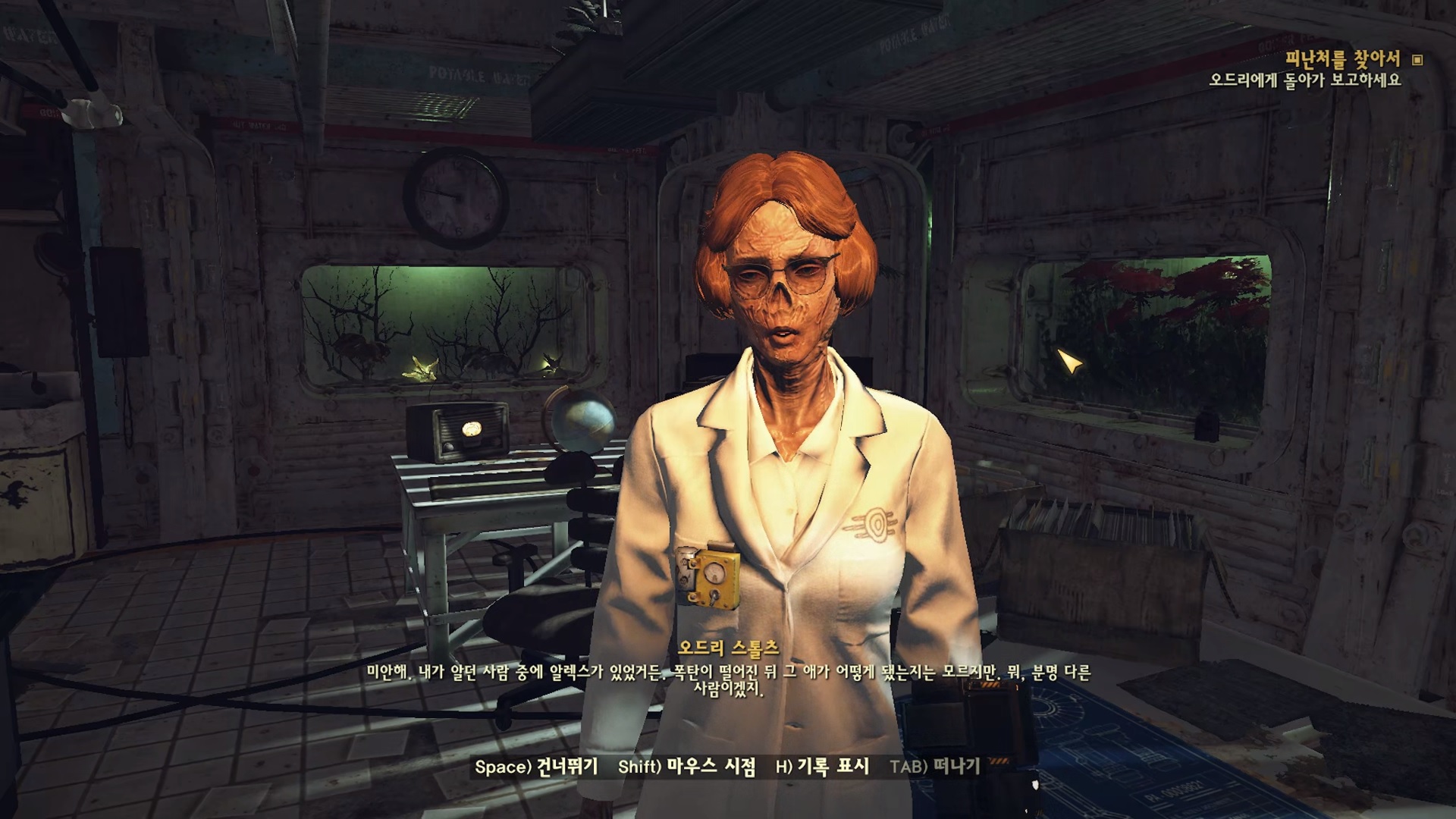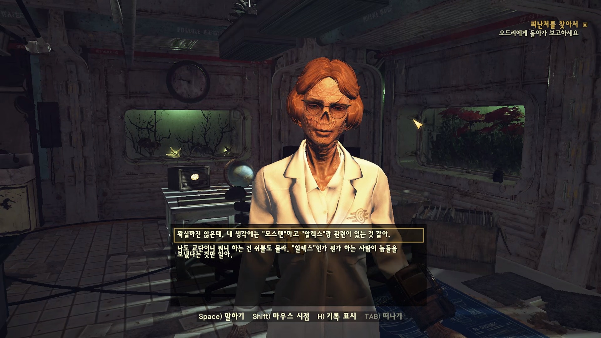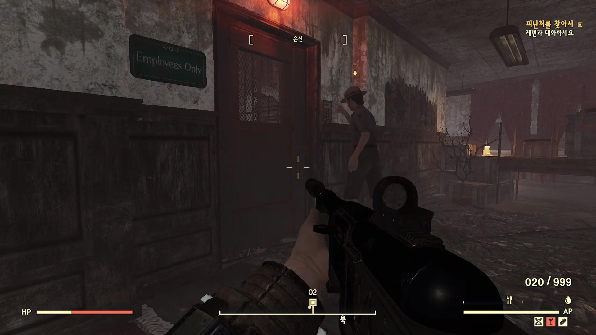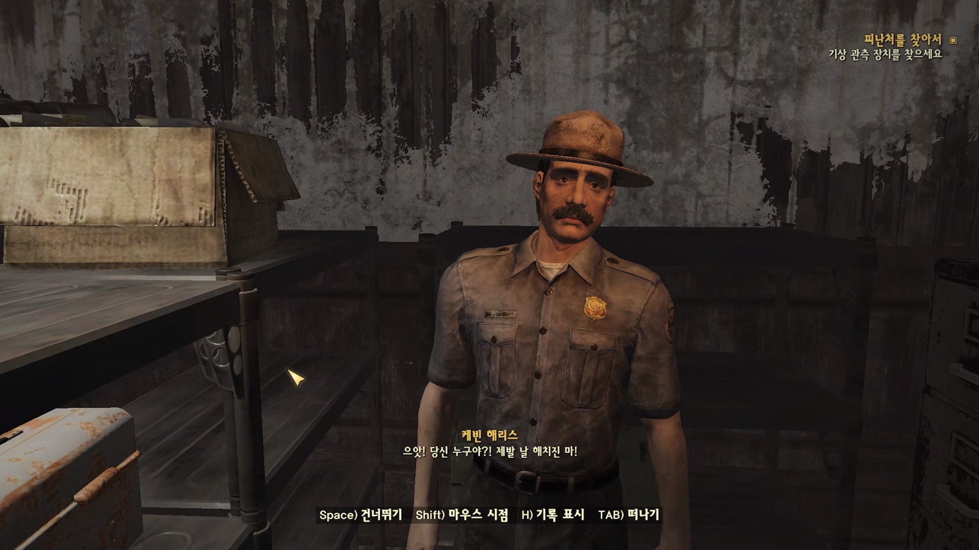 셰난도어 방문객 센터에 들어가면 케빈이 있다. 날씨 관측 장치는 자기 방공호에 있는데 나왔다가 안에서 문지 잠기는 바람에 못 들어가는 중. 그래서 비밀 통로로 갈려고 하니 이번엔 알렉스가 보낸 왠 이교도가 설치고 있다고 한다. 이교도를 처치하러 가자.