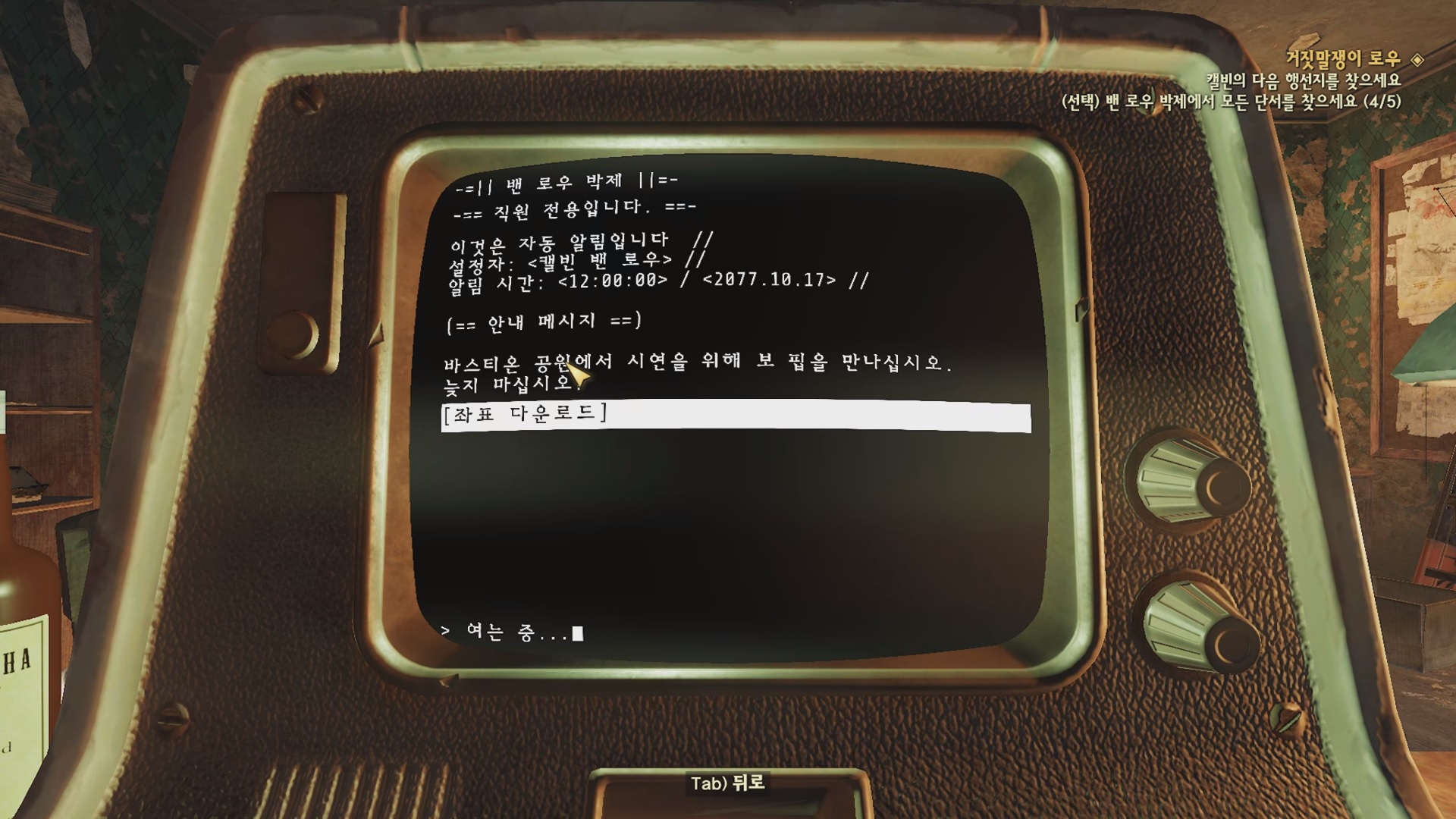 그러면 바스티온 공원에서 시연을 위해 보 핍을 만나라는 내용이 나온다. '좌표 다운로드'를 선택하면 퀘스트가 완료 되고 '매애애 매애애 블랙쉽 (Baa Baa Black Sheep)'으로 이어진다.