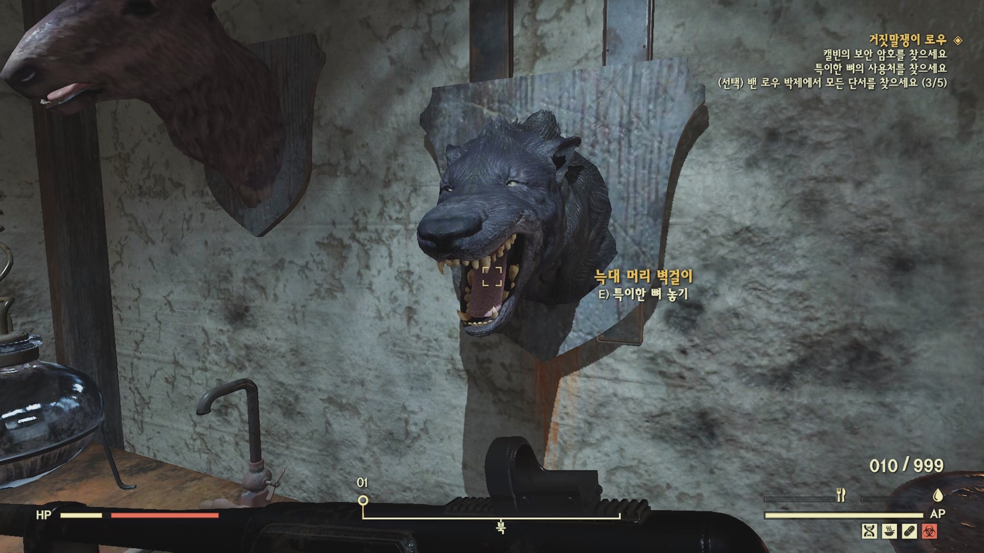 아까 줏은 특이한 뼈를 살펴보면 이렇게 이빨 자국 같은게 있다. 지하실 벽쪽에 '늑대 머리 벽걸이'의 입 부분에 이 특이한 뼈를 놓을 수 있다.