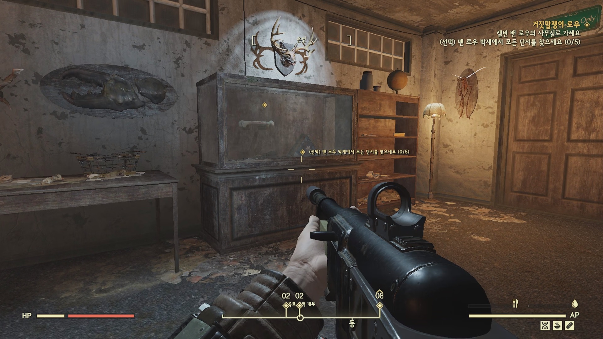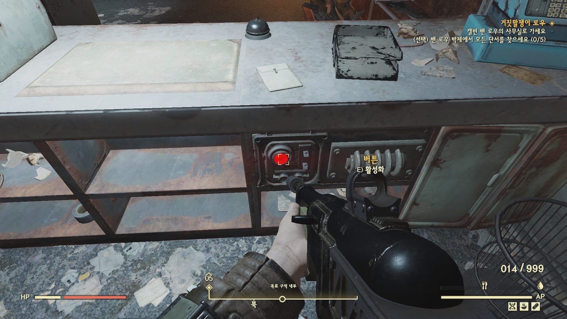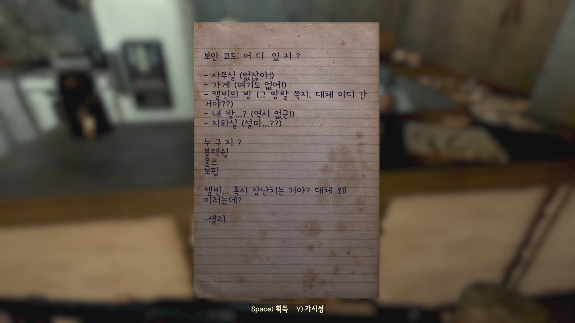 먼저 바로 앞에 보이는 진열장의 단서 2개는 선을 쭉 따라가보면 알겠지만 카운터 뒤쪽에 버튼이 있다. 이걸 누르면 열린다.