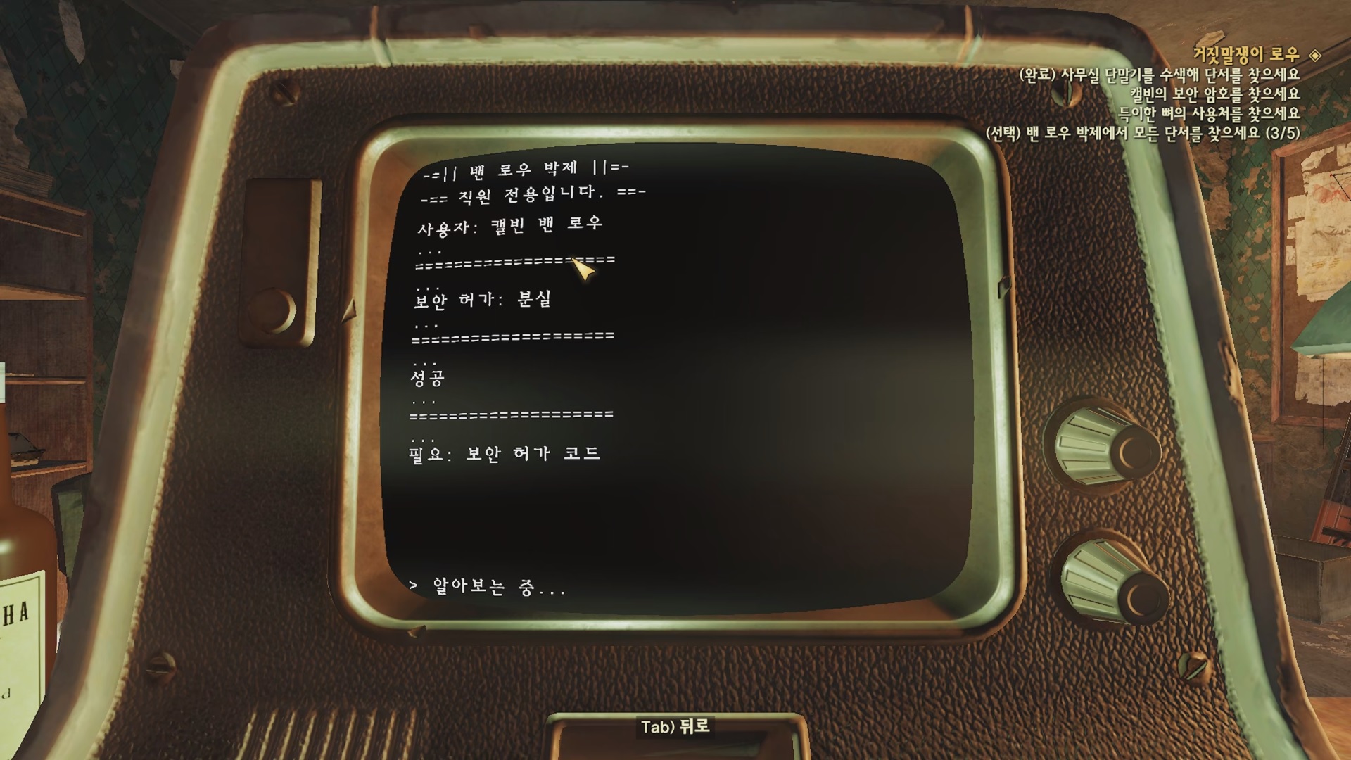 다시 3층의 단말기에 접속해서 '연구 - 보안 암호 필요 => 연구 프로젝트, 2077 => 기록 : 보핍을 만나자'를 선택한다.