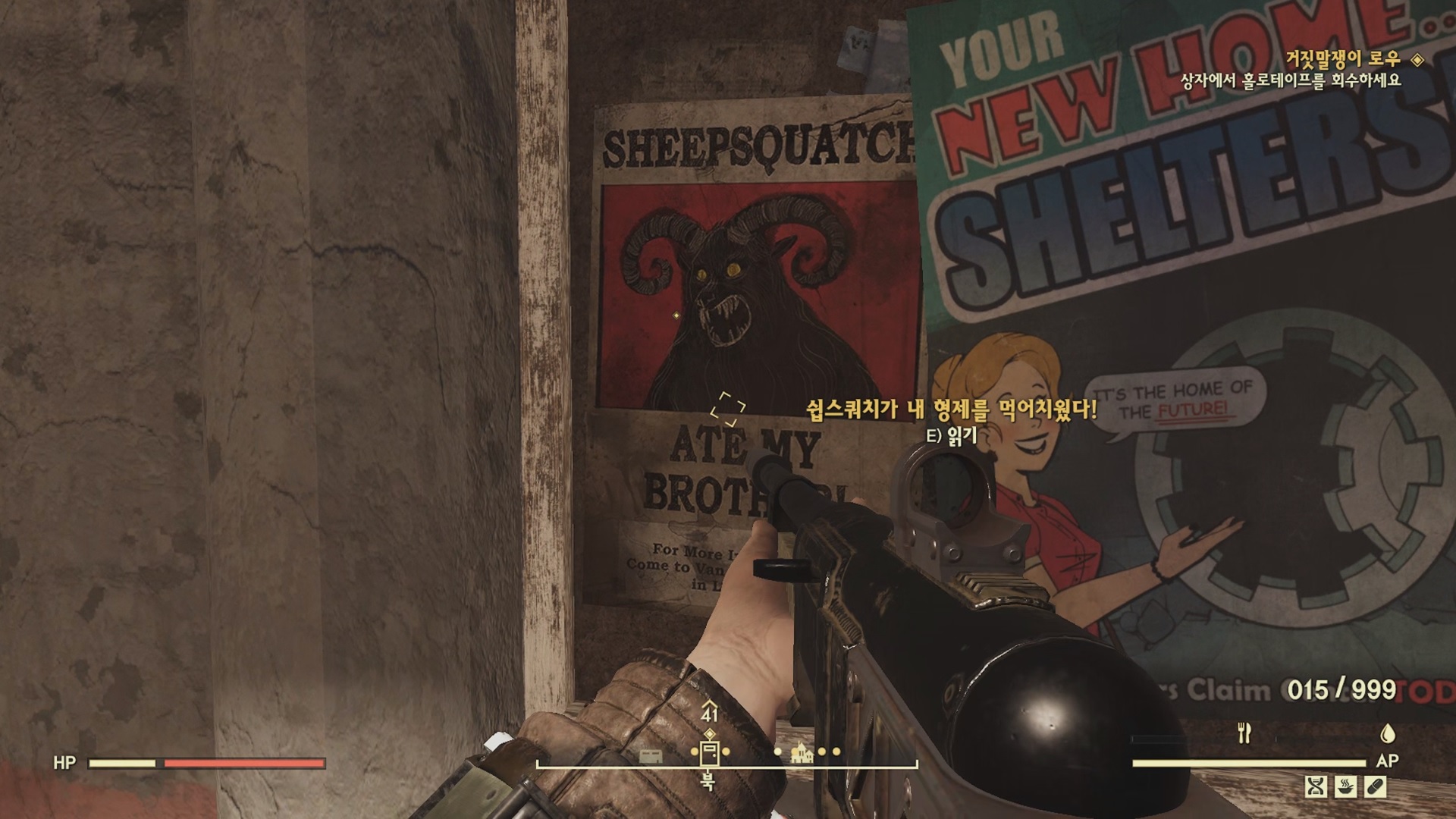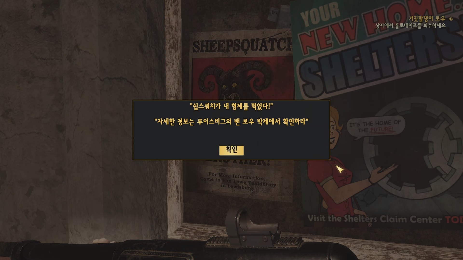 루이스버그 기차역, 루이스버그 전역에 보면 이렇게 '쉽스쿼치가 내 형제를 먹었다!'라는 포스트를 찾을 수 있다. 포스트를 읽게 되면 퀘스트가 시작된다.